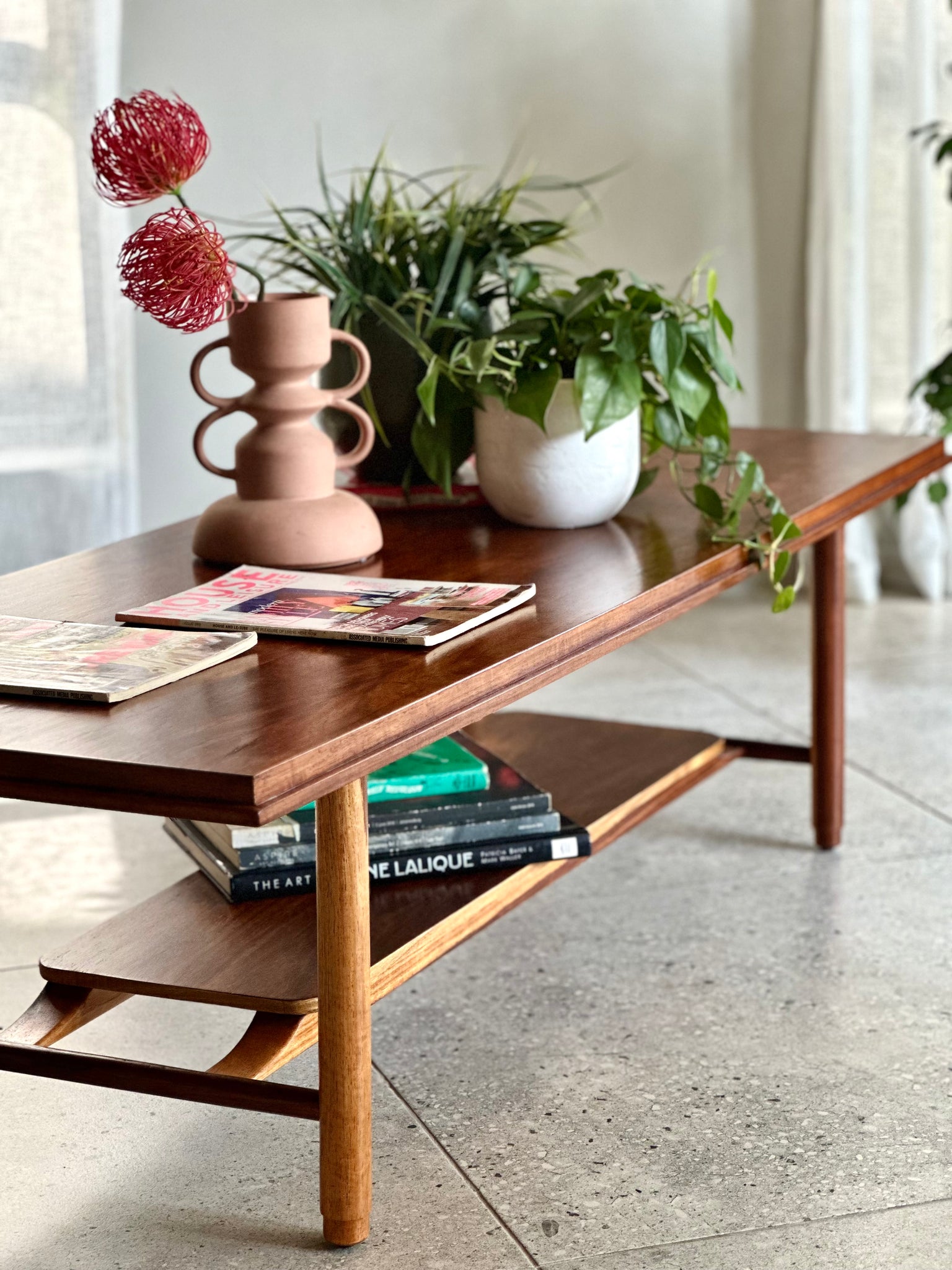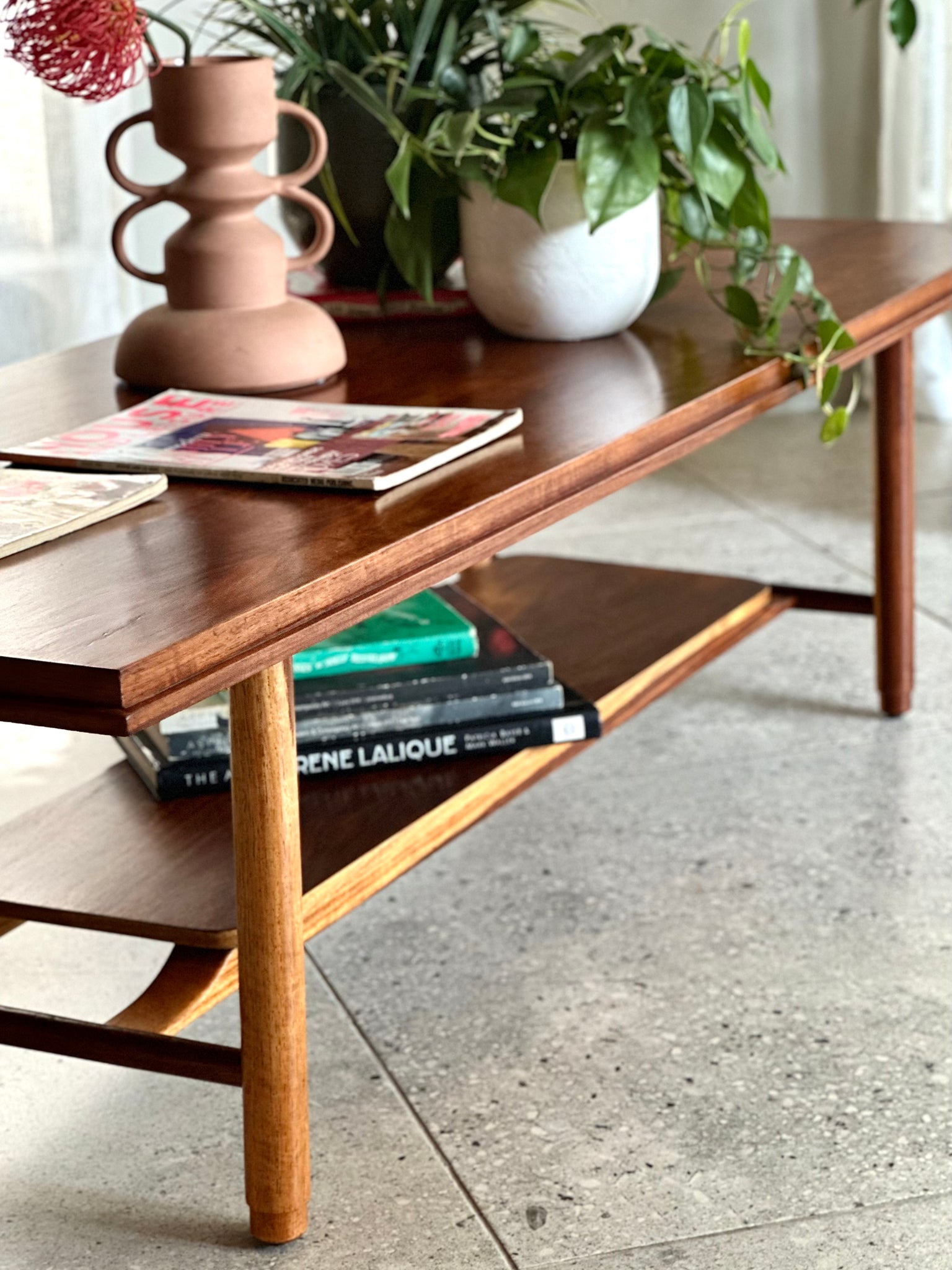 A classic mid-century coffee table with two tiers. Edged top to add interest and a second tier with good design detail. Notice the curves from the leg base to the second tier and the wood grain variation on the leg base. The simplistic lines make it a great piece for most interior spaces. A great complementary lounge piece! Quite long in width.