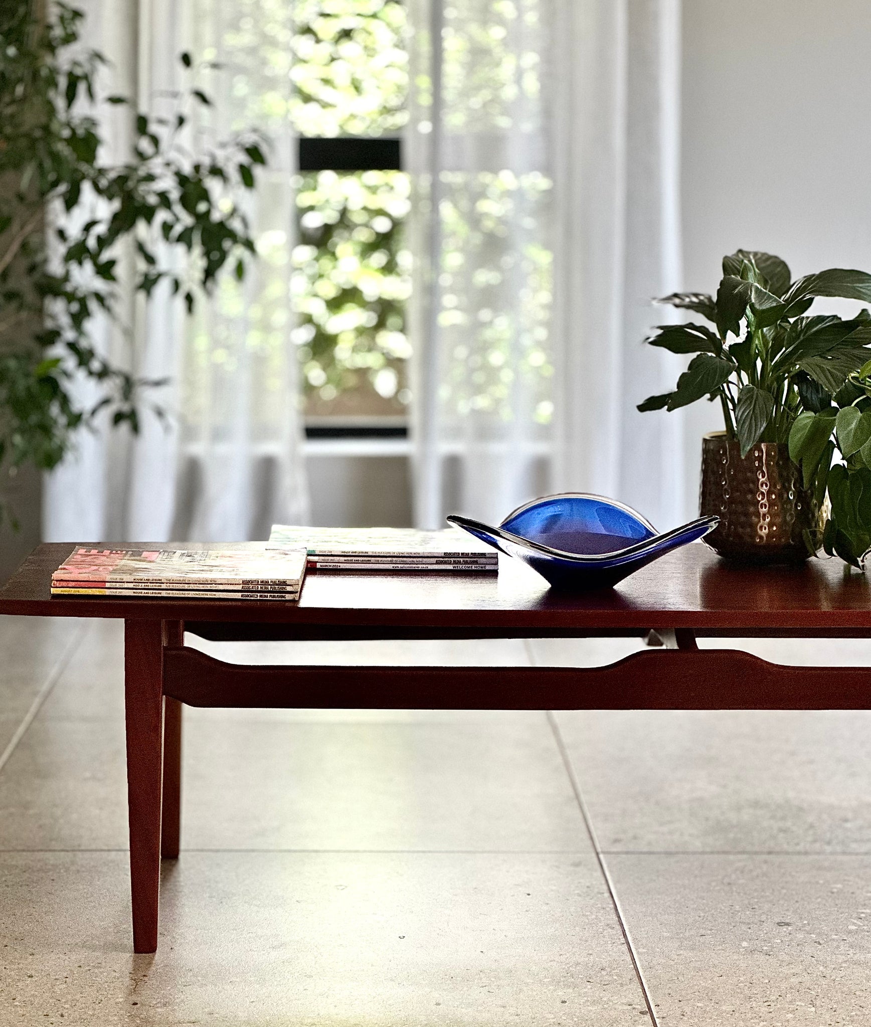 A charming Mahogany coffee table with sleek lines and a slightly surfboard-style top. The table top has been refurbished with brand-new Mahogany solid wood veneer, while the base and legs are solid Mahogany. Notice the good design on the base and the woodgrain.