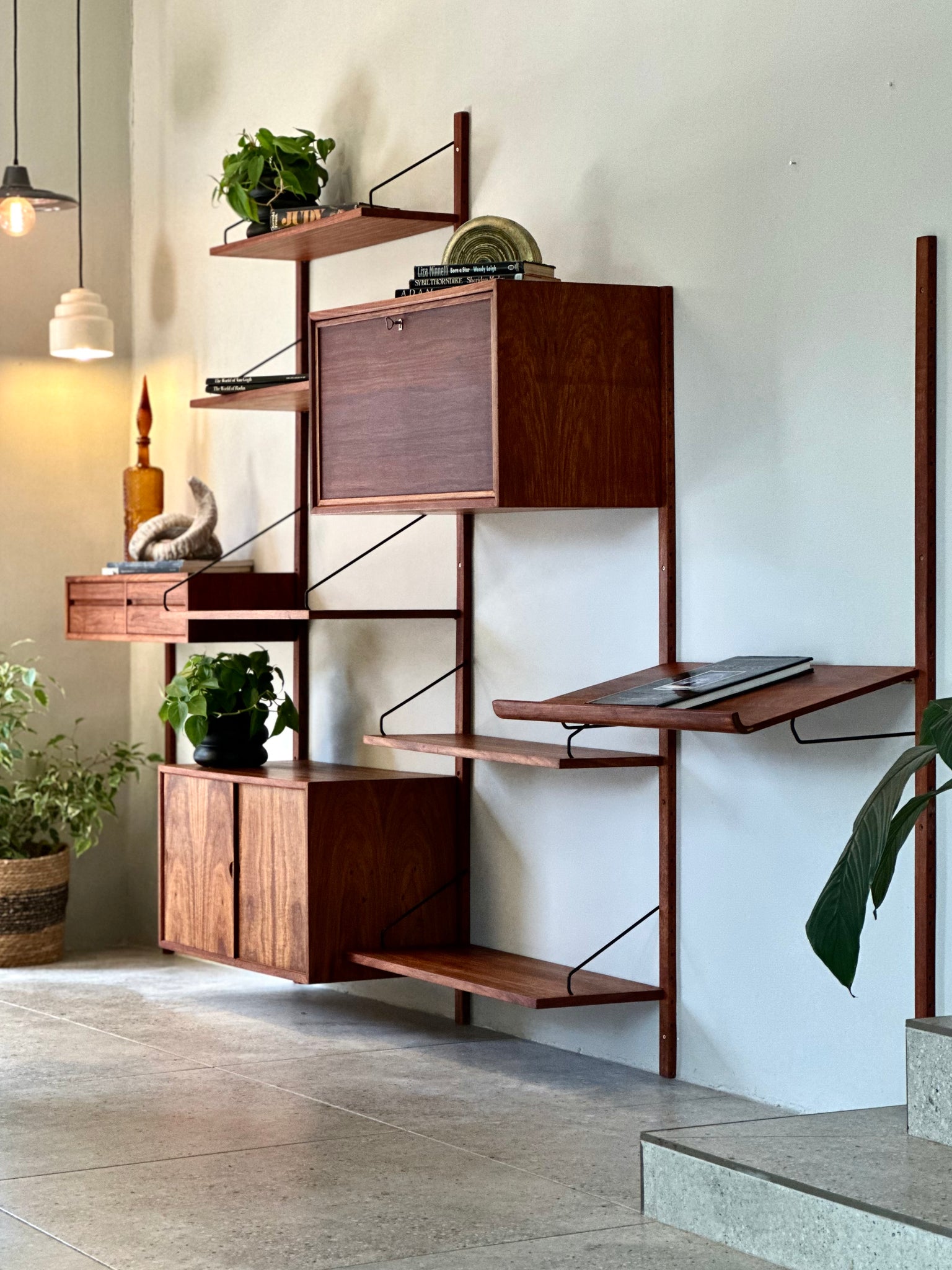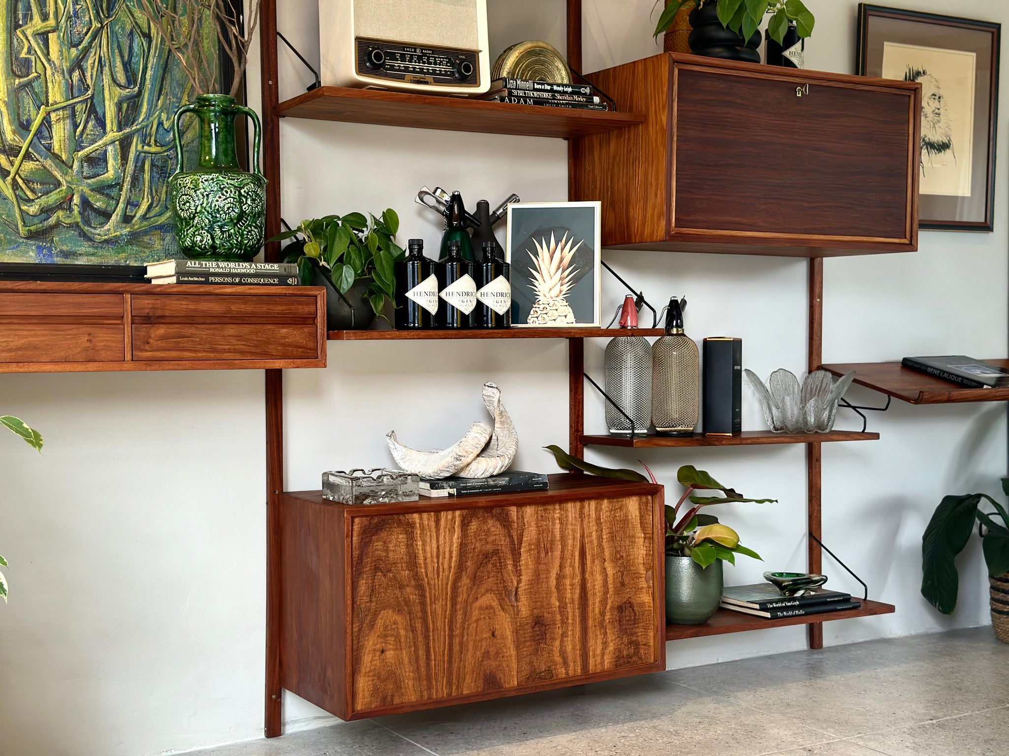The adjustable nature of the wall unit allows for a customized arrangement of cabinets and shelves, providing both practical storage solutions and a visually appealing display. --The unit has 5 shelves, an angled lip-shelf, a cabinet with a drop front door, another cabinet with wooden sliding doors adorned with half-moon-shaped sculpted handles, and a two-drawer unit. reflecting the attention to detail and craftsmanship characteristic of Cadovius' work. The half-moon-shaped handles on the cabinet add a distinctive touch, showcasing the design flair of Poul Cadovius.