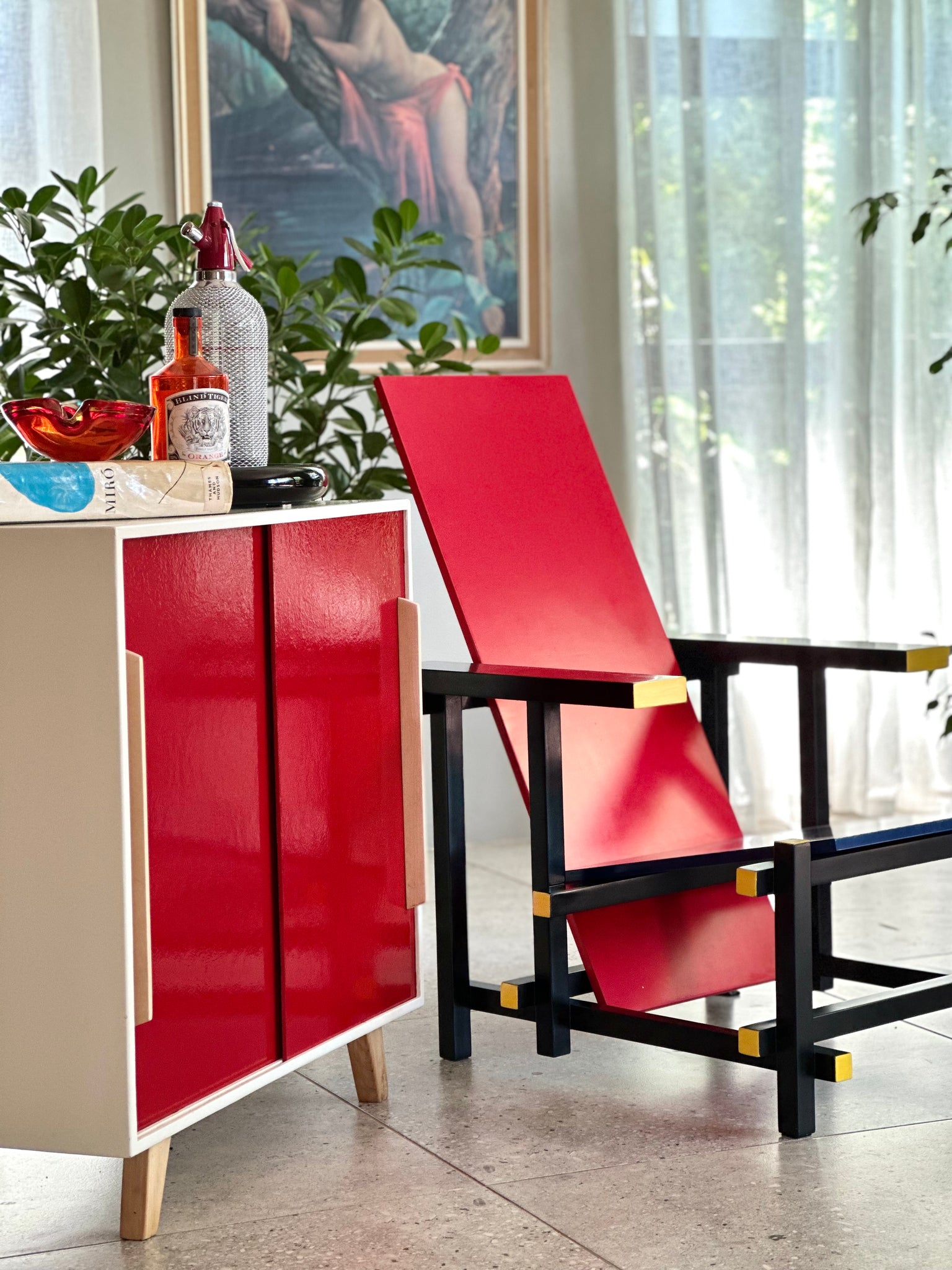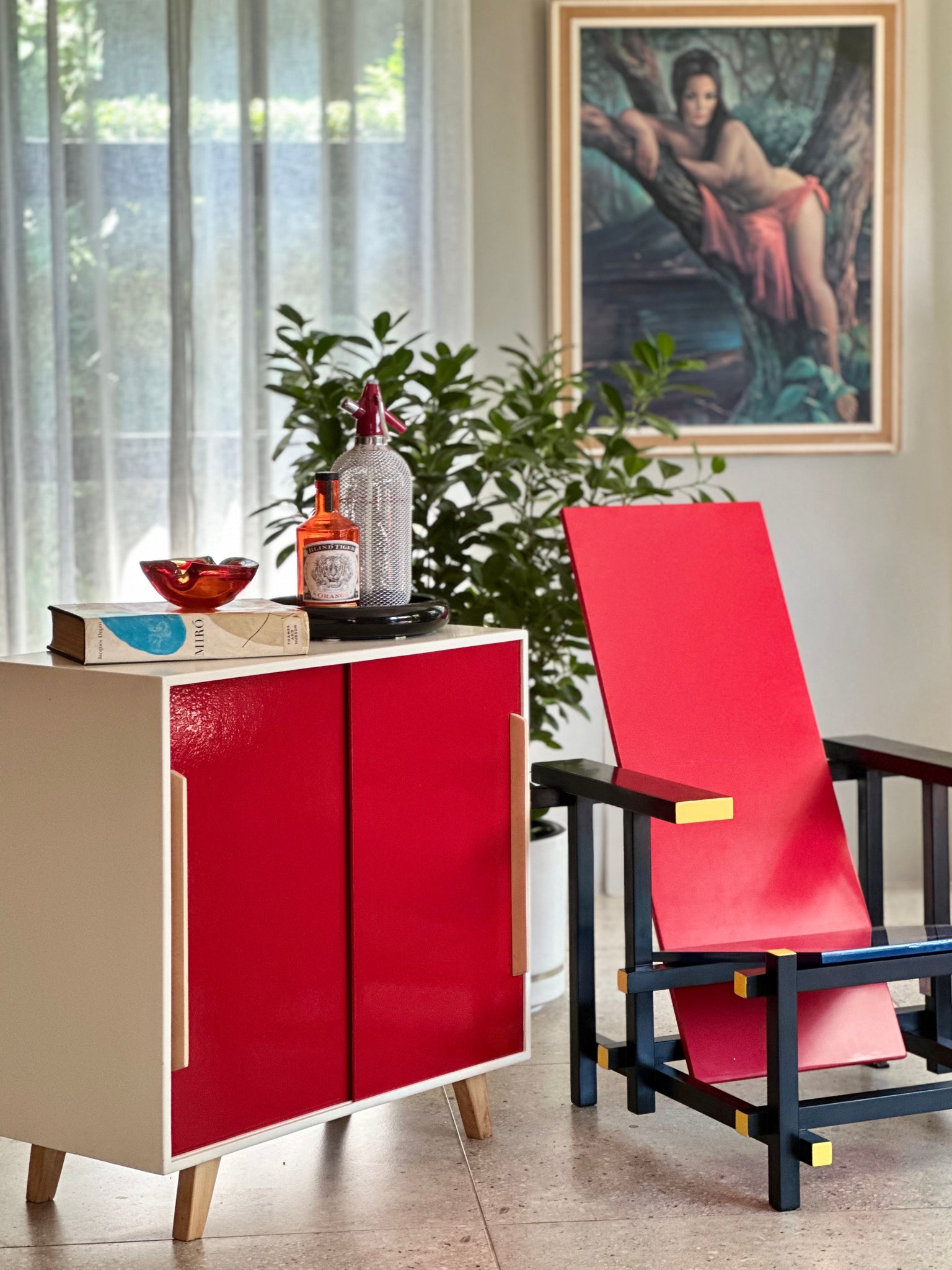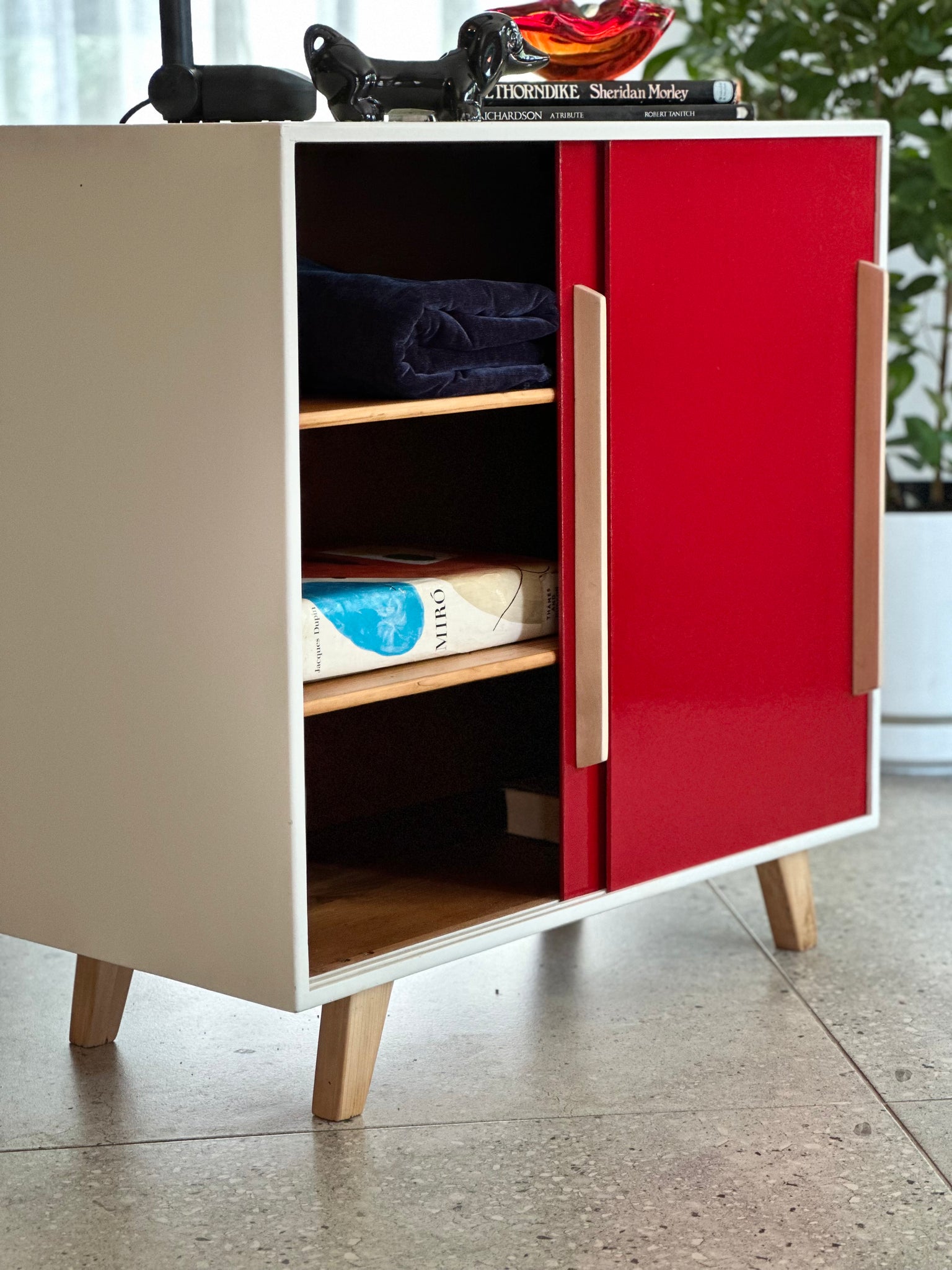 This small cabinet/sideboard, dating to circa 1950s and likely manufactured by Stella Möbel in Zurich, Switzerland, captures the playful sophistication of mid-century European design. Its freshly painted red sliding doors echo the cabinet’s original colourway, while the sides and top have been refinished in an off-white coat, giving the piece a refreshed, contemporary flair without losing its retro soul.