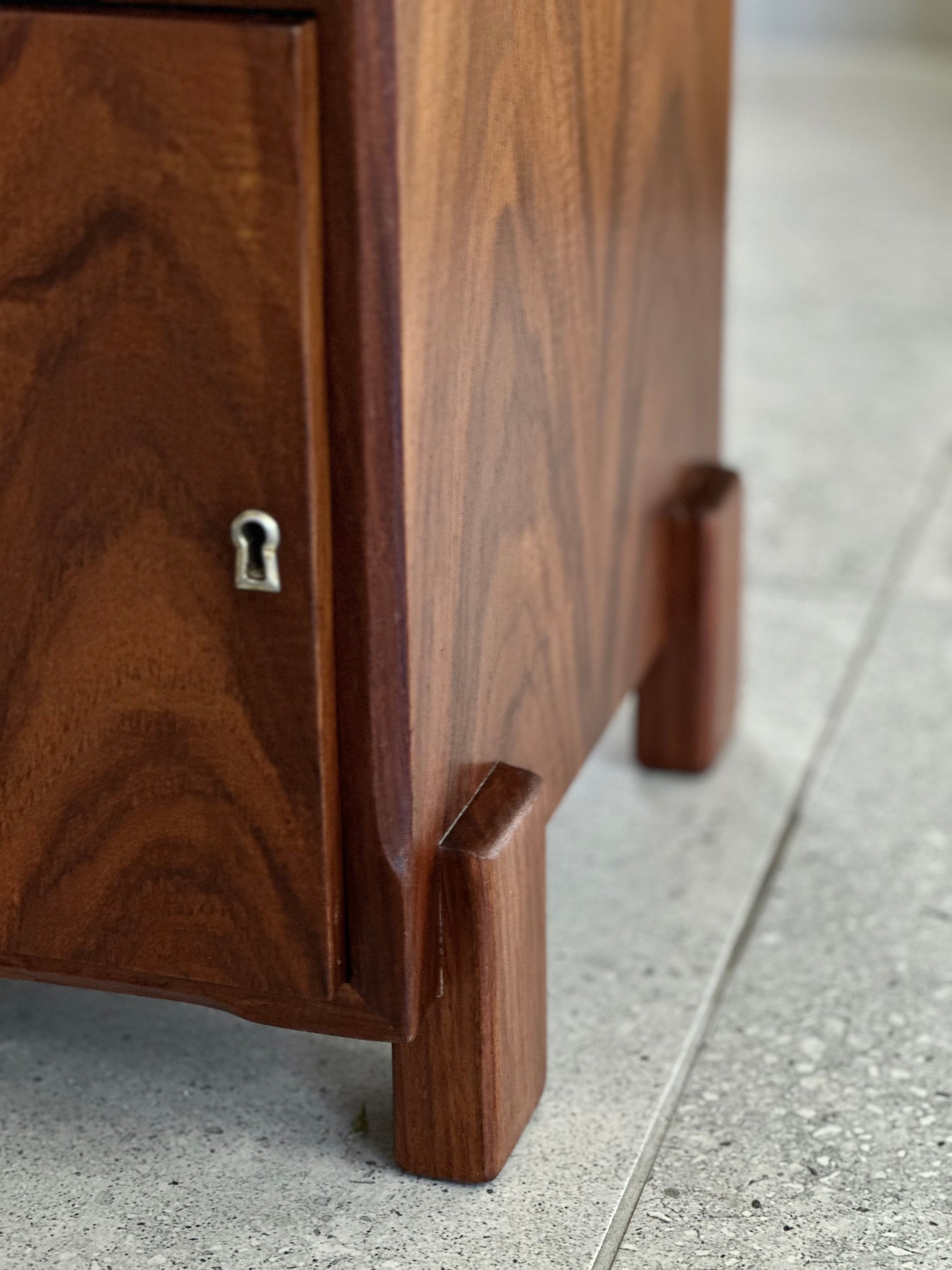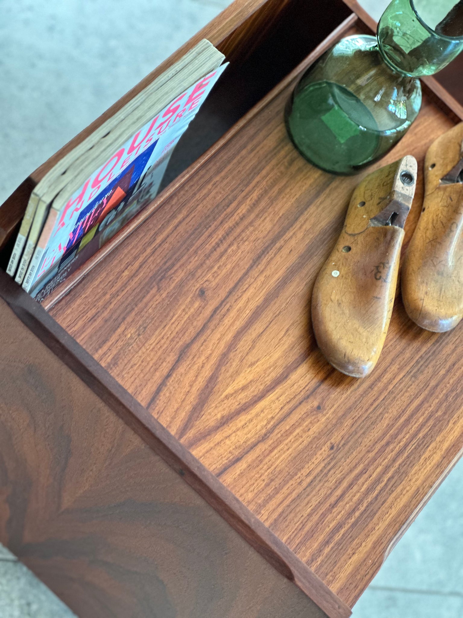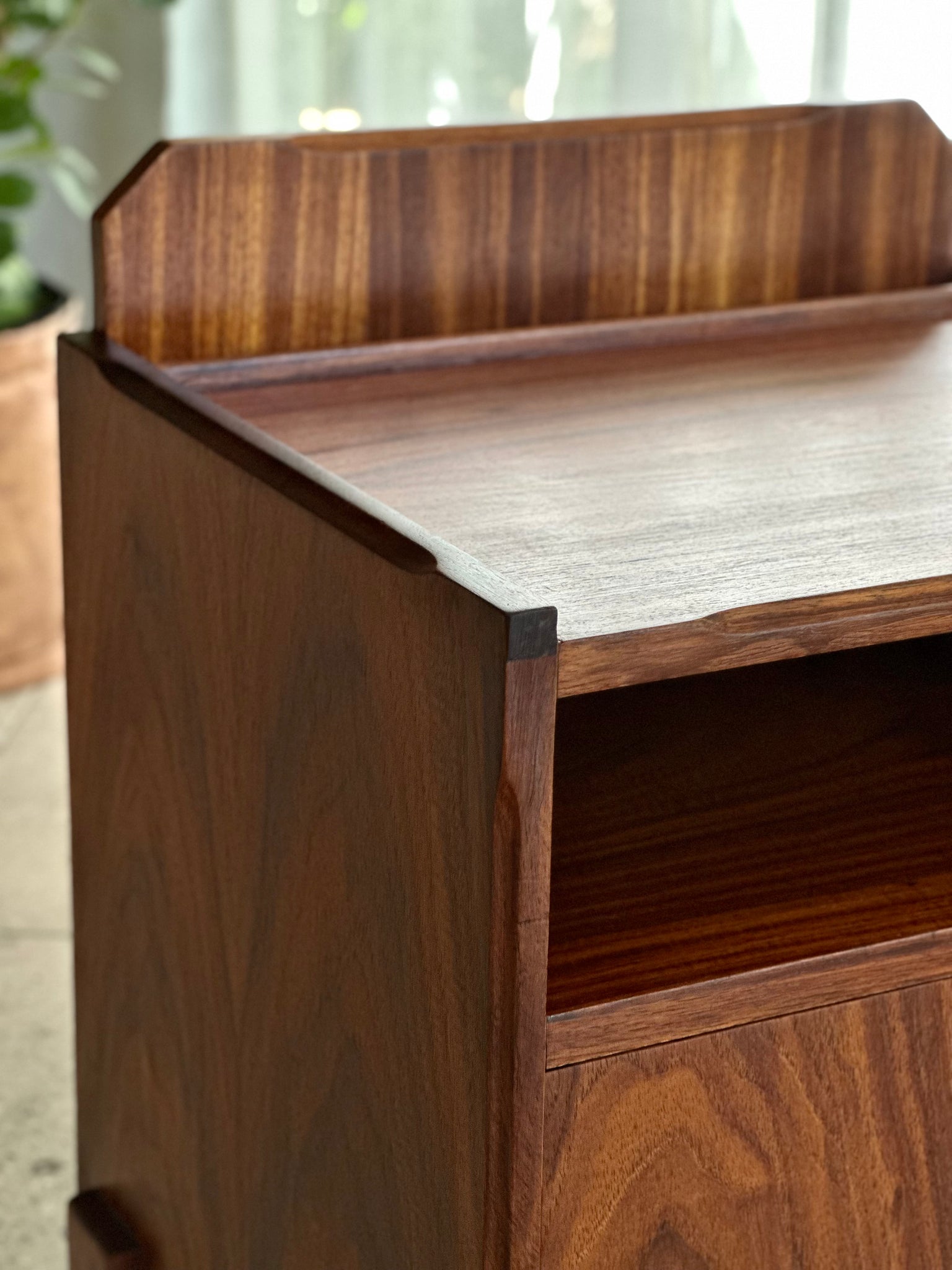 As with many Mid-Century pieces, this item features a thoughtful combination of solid wood and high-quality wood veneer. Veneer has a long and respected tradition in furniture making, valued for both its aesthetic and structural benefits. When crafted with skill and applied in substantial thickness, vintage veneer proves highly durable, allowing for careful restoration, including retouching, sanding, and refinishing without compromising the integrity of the piece.