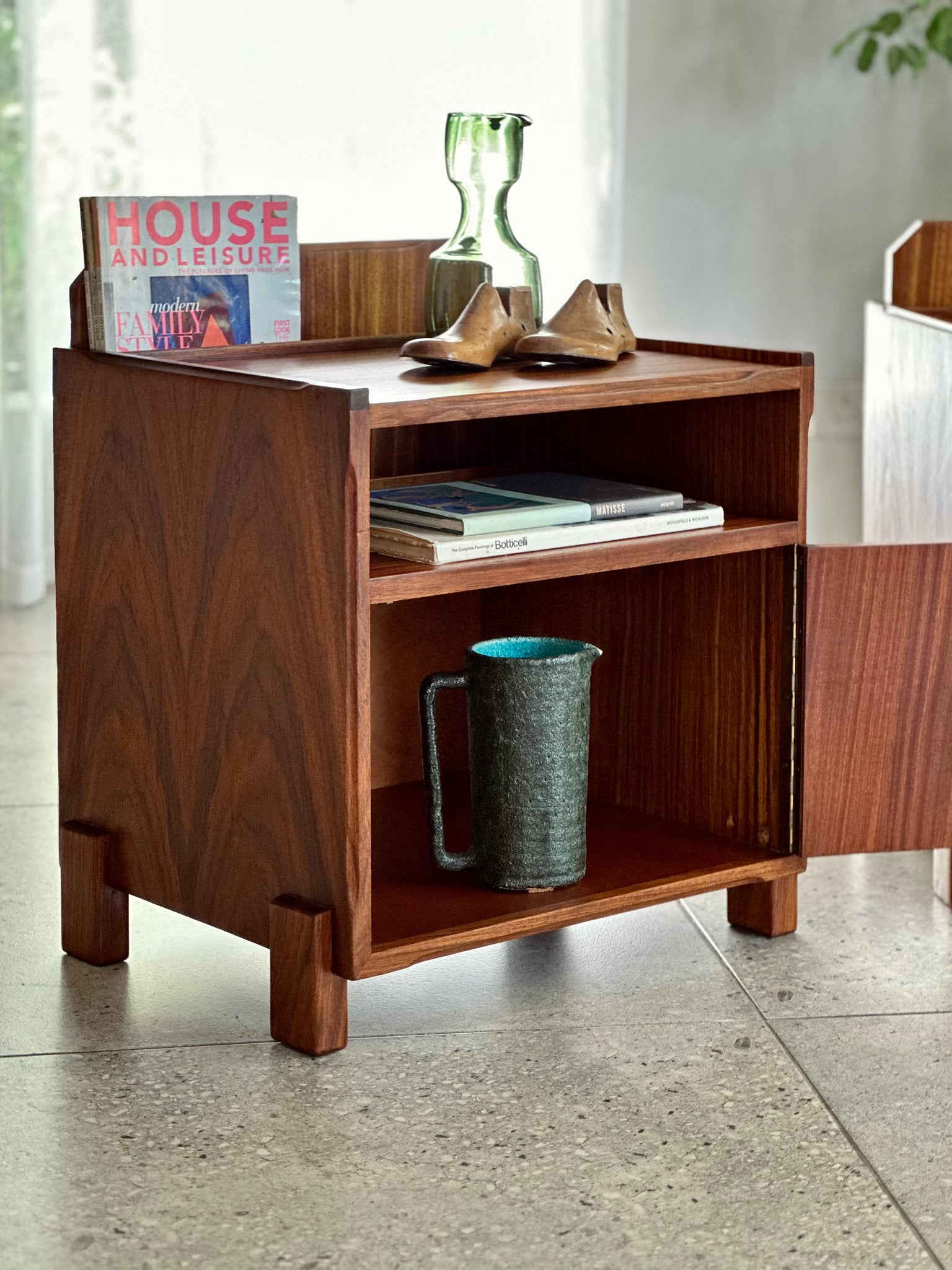 A fantastic Pair of retro bedside pedestals that provide you with ample functionality, presence, and storage. It combines practical storage with a built-in book or magazine holder at the back of the top surface, open storage space beneath the top, and cabinet space!