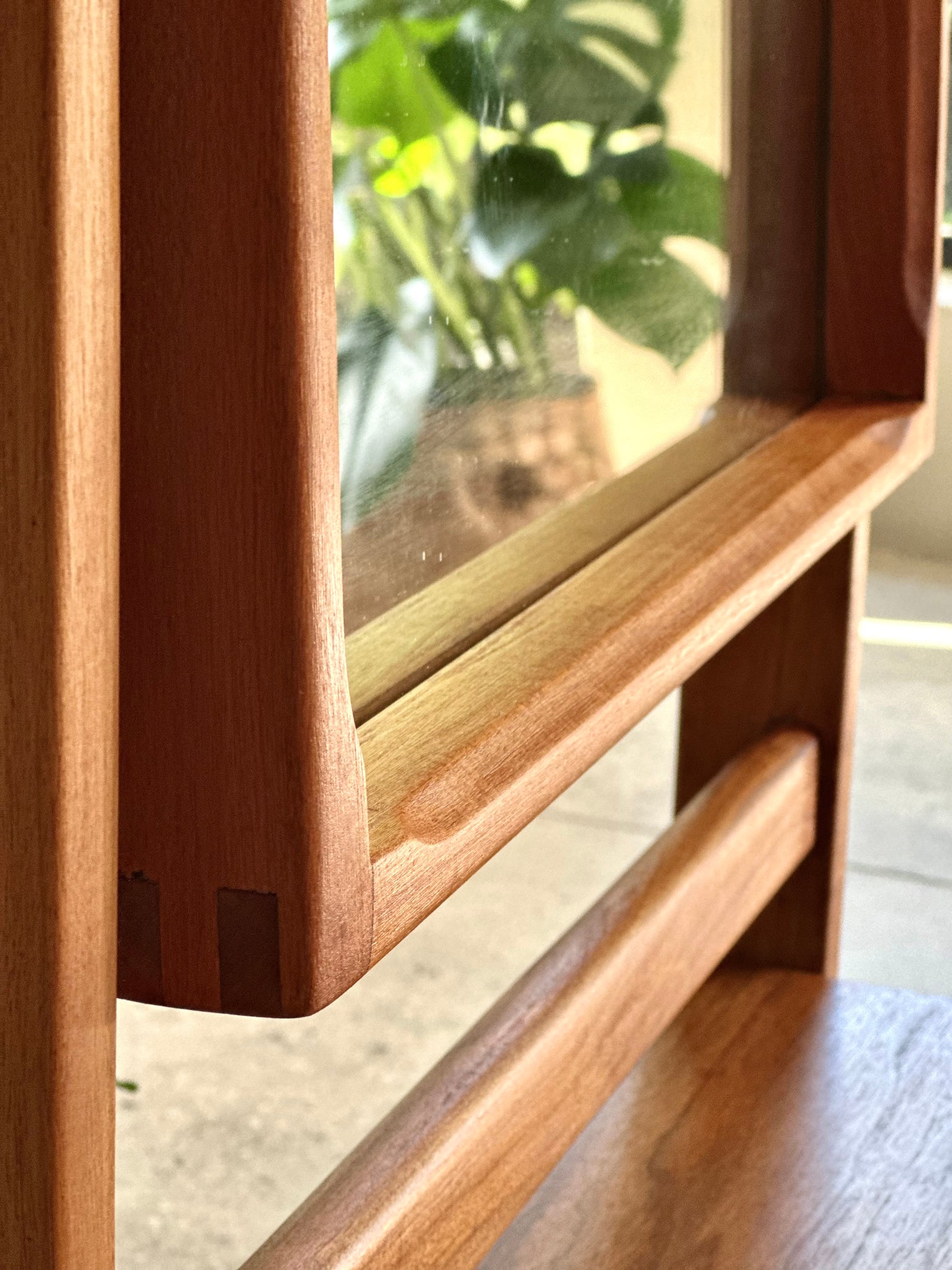 Torrente’s signature craftsmanship marks the frame: clean linear forms, refined chamfered edges, and exposed dovetail joints that add a quiet note of artisanal detail. The mirror is housed in a sculpted frame with softened inner edges, lending it a gentle, hand-finished feel. It sits securely between two upright supports, offering a balanced silhouette that feels both grounded and airy.