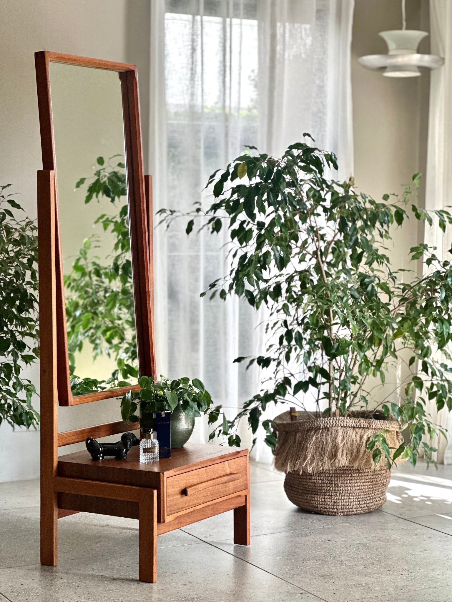 This elegant freestanding design pairs a full-length, tilting cheval mirror with a compact single-drawer dresser base, creating a piece that works effortlessly in a bedroom, dressing area, or studio space. Restored and sealed, it presents with a warm, even tone that highlights the quality of the hardwood and the precision of its joinery.