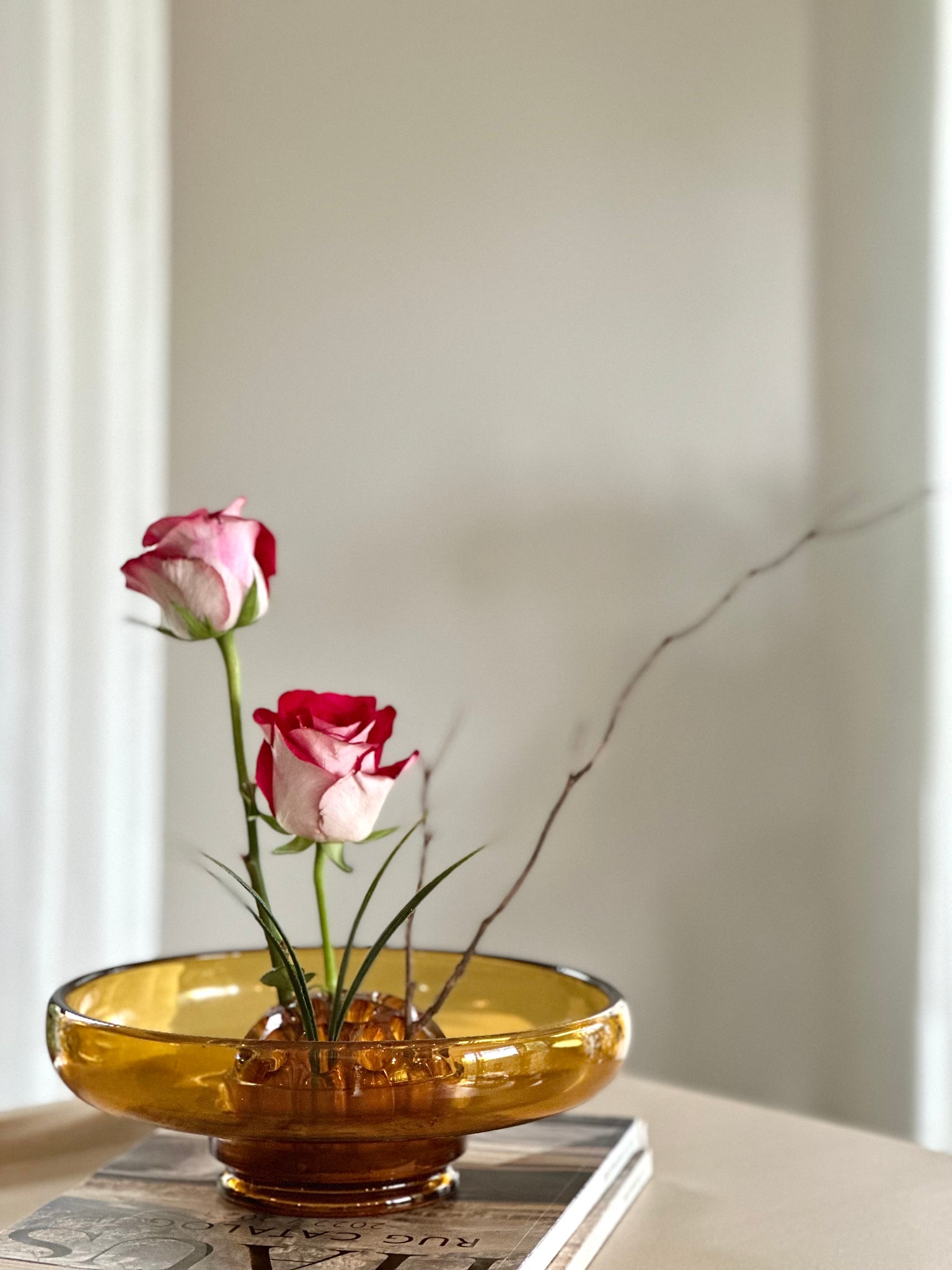 A beautiful vintage amber glass bowl, complete with its original matching flower frog — a classic duo for arranging blooms in an elegant, structured style. The warm honey-amber tone gives the piece a soft, glowing presence, making it equally lovely as a functional flower arranger or as a decorative centrepiece on its own.