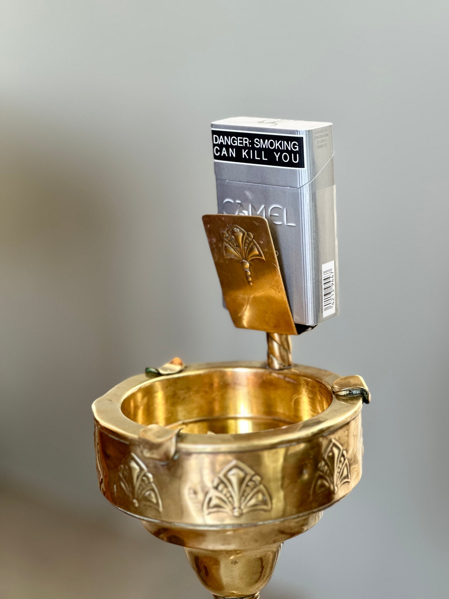 An elegant and beautifully crafted standing ashtray in brass, reflecting the soft curves and ornamental detailing reminiscent of the Art Nouveau era. The piece stands on a rounded footed base, leading into a twisted, rope-form column - at the top sits a round ash bowl, framed with delicate, flowing leaf motifs, and an integrated upright holder designed to accommodate a traditional cigarette box. The warm brass patina adds depth and authenticity, with gentle signs of age that speak to its history.