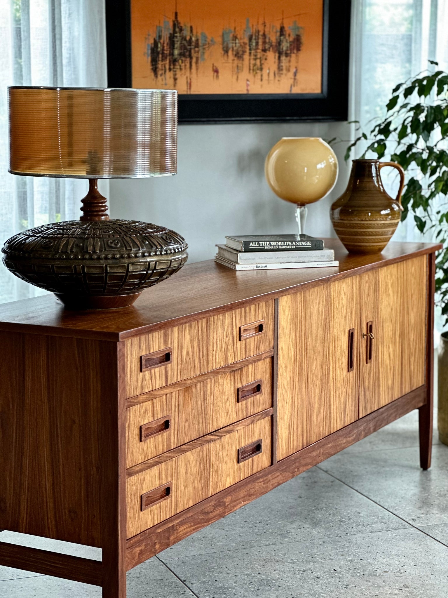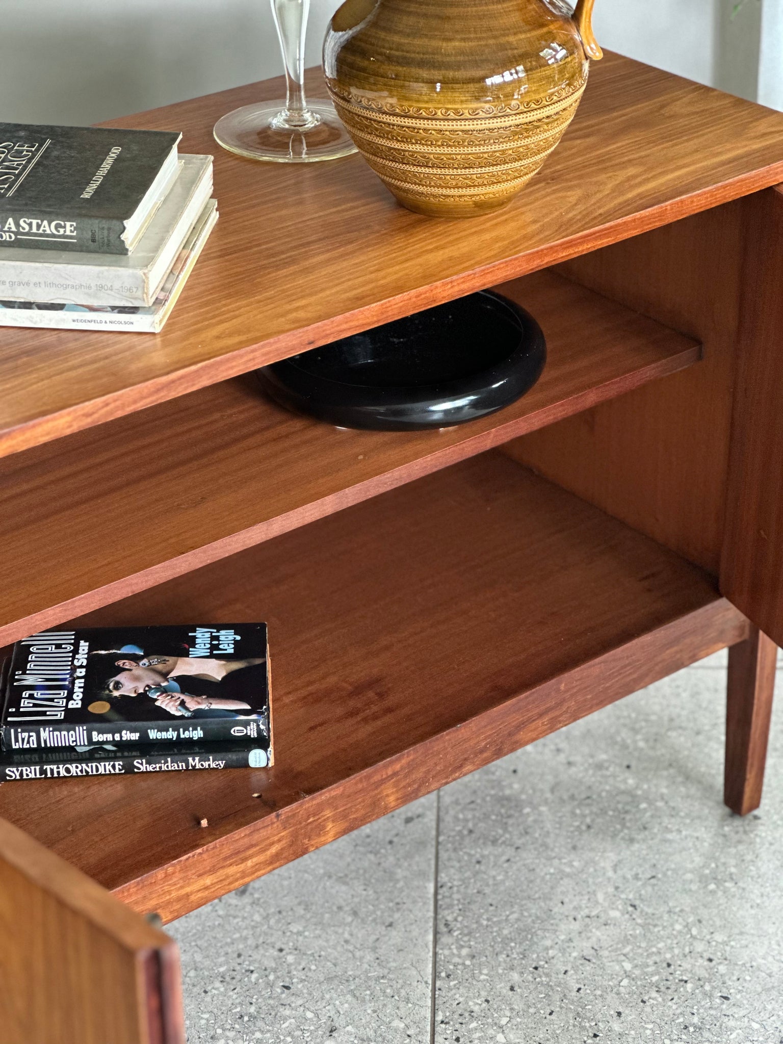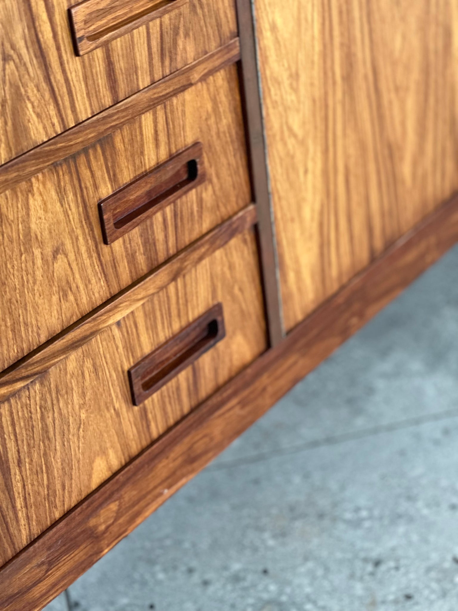 As with many Mid-Century pieces, this item features a thoughtful combination of solid wood and high-quality wood veneer. Veneer has a long and respected tradition in furniture making, valued for both its aesthetic and structural benefits. When crafted with skill and applied in substantial thickness, vintage veneer proves highly durable, allowing for careful restoration, including retouching, sanding, and refinishing without compromising the integrity of the piece.