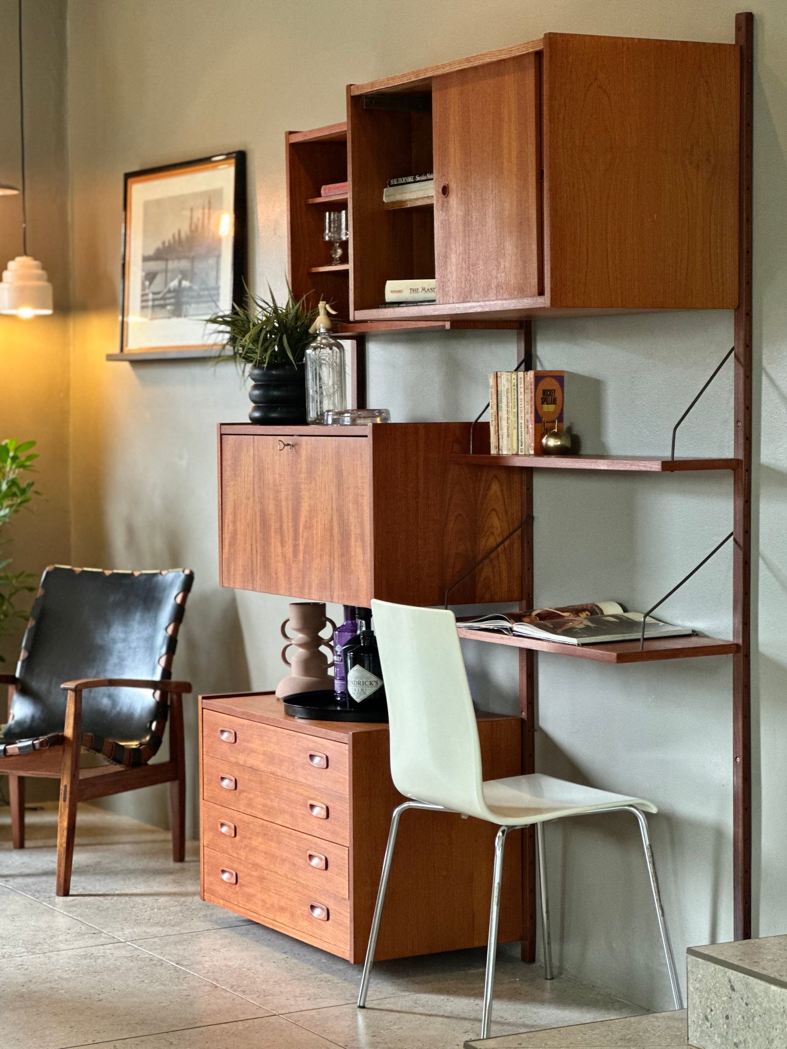 PS System (sometimes labeled “ps system – Danish Furniture, Randers”) was part of the wave of modular wall-mounted furniture brands emerging in Denmark during the late 1950s and 1960s. In the same design lineage as Poul Cadovius’ Royal System and Kai Kristiansen’s FM shelves, PS units are known for their precision joinery, adjustable shelf standards, and functional cabinetry modules.