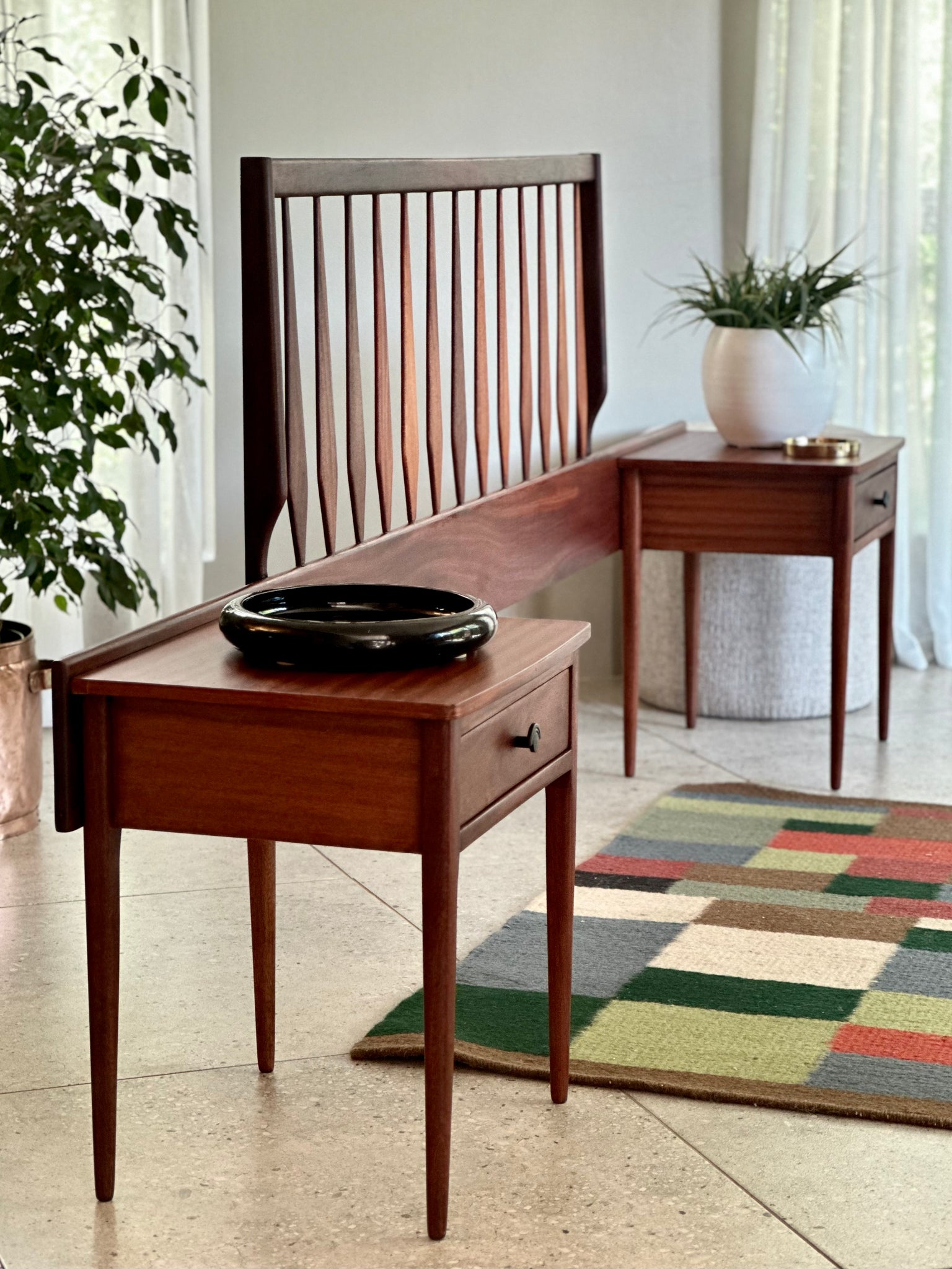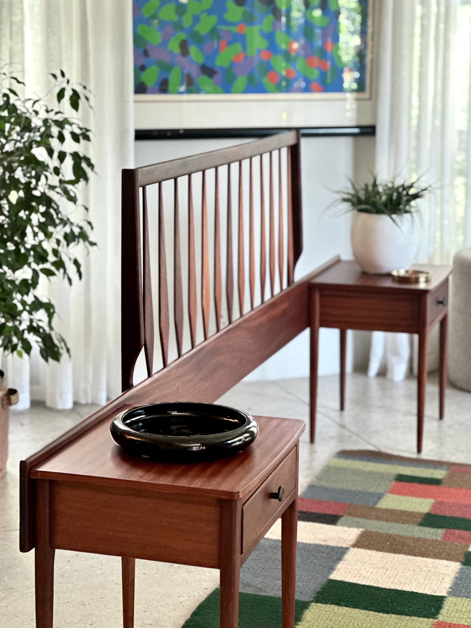 As with many Mid-Century pieces, this item features a thoughtful combination of solid wood and high-quality wood veneer. Veneer has a long and respected tradition in furniture making, valued for both its aesthetic and structural benefits. When crafted with skill and applied in substantial thickness, vintage veneer proves highly durable, allowing for careful restoration, including retouching, sanding, and refinishing without compromising the integrity of the piece.