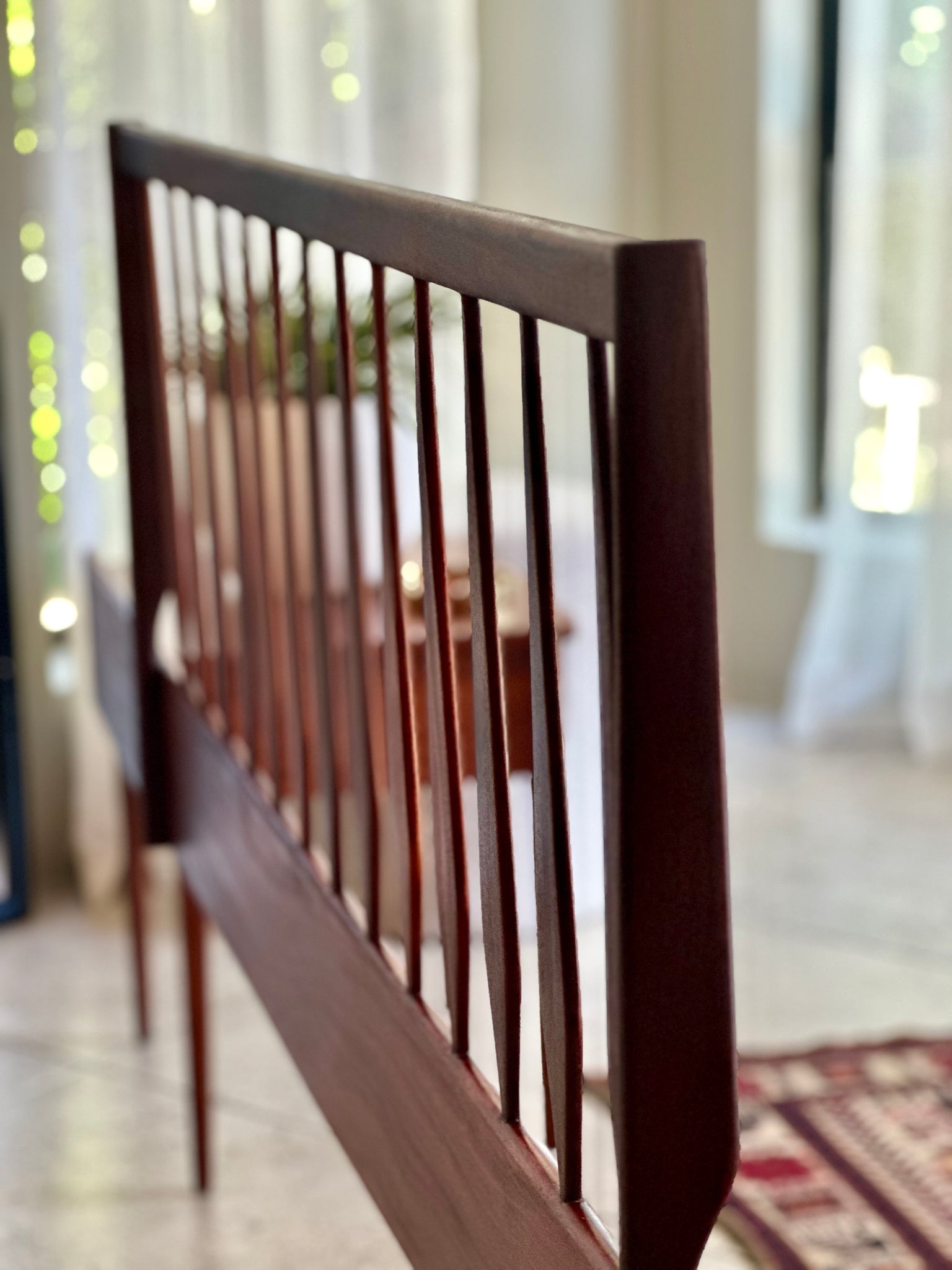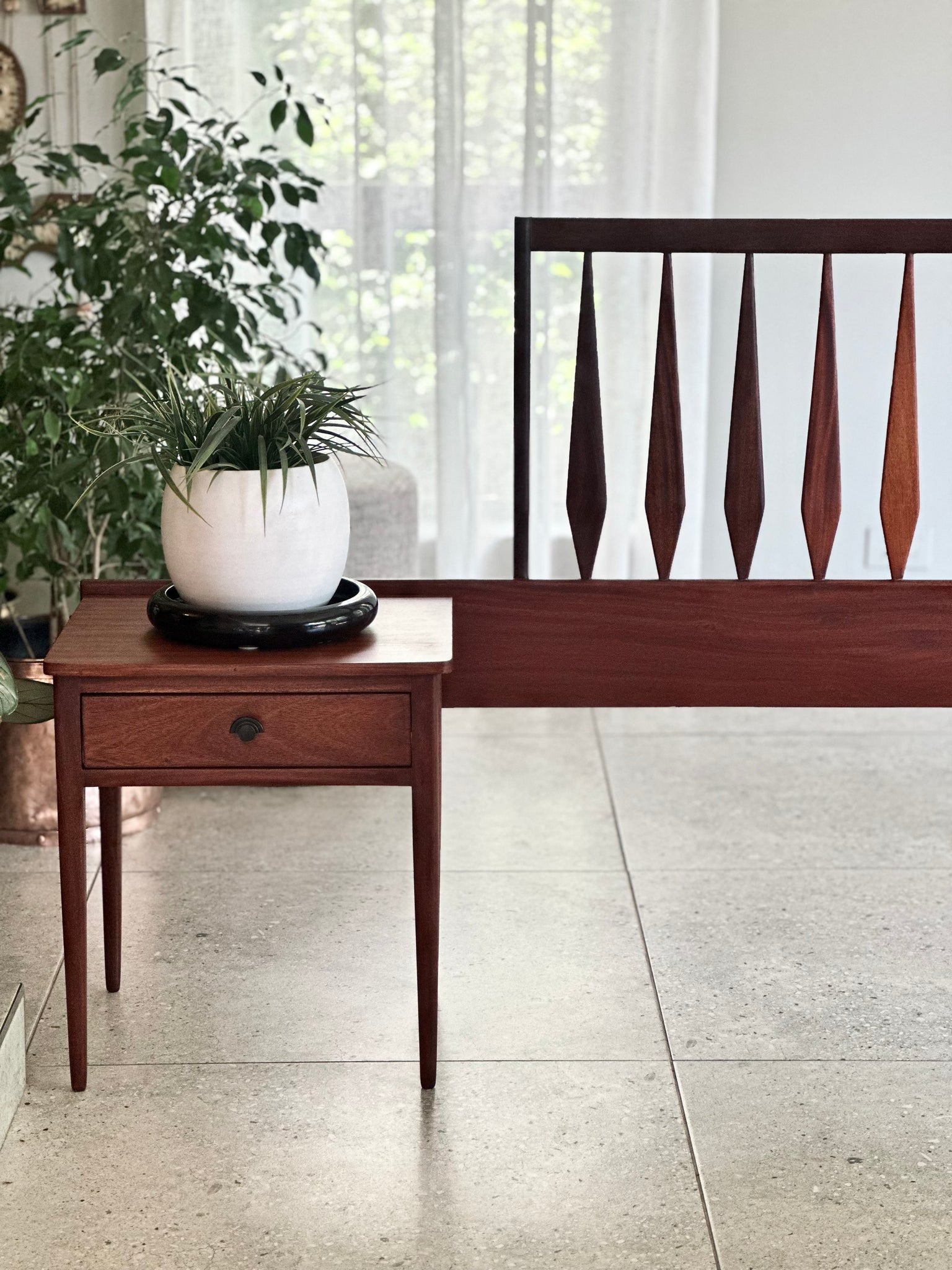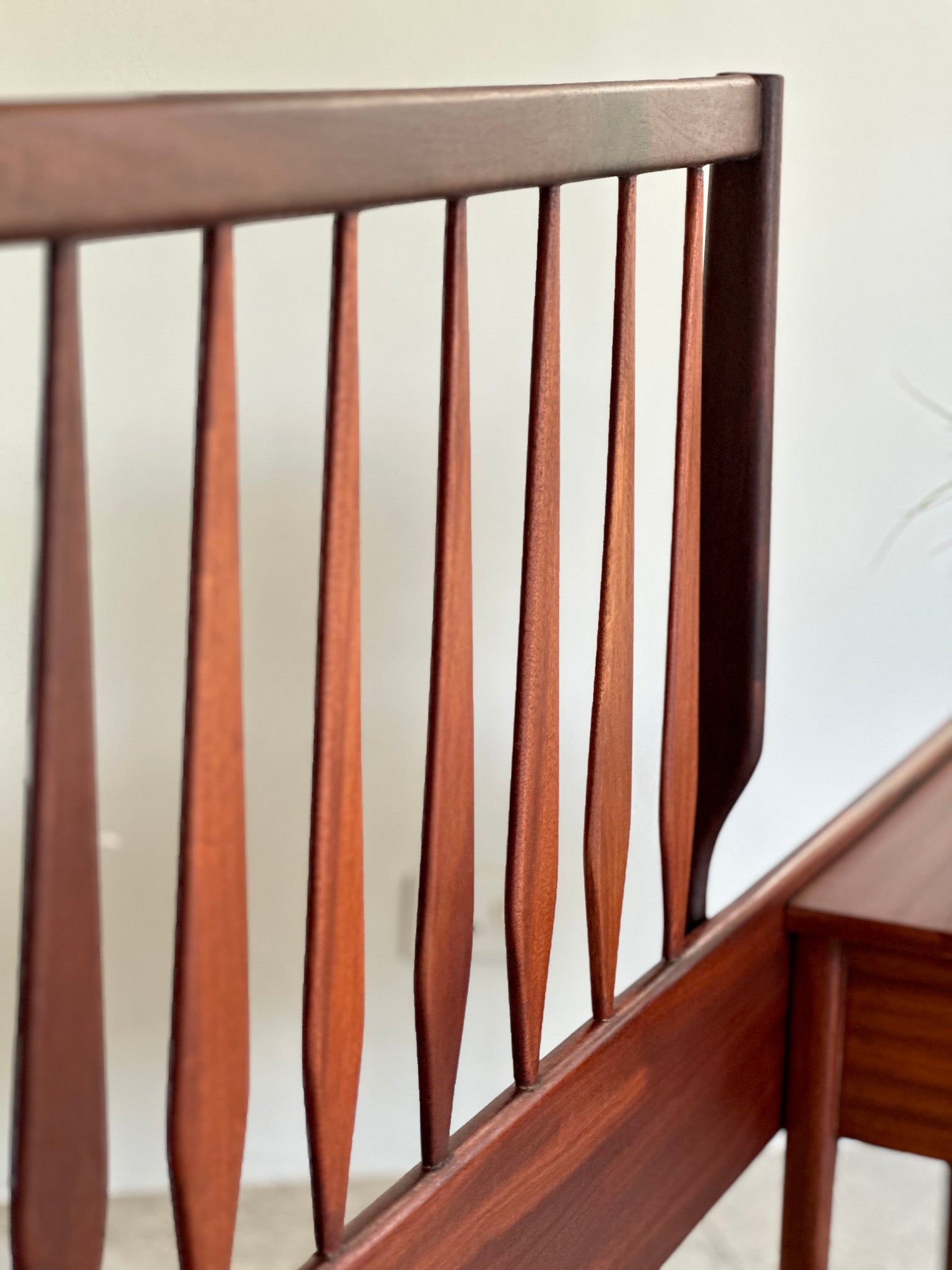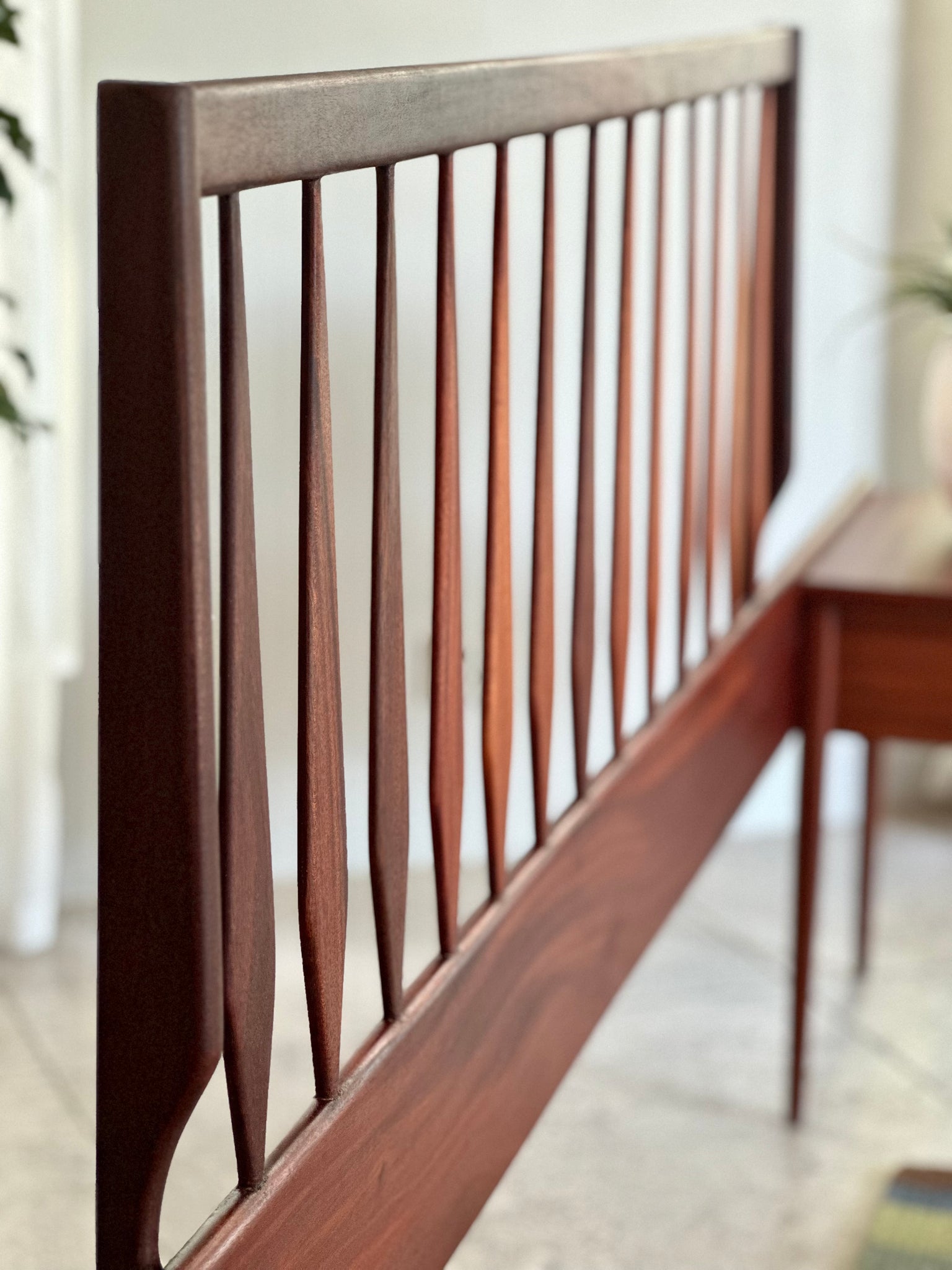 A fantastic Mid-Century headboard with a beautiful solid Sapele mahogany carved-detail headrest section & two wood veneered-top pedestals. This piece was likely manufactured by the renowned South African, DS Vorster & Co., during the '60s. The pedestals are attached to the headboard.