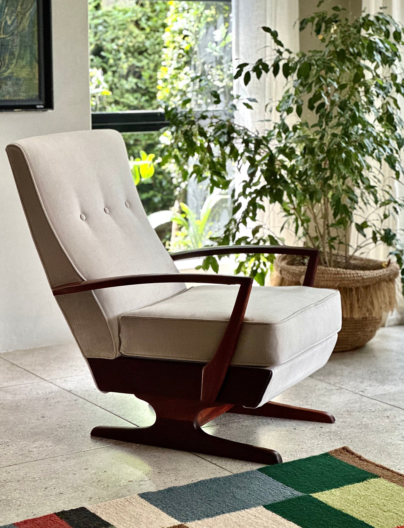 A timeless mid-century piece, beautifully crafted and refreshed, ready to anchor a reading nook, lounge corner, nursery, or sunroom. A collectible classic with fresh life.