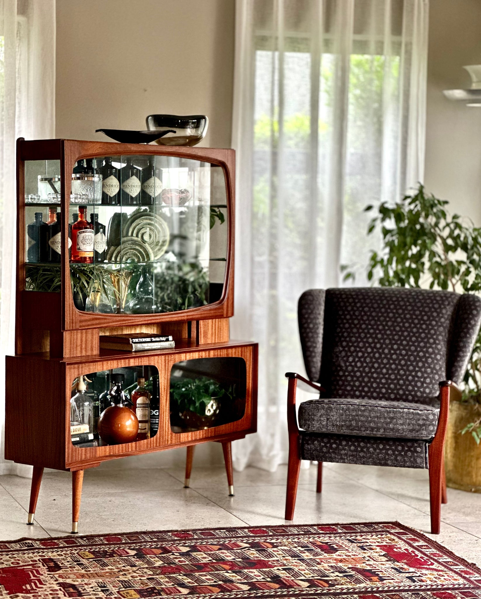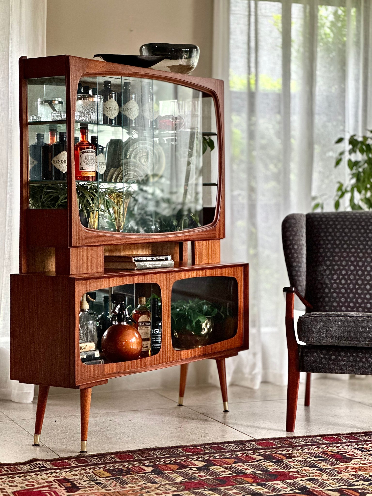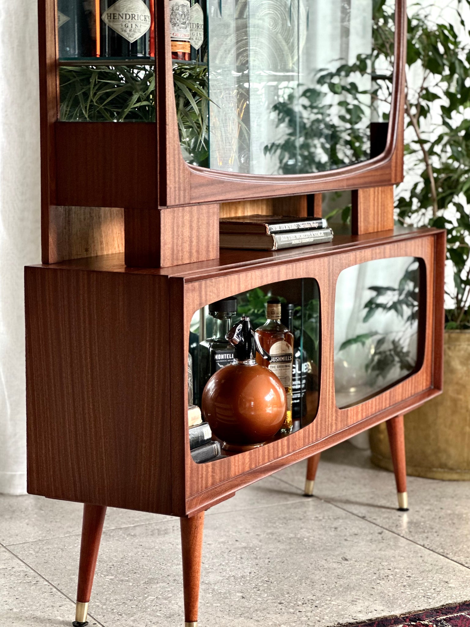 This striking mahogany cabinet is a beautiful example of mid-century craftsmanship with a retro flair. Defined by its flowing lines, warm timber tones, and elegant proportions. The softly curved frames around the glass panels give the piece a light, considered presence, while the tapered legs ground the look.