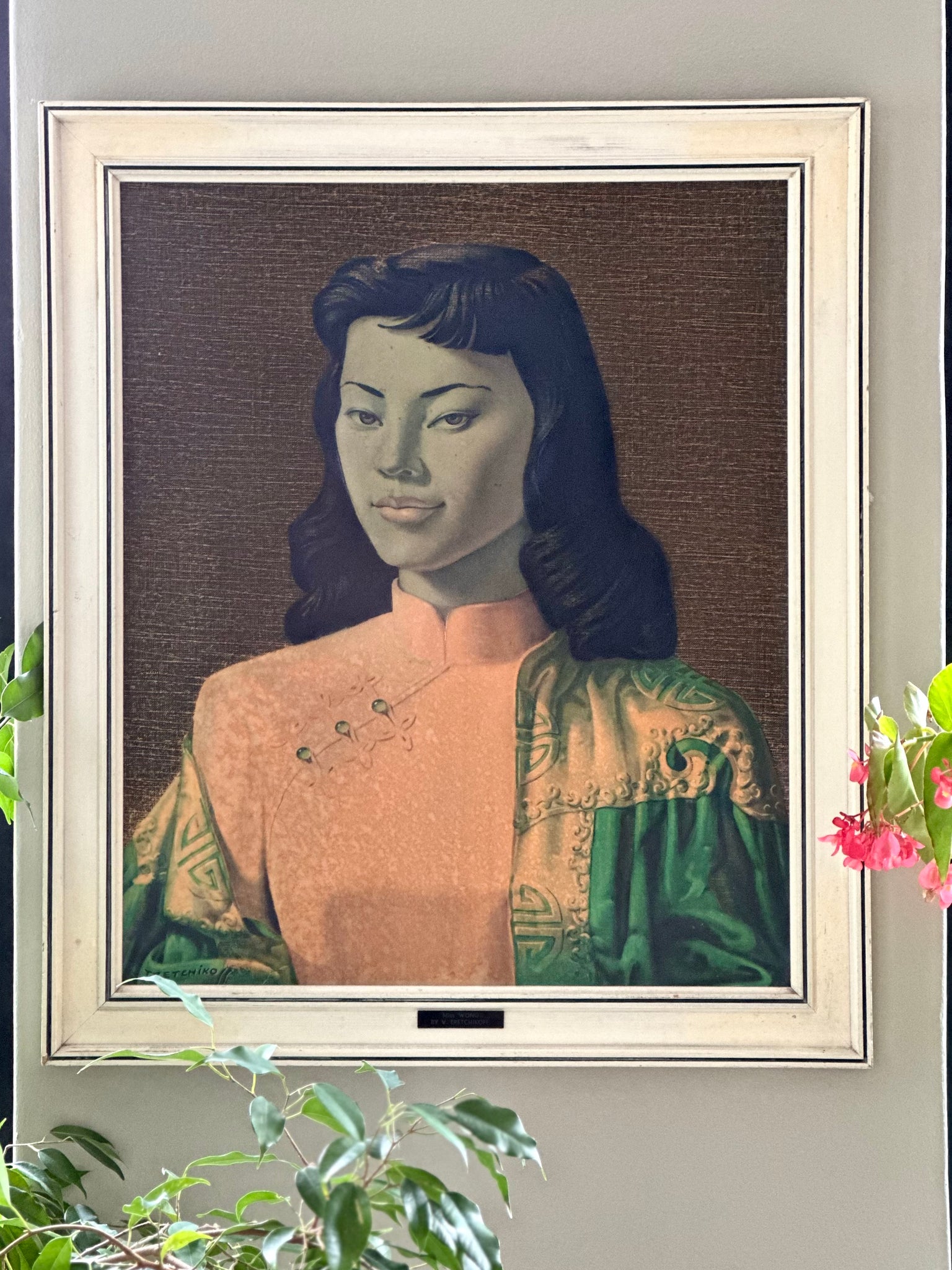 A vintage print of one of Vladimir Tretchikoff’s most recognisable portraits, Miss Wong, first painted in 1955. This work forms part of the artist’s celebrated series of Asian-inspired portraits that helped cement his global popularity through the mid-twentieth century. With her serene expression, softly modelled features, and distinctive green-toned skin, Miss Wong became one of his most widely collected and reproduced images.