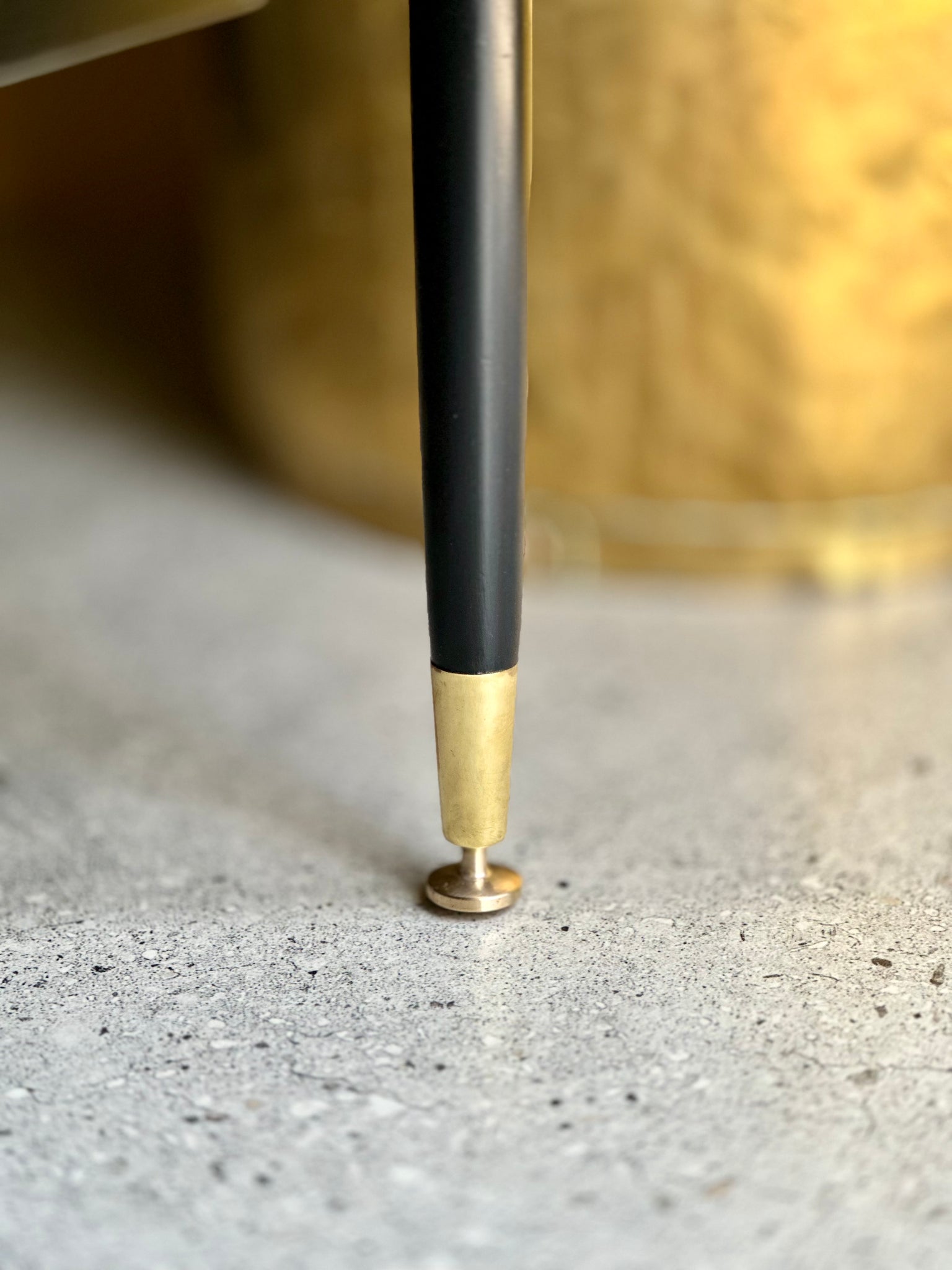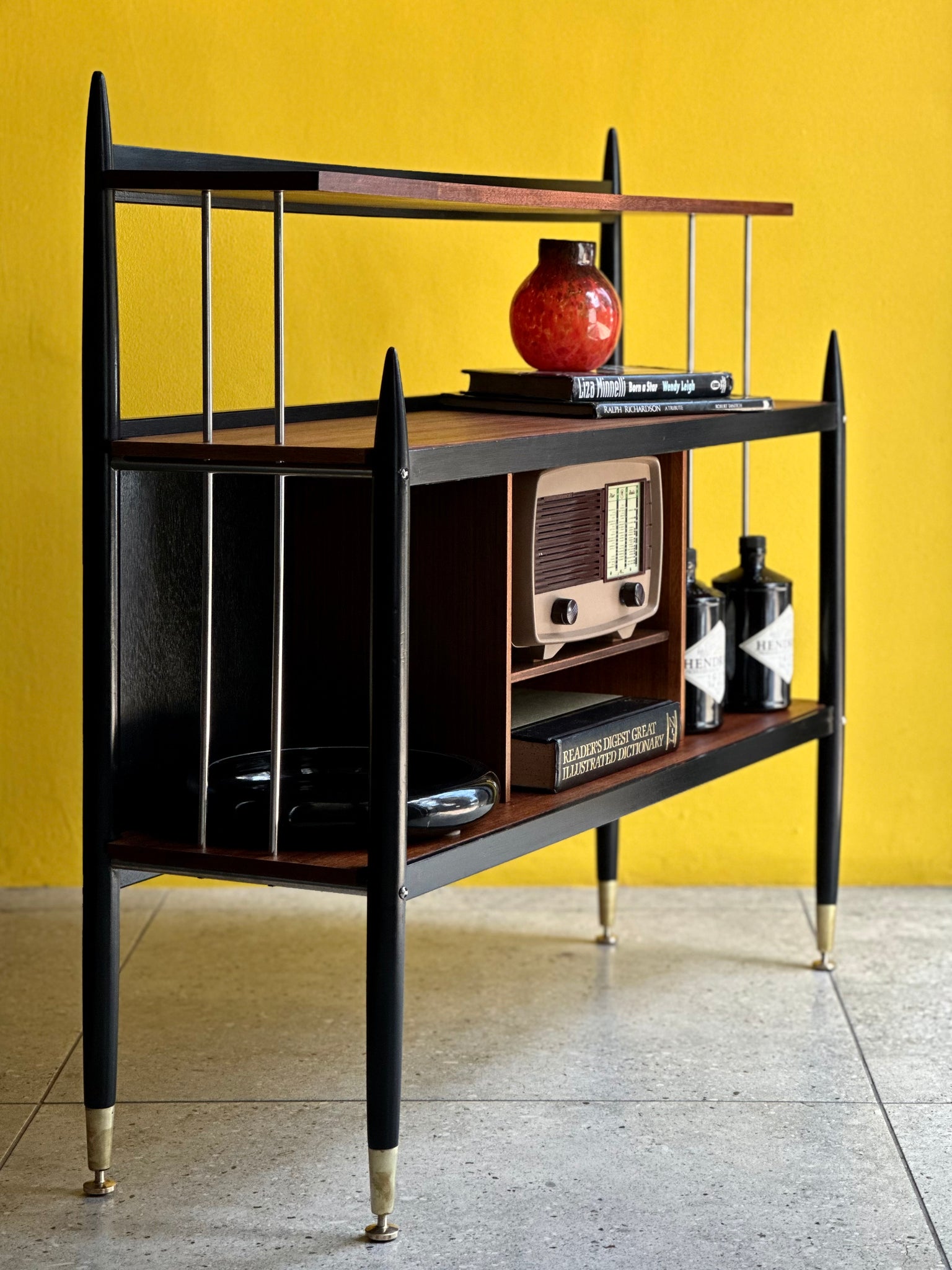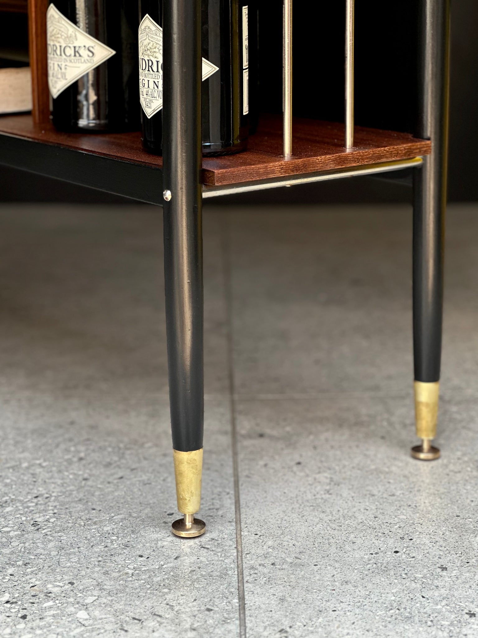 This item features the classic G Plan aesthetic: slim tapering legs finished in black with brass-capped feet, warm wood tones, and vertical support rods that add visual lightness while maintaining structural strength.