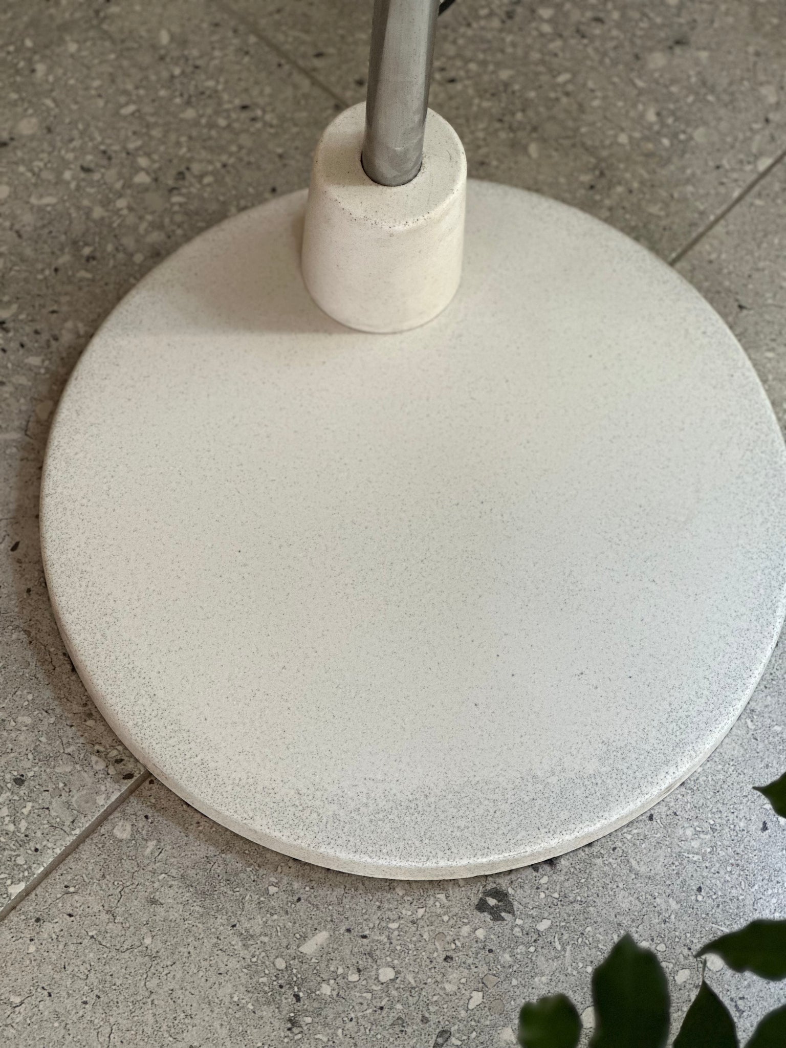 A large classic arched floor lamp with a heavy marble base, adjustable shade - possibly 80's/90's - slightly adjustable in terms of the length of the bowed arm.