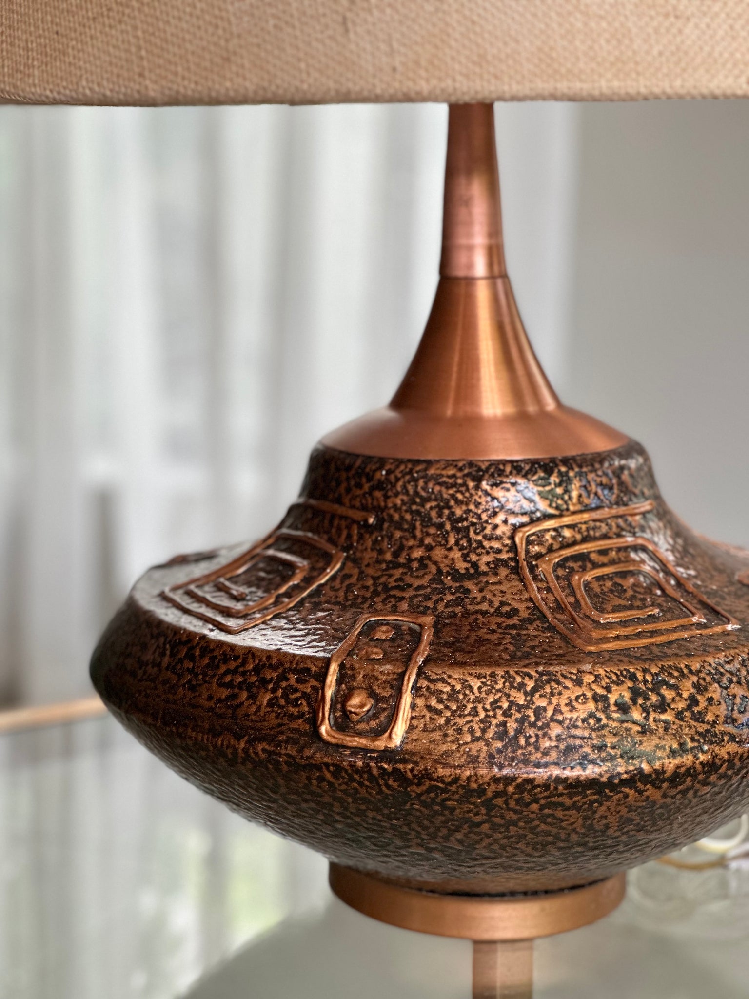 The base is heavy, finished in a warm copper-look glaze with textured surface detailing and geometric relief motifs characteristic of the era. Its wide, sculptural form adds real presence, making it both functional and decorative.