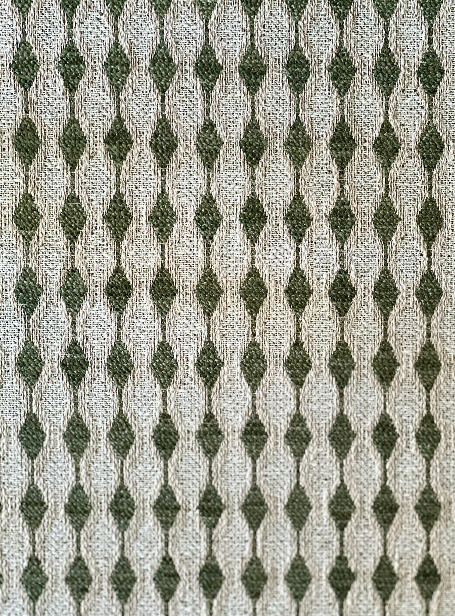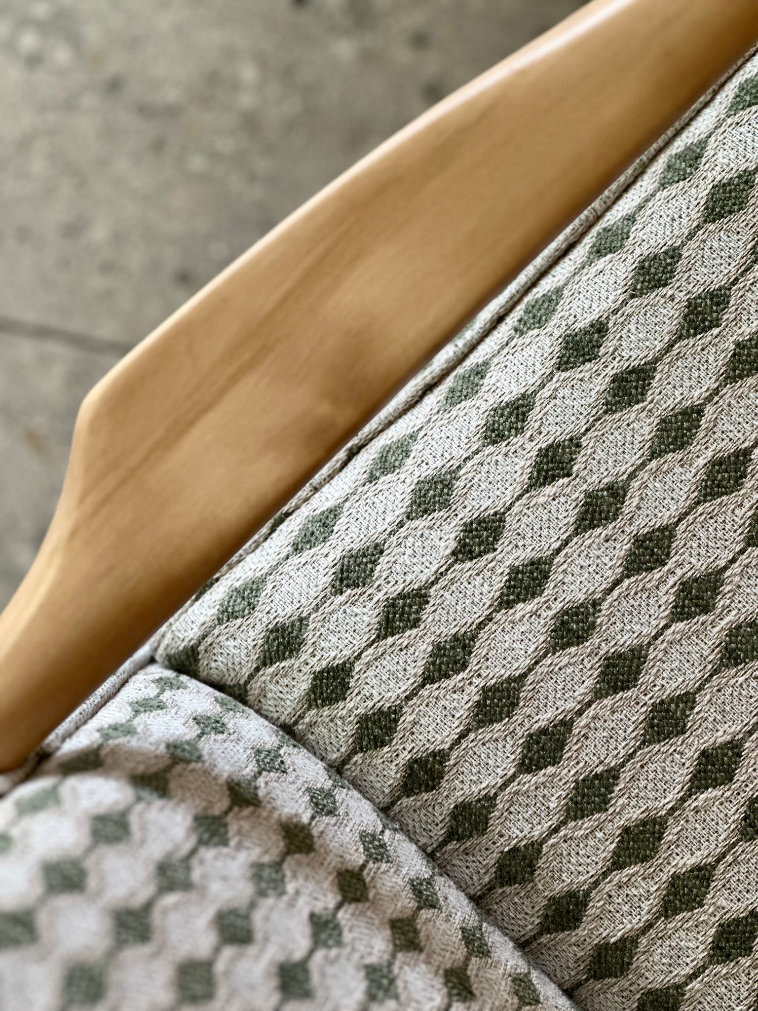 Immaculately re-upholstered in a sage and cream Hertex fabric, featuring a subtle geometric pattern that adds texture while keeping the palette calm and contemporary. The upholstery is crisp and tailored, complementing the chair’s refined structure without overwhelming it.