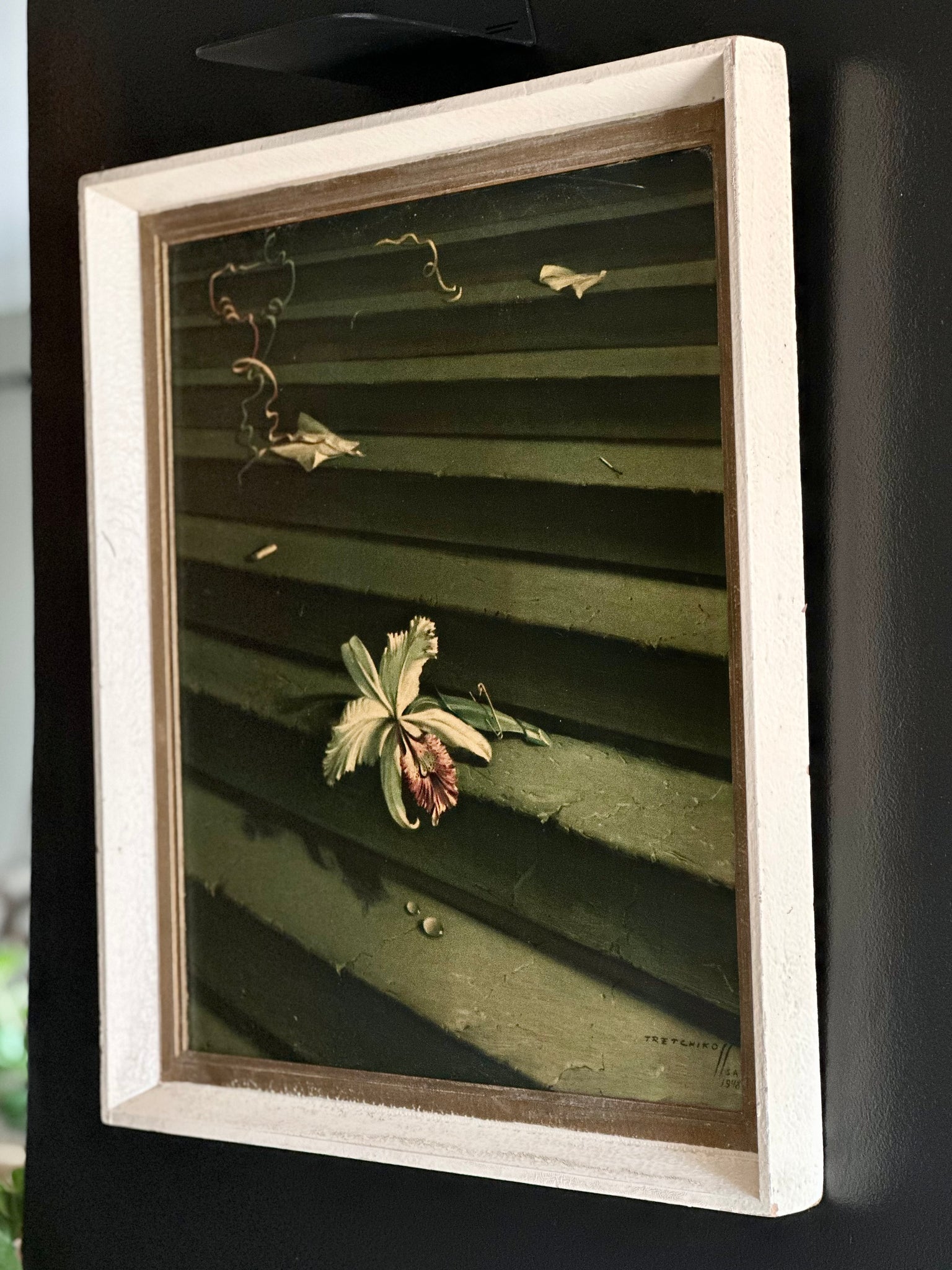 This hauntingly beautiful still life captures Tretchikoff’s hallmark blend of realism and surreal theatricality: a single orchid lies upon a flight of green steps, its delicate petals illuminated by an unseen light source, surrounded by curling ribbons and fallen paper. The play of shadow and form evokes both serenity and melancholy — a quiet moment suspended in time.