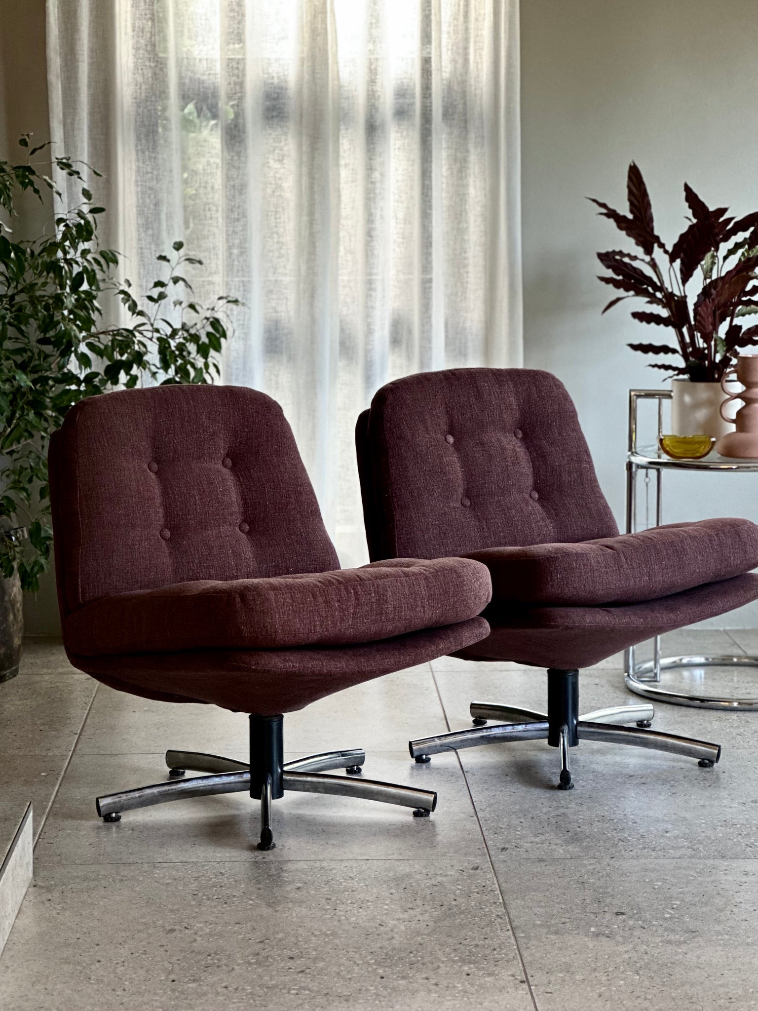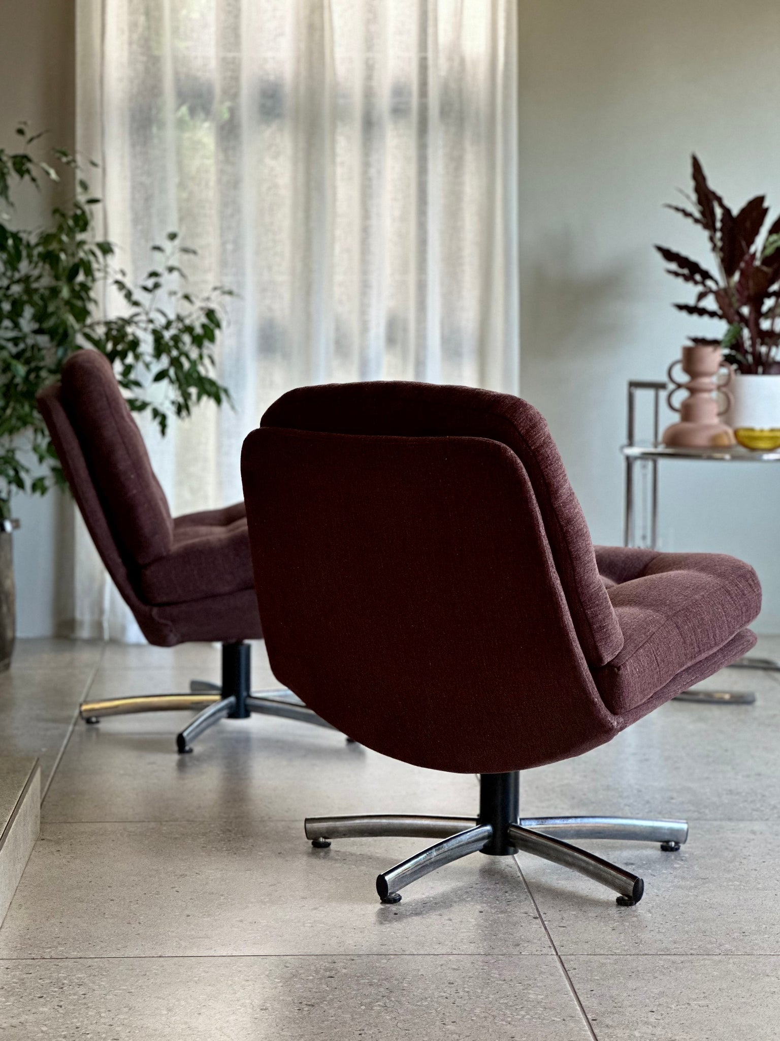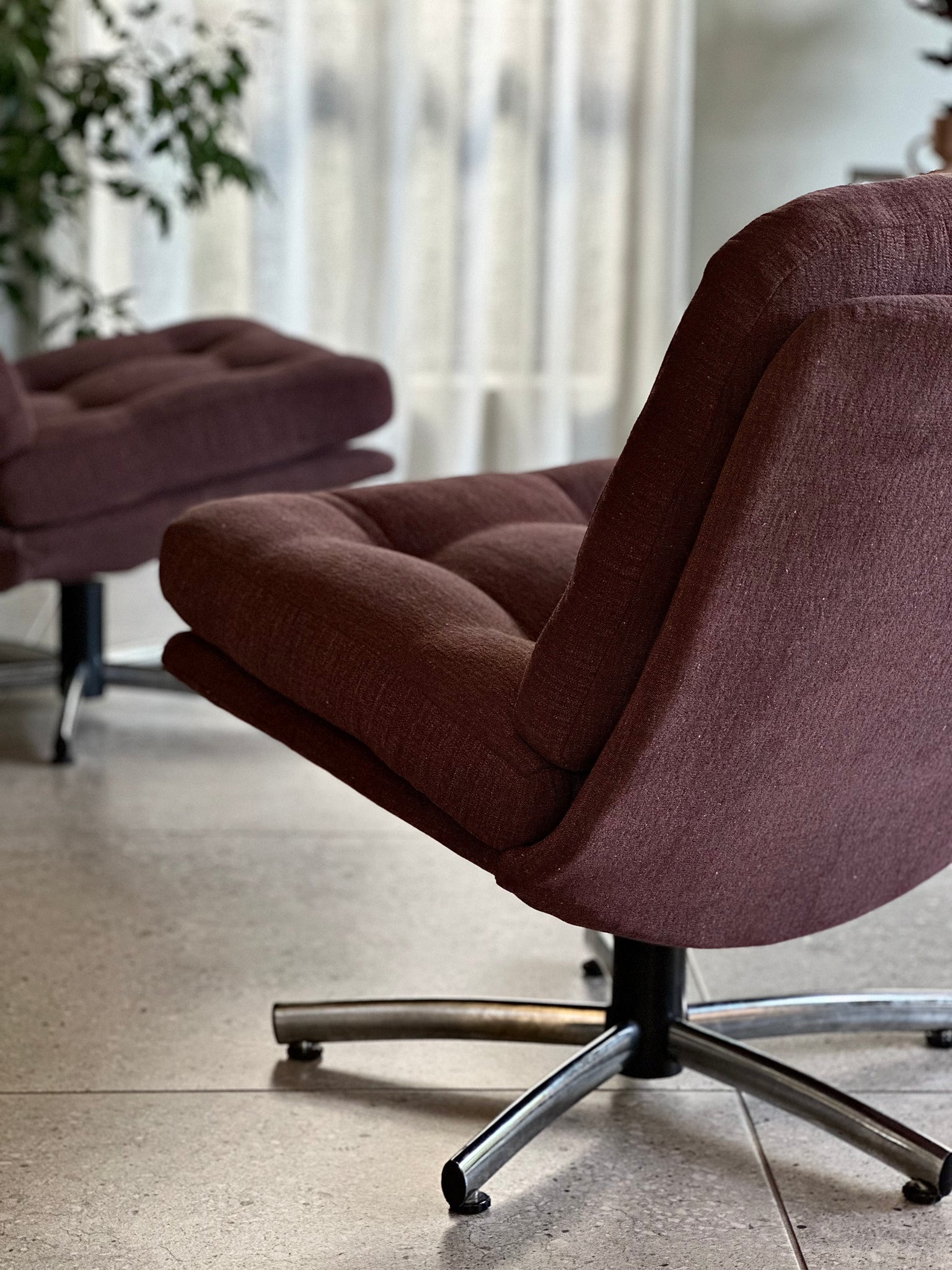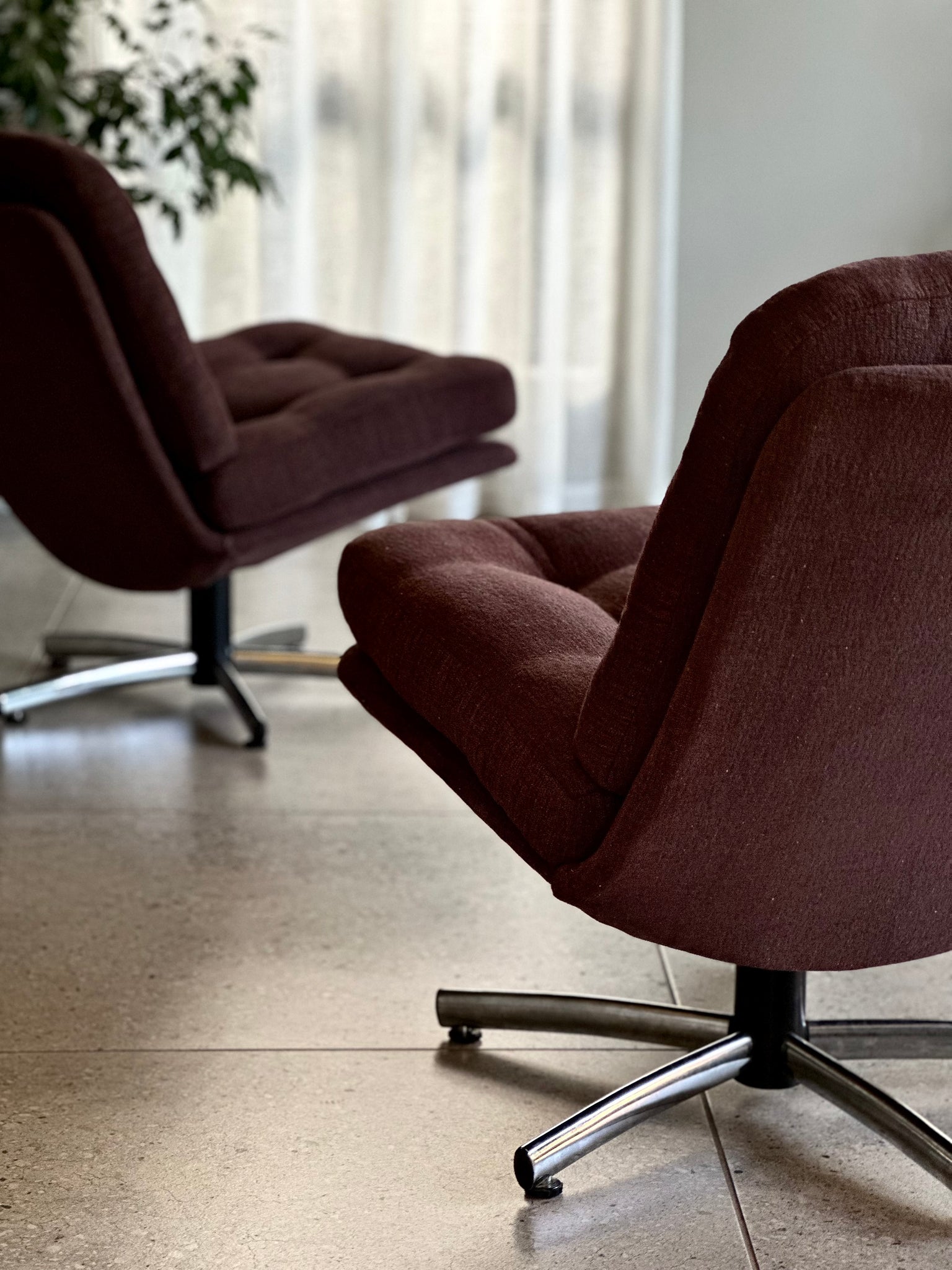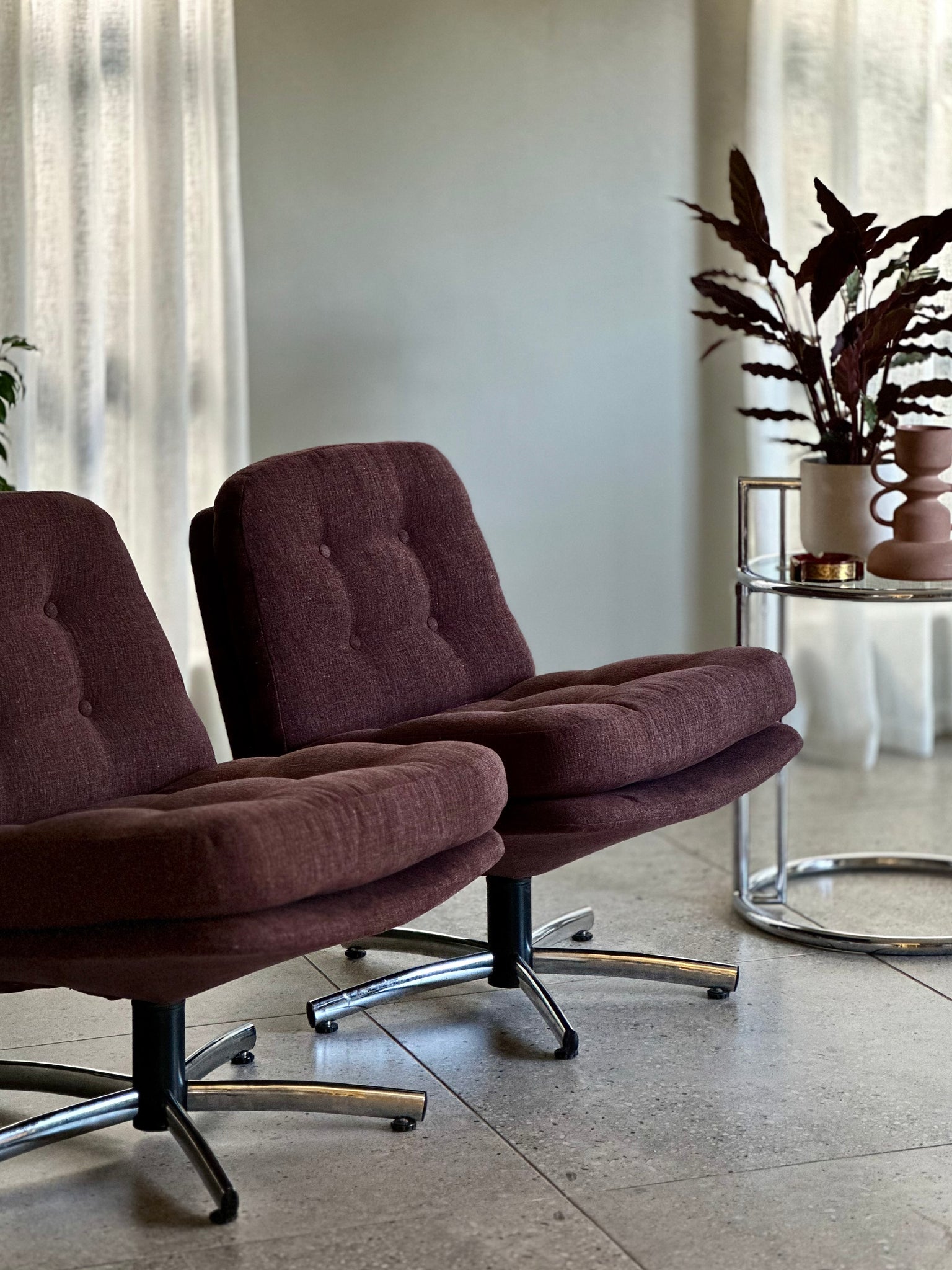 Add a splash of mid-mod charm to your space with this delightful pair of retro chairs, featuring sleek chromed steel legs and a bold, timeless design. Upholstered in Hertex’s luxurious fabric in a Merlot color, soft-touch fabric, these chairs offer both visual appeal and exceptional comfort.