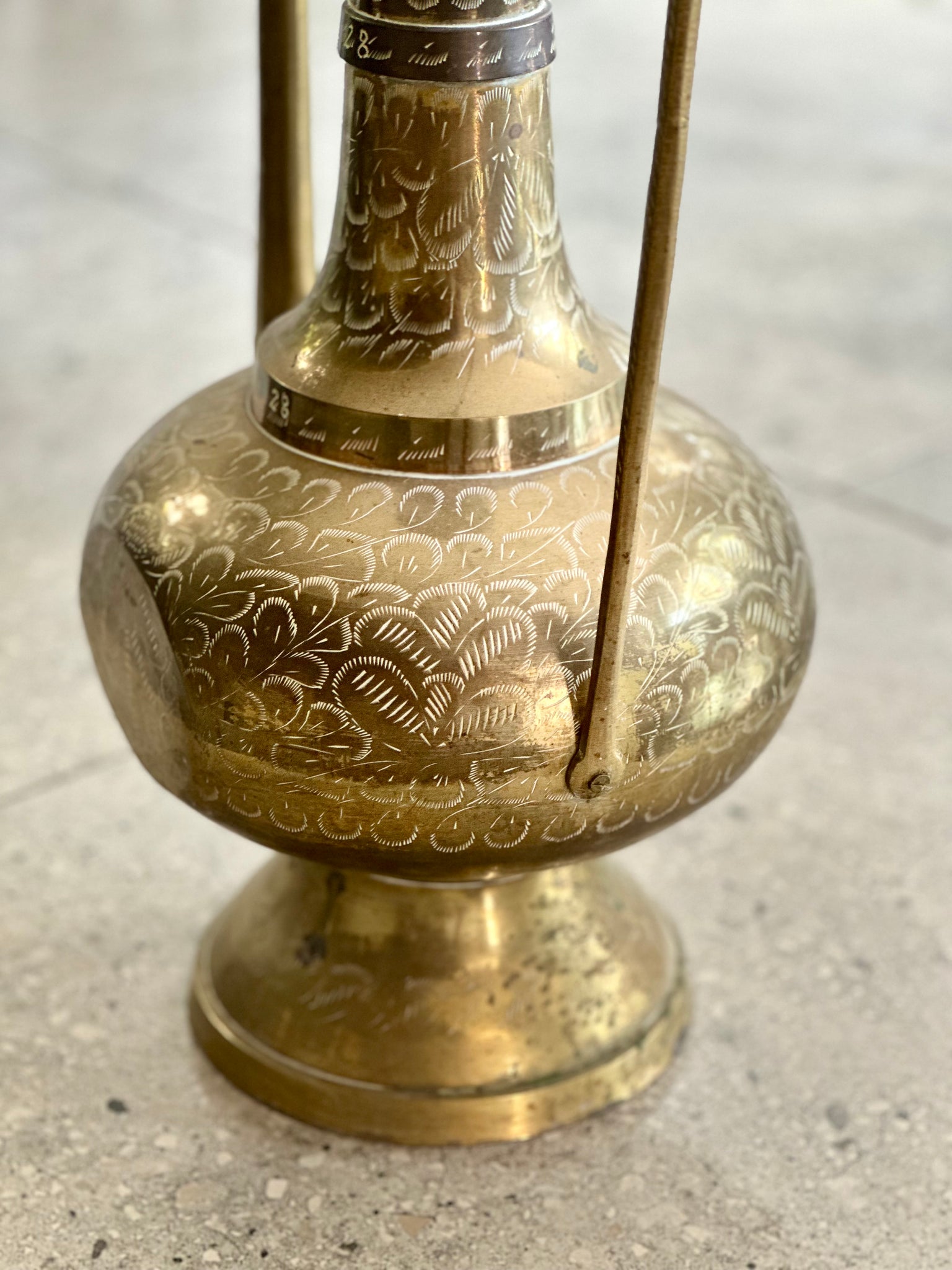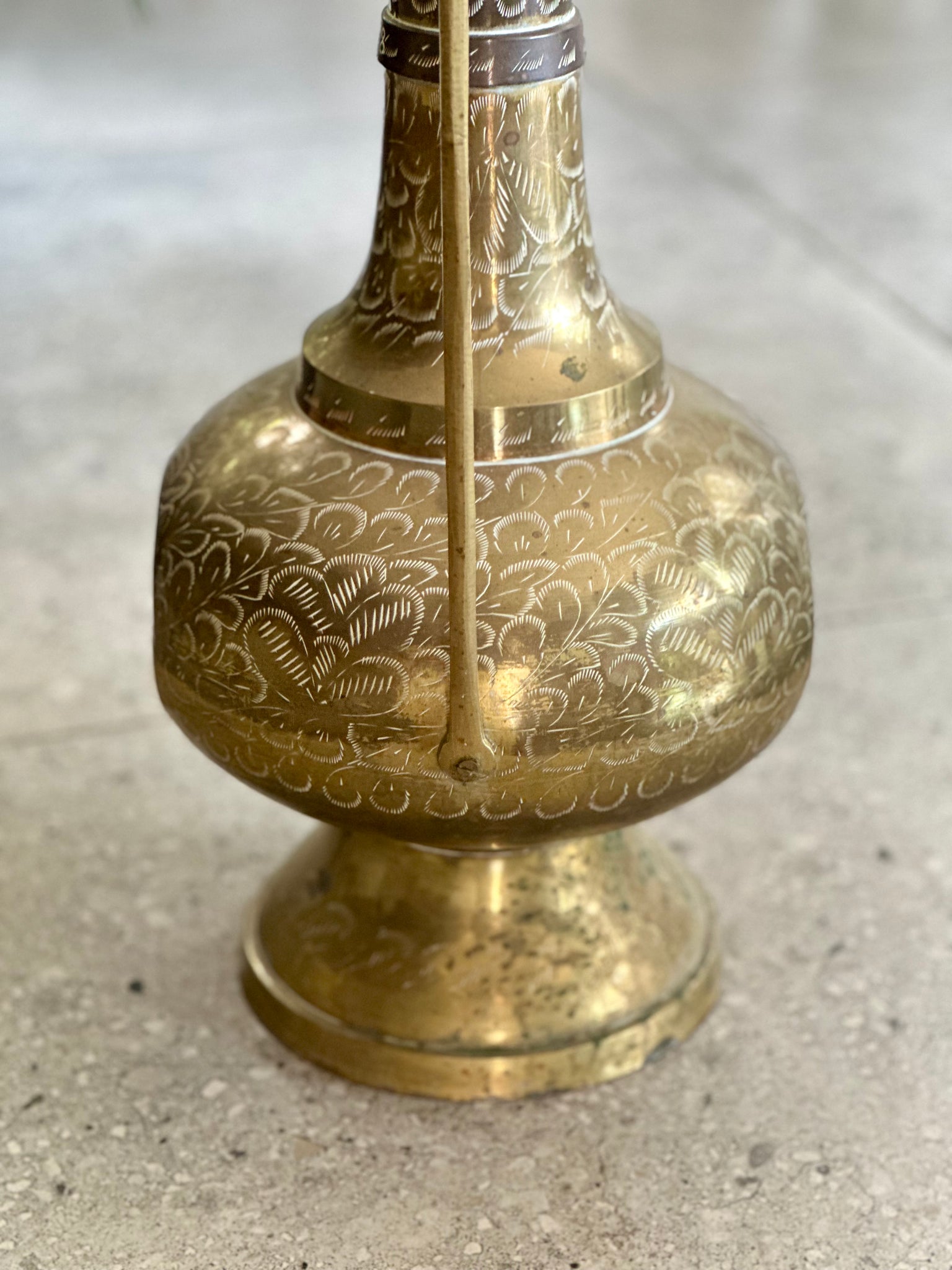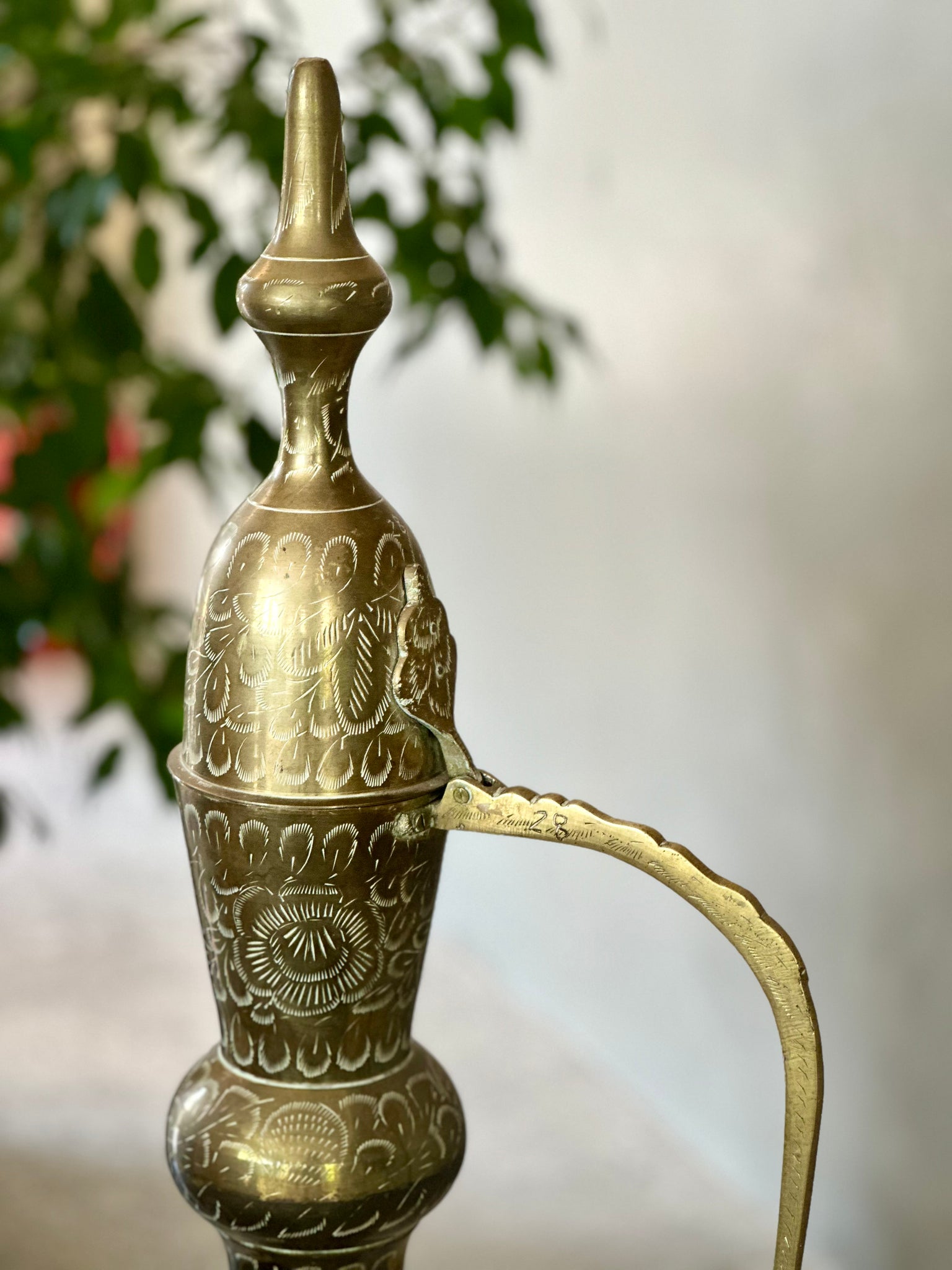 A tall vintage Indian brass Dallah-style coffee pot that exemplifies traditional craftsmanship and old-world charm. Its gracefully elongated body features a bulbous base that tapers into a slender, elegant neck. It is embellished with intricate hand-etched patterns and floral motifs.