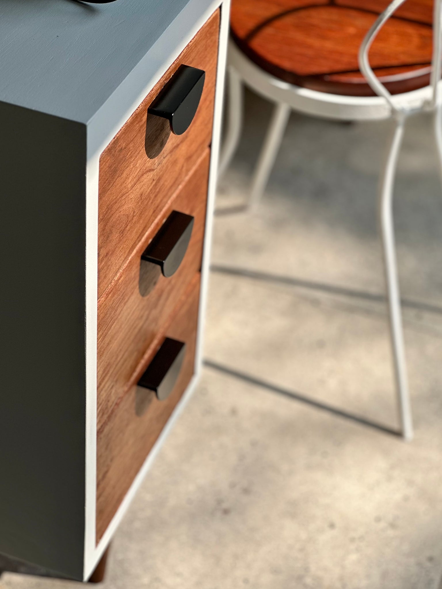 The drawers, however, retain their original warm timber fronts — a beautiful contrast that grounds the piece in its vintage roots. Each drawer is fitted with new retro-inspired black steel pulls, their half-moon silhouette adding a sculptural, graphic moment to the overall design.