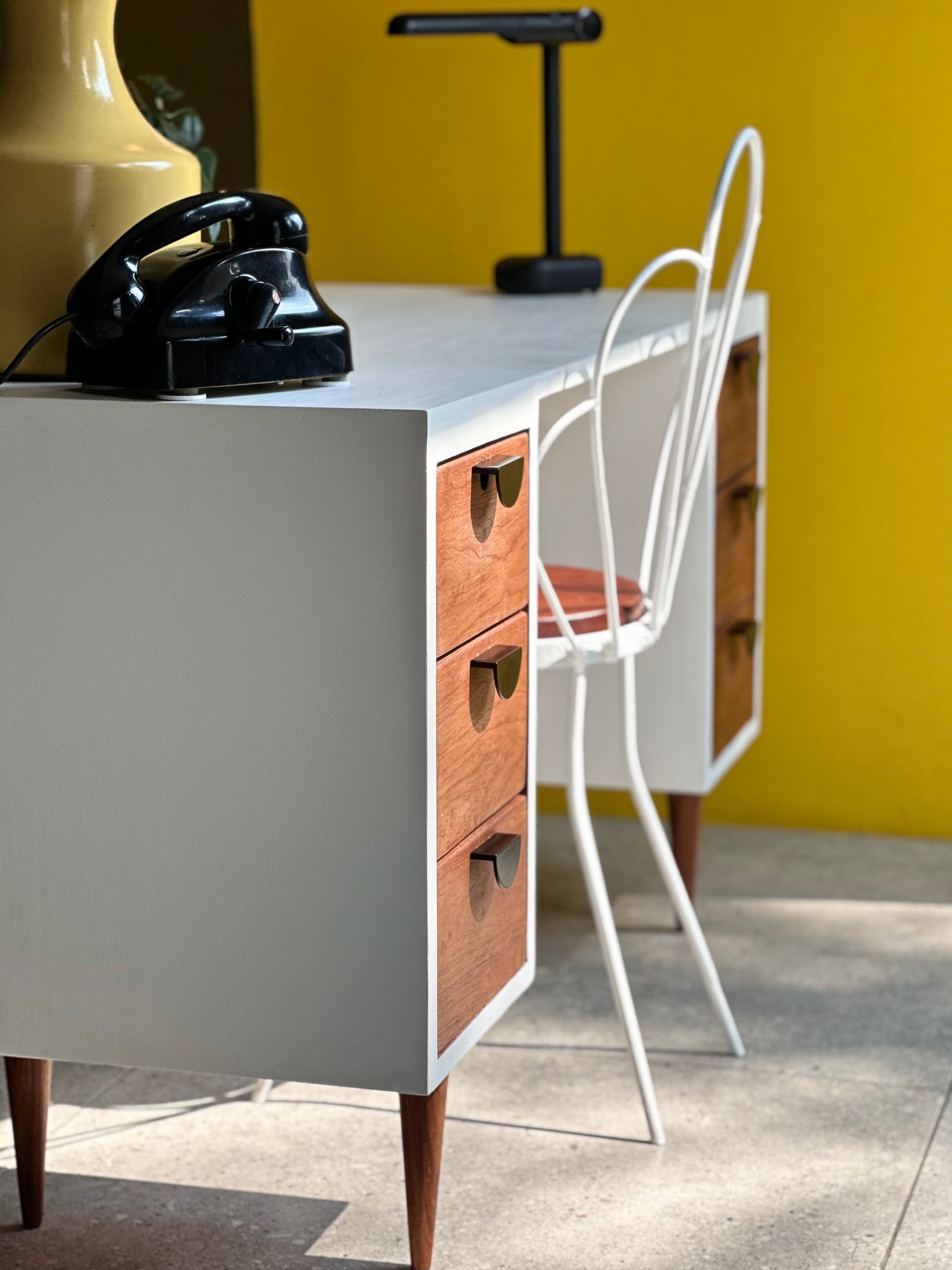 A once timeworn piece thoughtfully revived, this reimagined mid-century desk now carries a crisp, modern edge while honouring its original character. After stripping the unit, the timber framework revealed some damage to the wood, prompting a full transformation: the body is now finished in a durable off-white coating, professionally sealed for longevity and easy care.