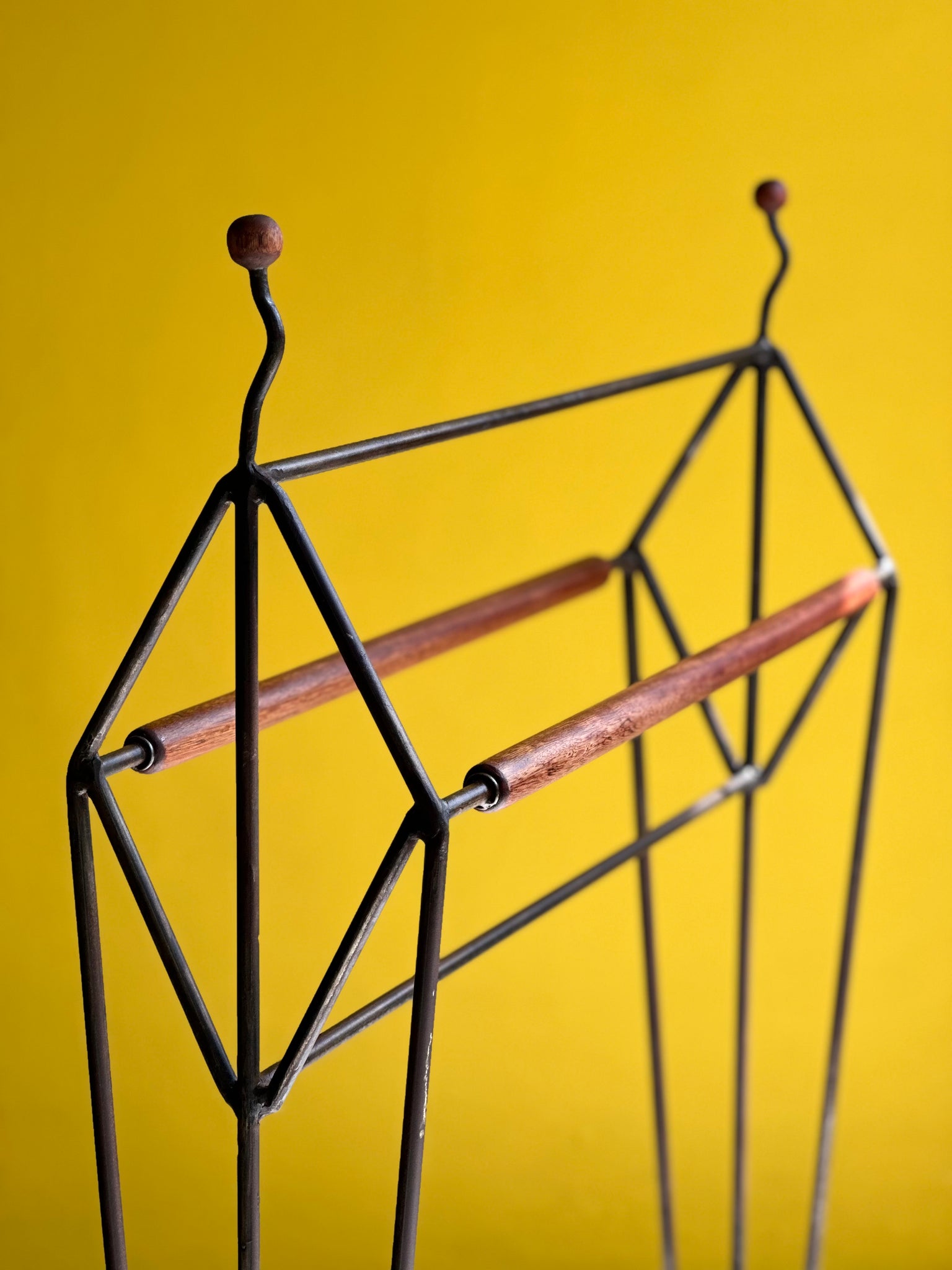 This towel rail brings together simplicity and expressive sculptural lines. Crafted from slender steel formed into angular, geometric shapes, the frame has a light, architectural presence that feels both functional and artistic. The subtle curves at the top are capped with rounded wooden finials, giving the piece a soft, crafted touch against its crisp silhouette.