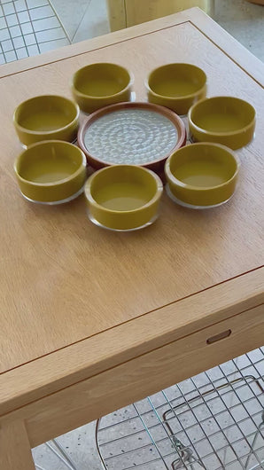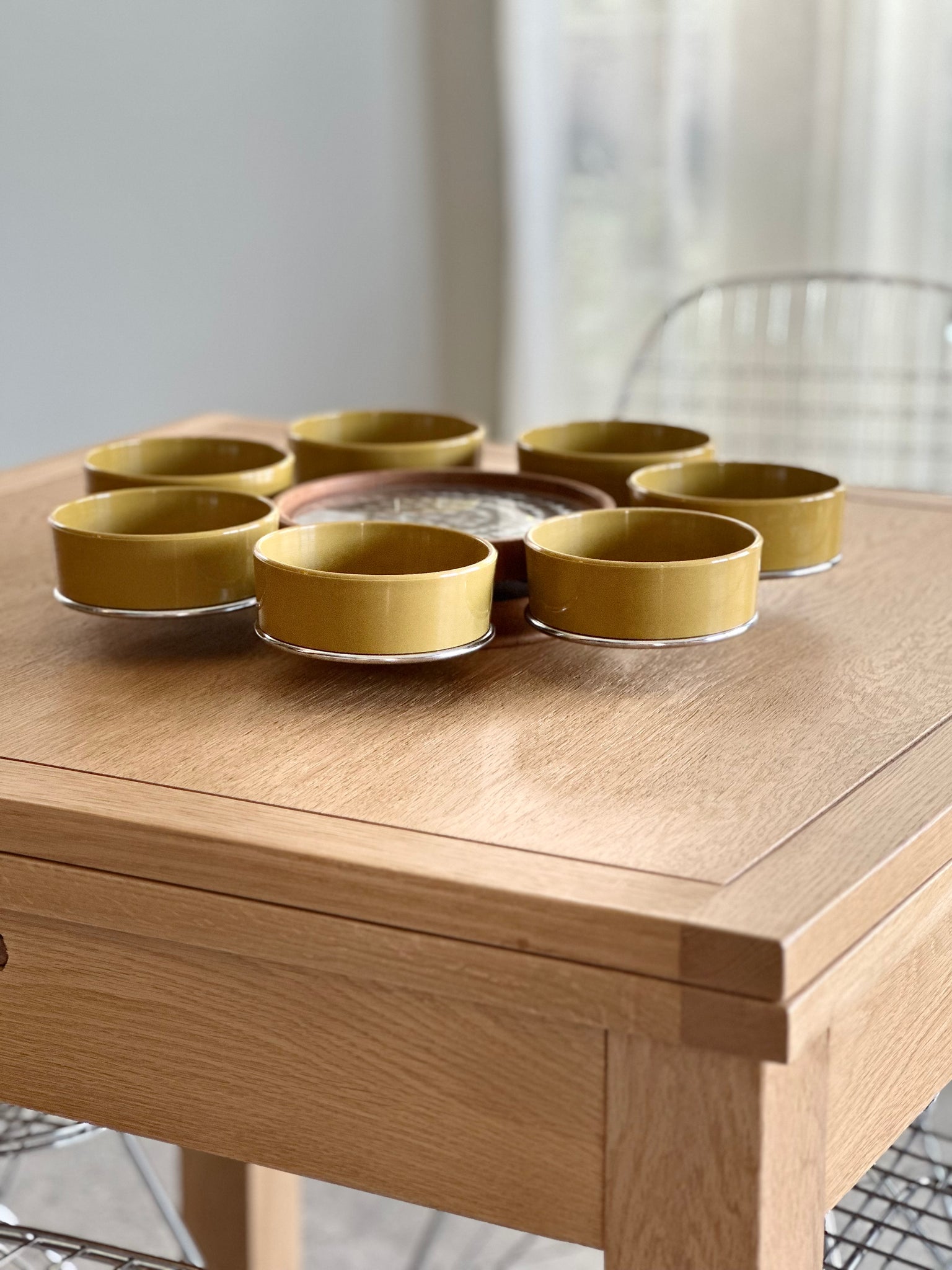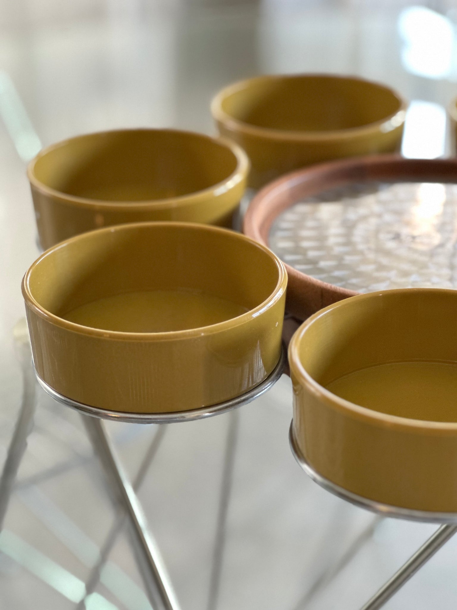 Perfect for serving snacks, dips, or condiments, this set combines the warmth of natural wood, the sleekness of chrome, and the playful vibrancy of mid-century melamine design.