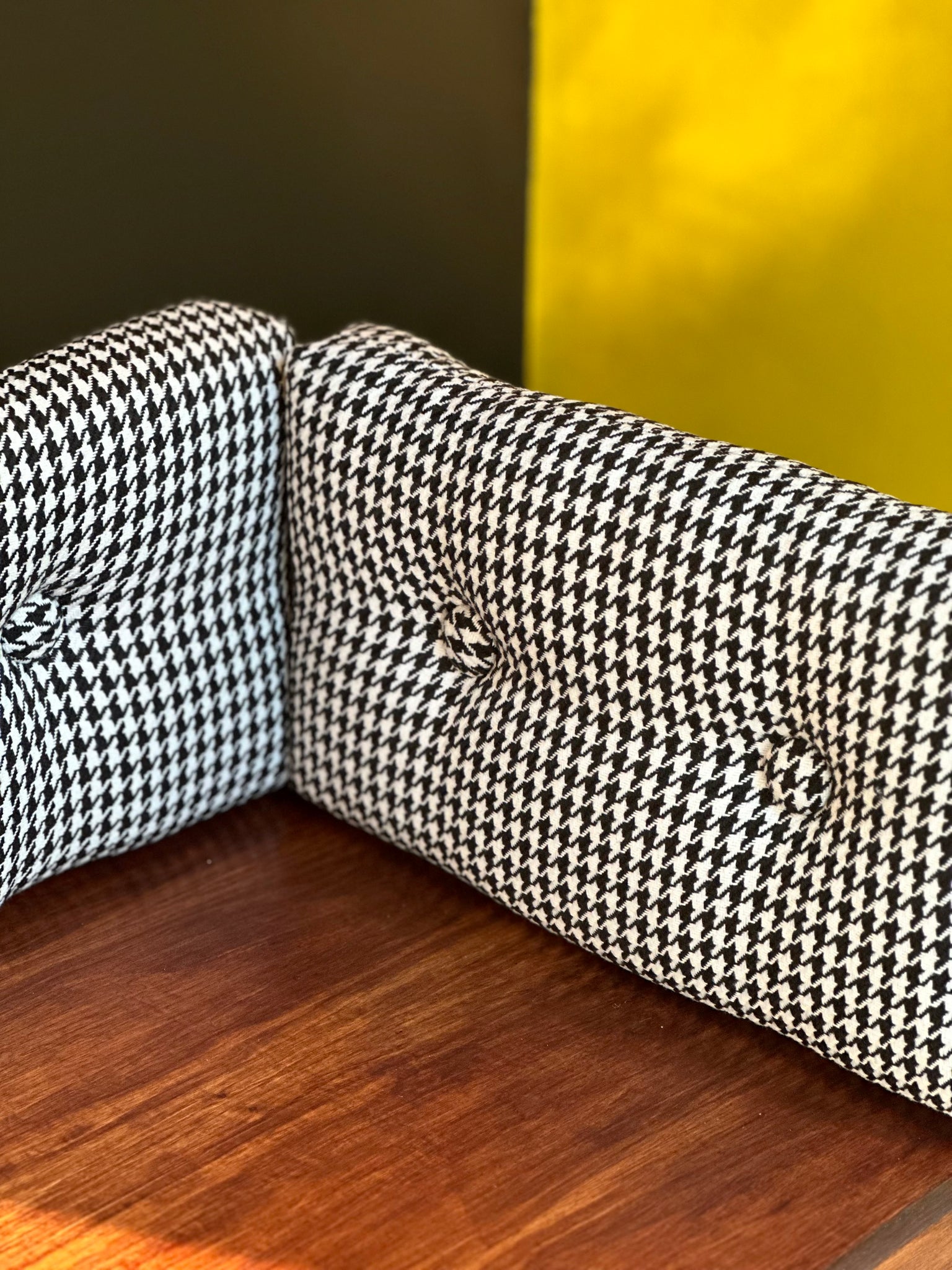 The original back cushions have been re-upholstered and finished in a crisp black-and-white houndstooth fabric, giving the piece a tailored retro edge while keeping true to its mid-century spirit. Forming a comfortable little nook, ideal for slipping on shoes, taking calls, or pausing in an entryway or hallway.