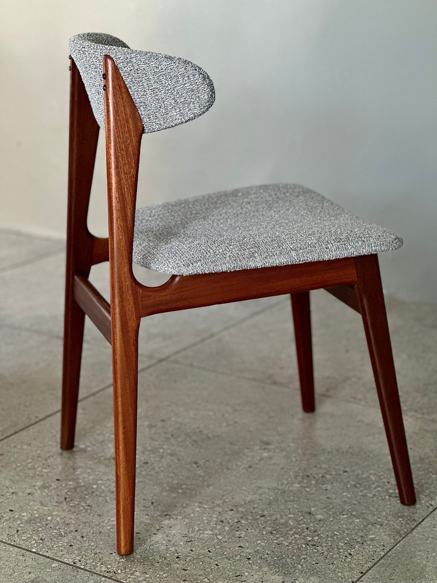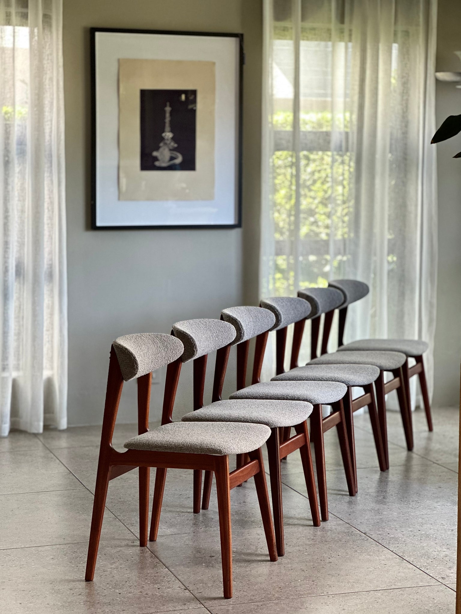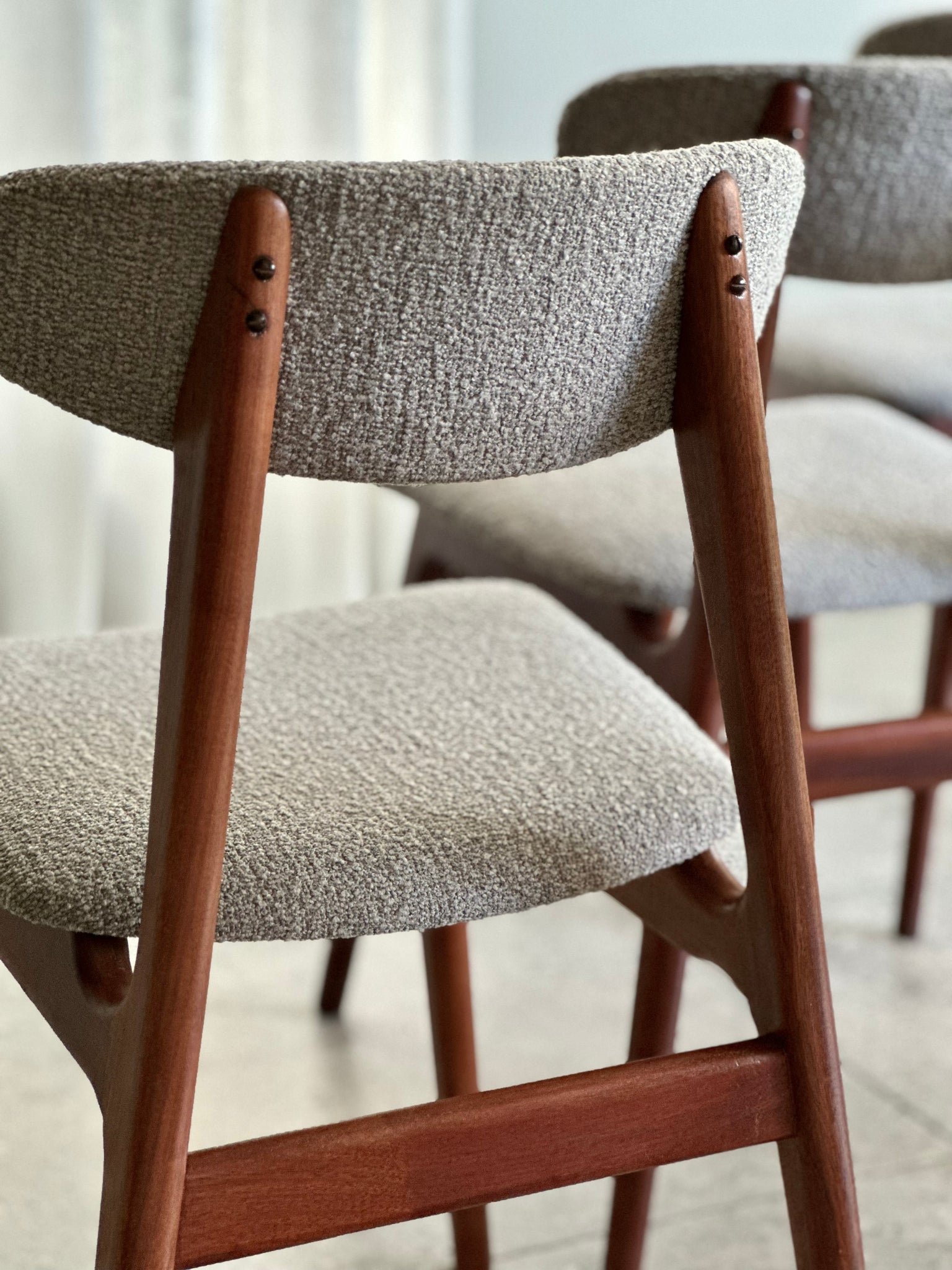 This exquisite set of Danish-inspired dining chairs embodies the signature design and craftsmanship of mid-century furniture. The style is strongly reminiscent of Frystark — one of the leading manufacturers in the country during the 1960s, renowned for their refined aesthetic and exceptional quality