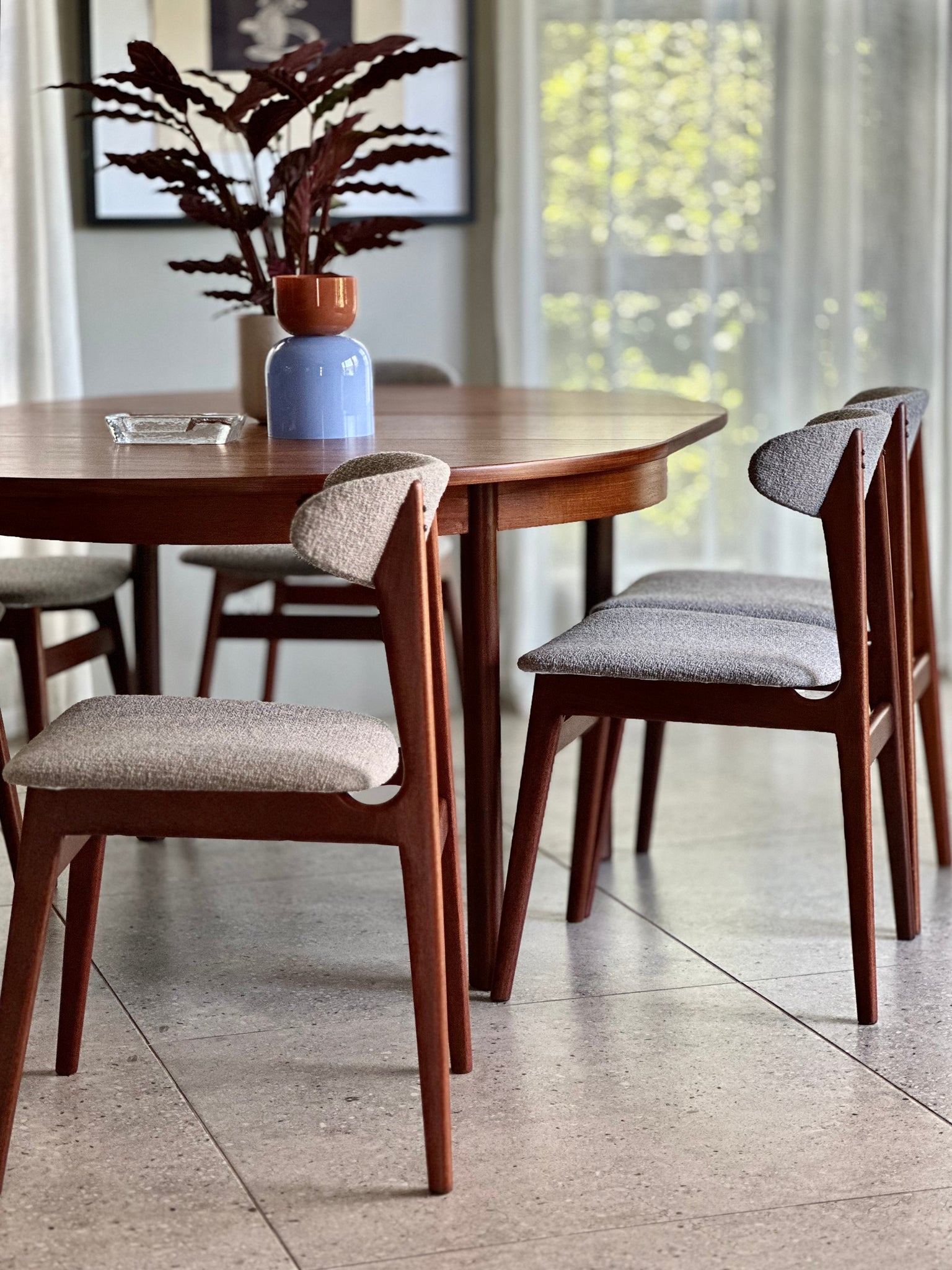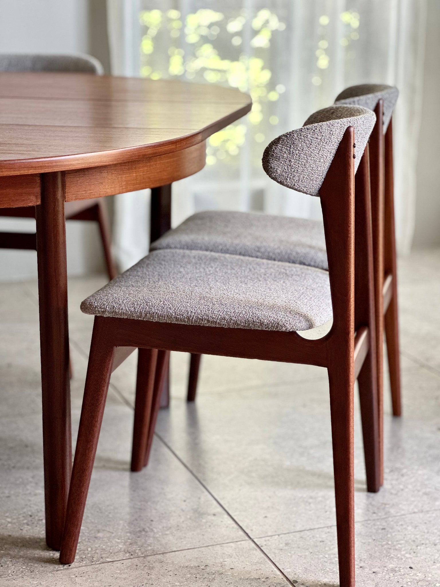 The seats and backrests have been newly upholstered in a beautifully textured grey Hertex fabric, lending a contemporary edge while respecting the classic design.