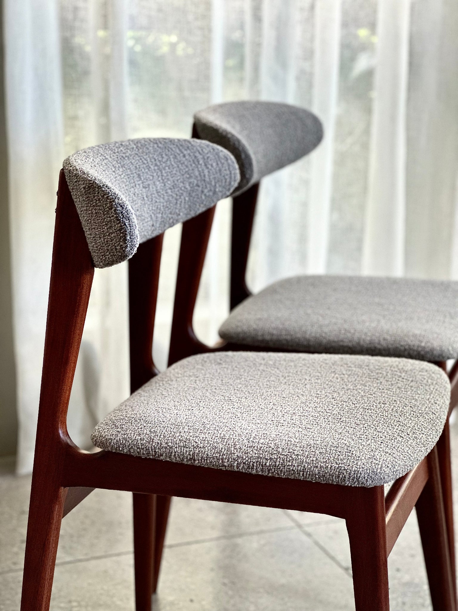 These chairs feature distinctive kidney-shaped backrests and elegantly splayed legs, offering both comfort and visual appeal. Each chair has been restored and refinished to bring out the rich grain and warmth of the mahogany wood.