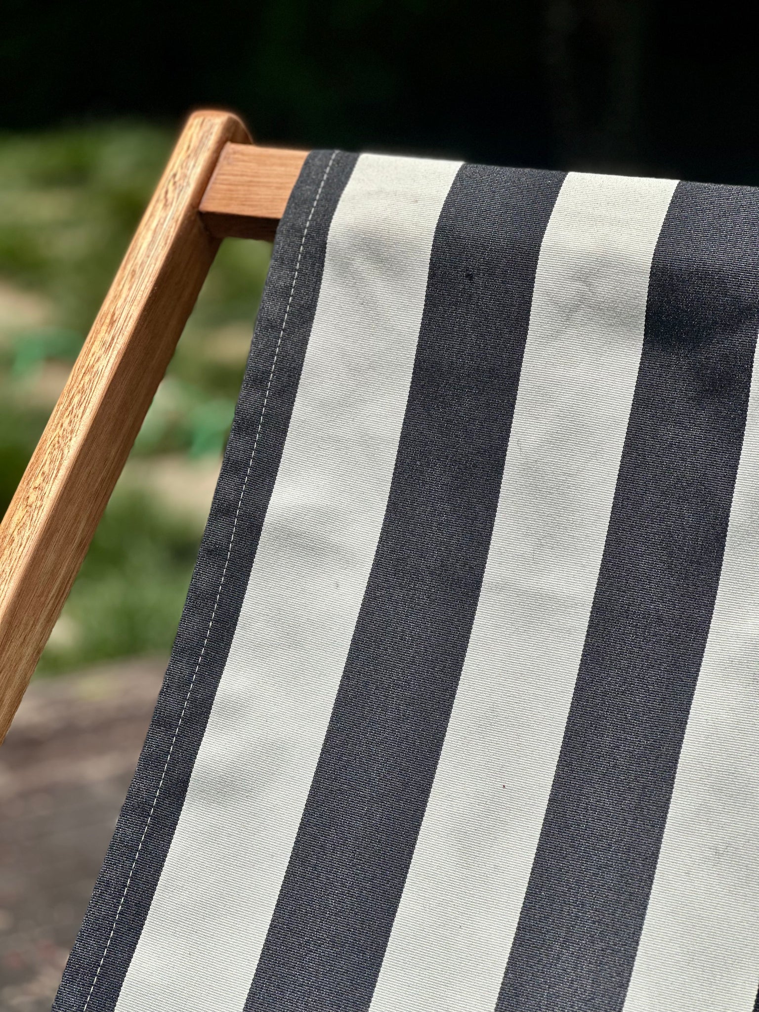 A timeless classic. A set of three adjustable, folding deck chairs, with a single strip of canvas-style fabric forming the backrest and seat.