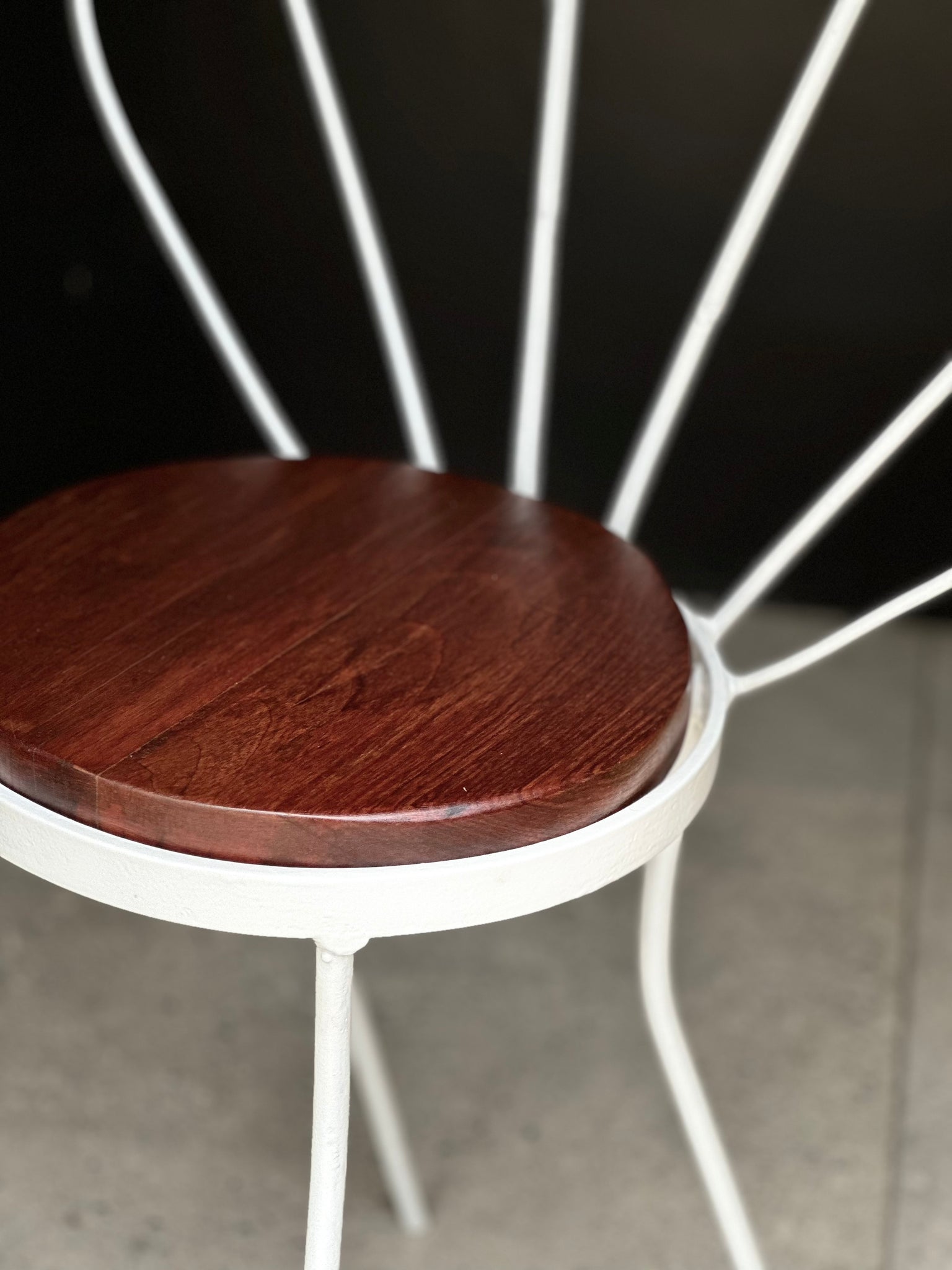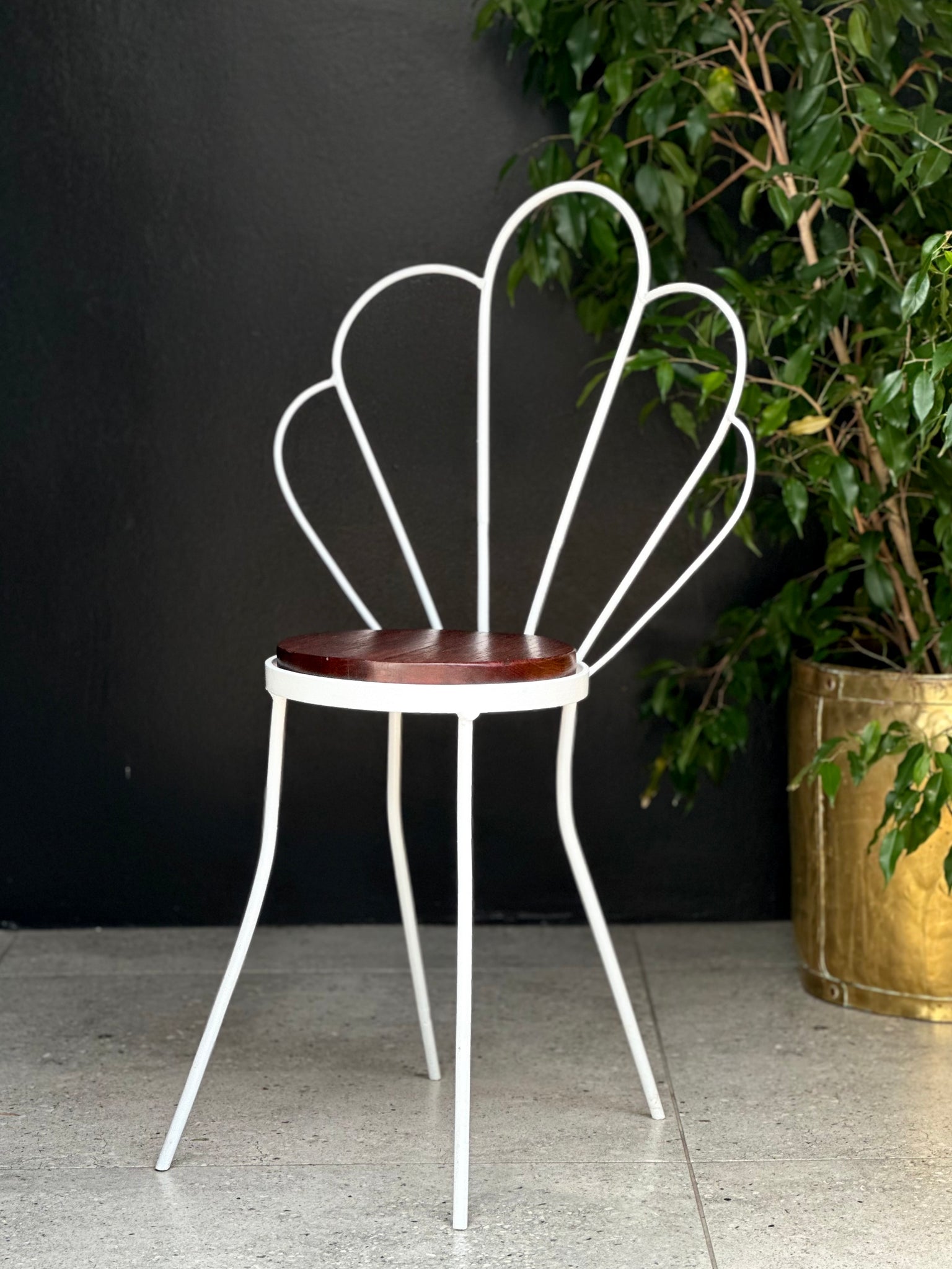The frame is formed from curved steel, creating a petal-like backrest that feels light and airy while still offering support. The seat has been newly finished with a smooth wooden top, bringing a natural contrast to the crisp white frame.