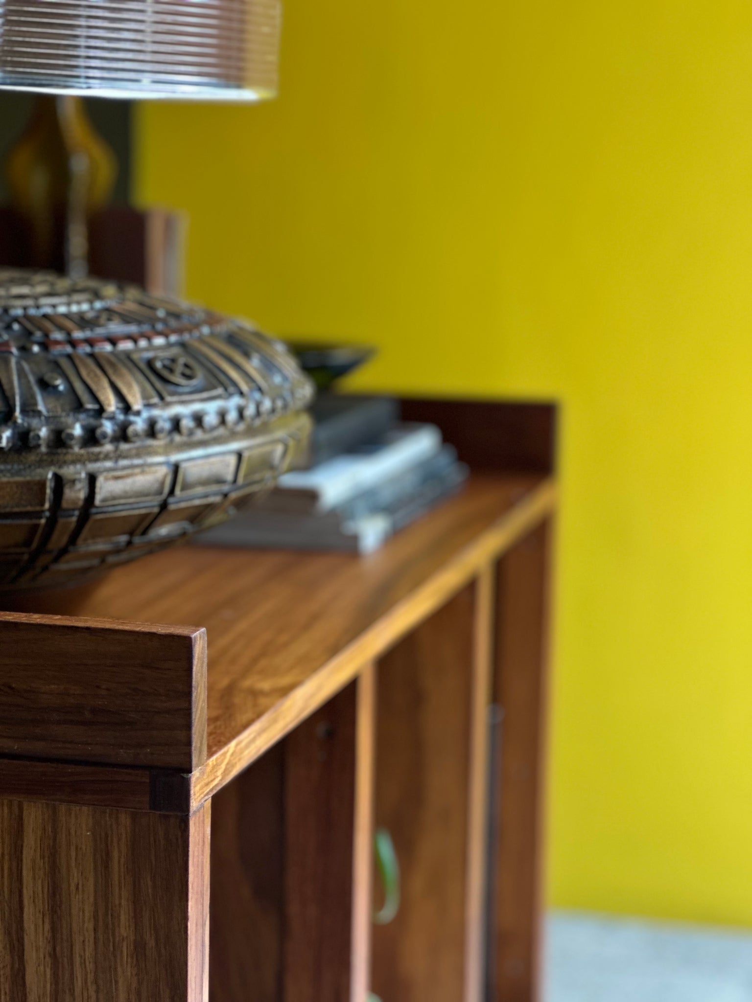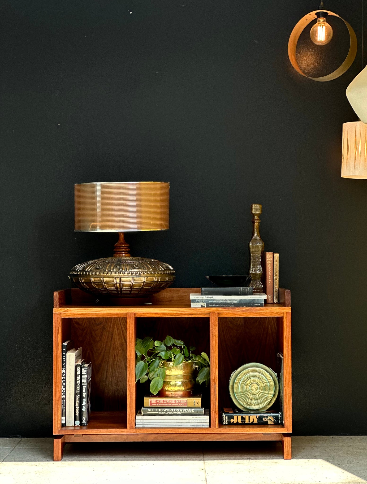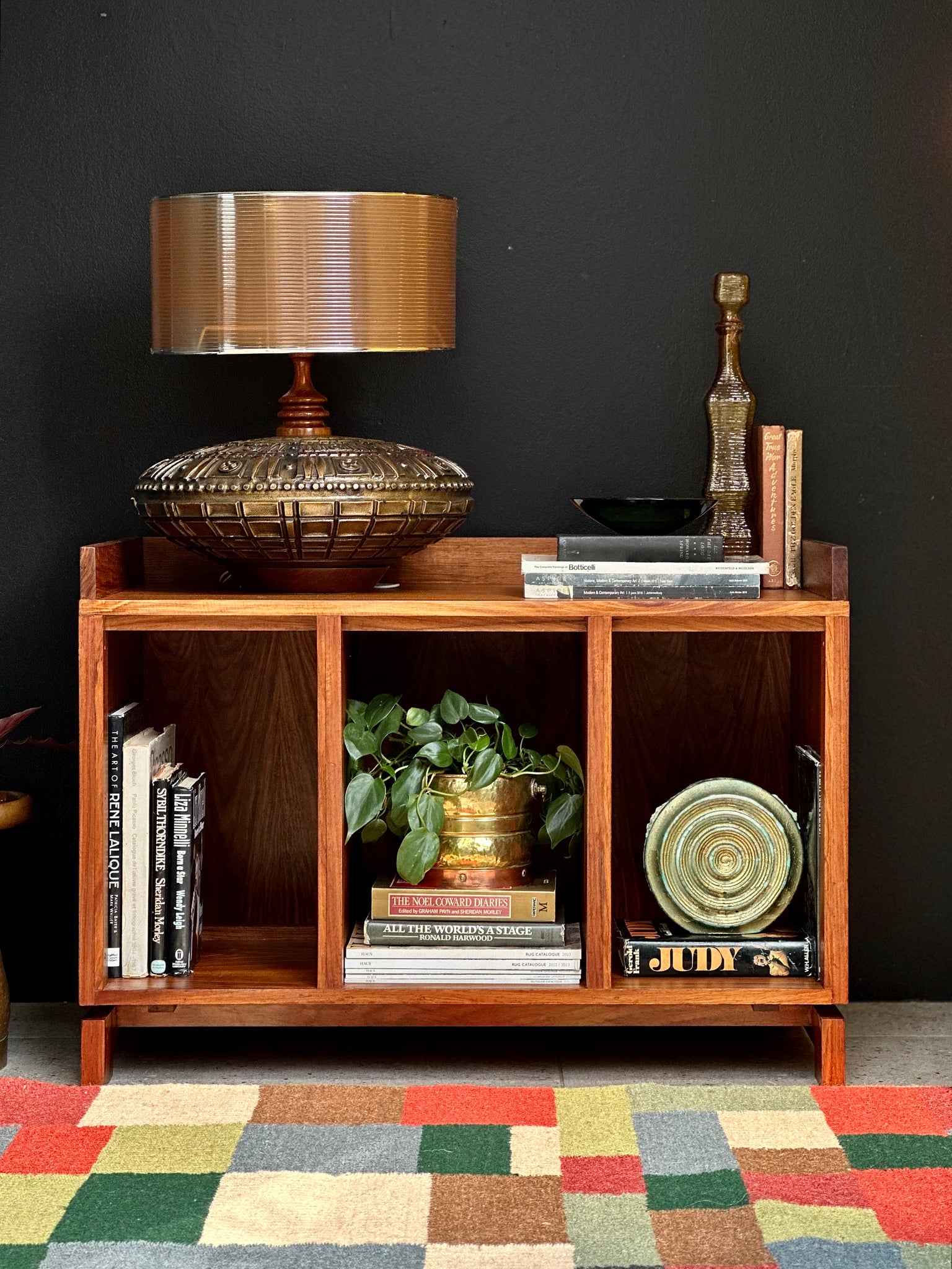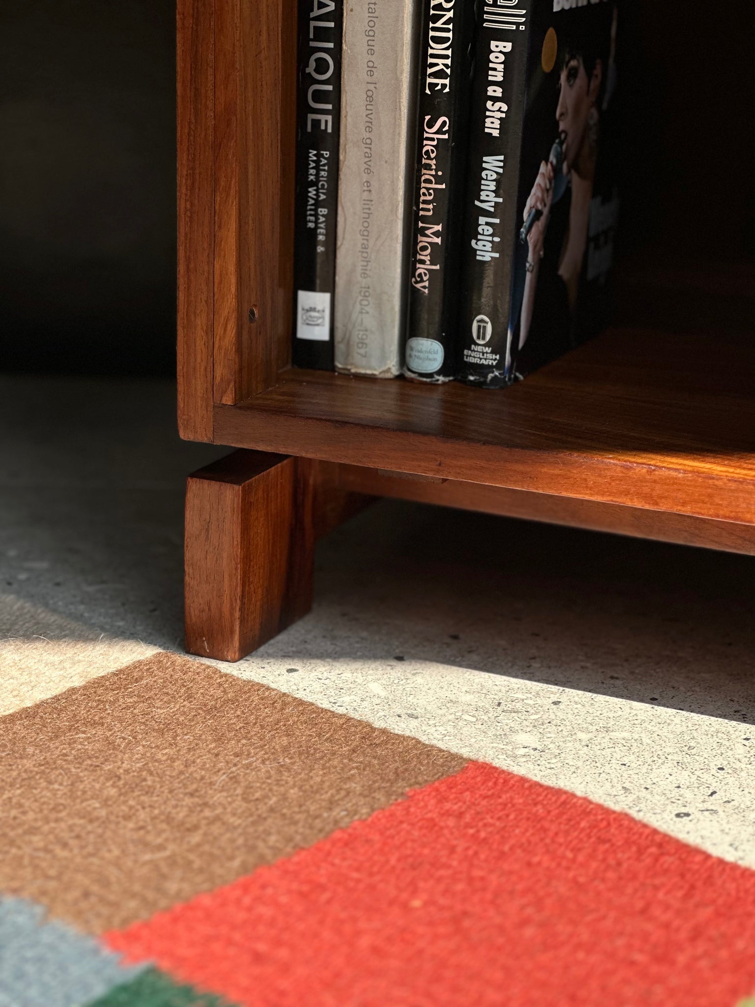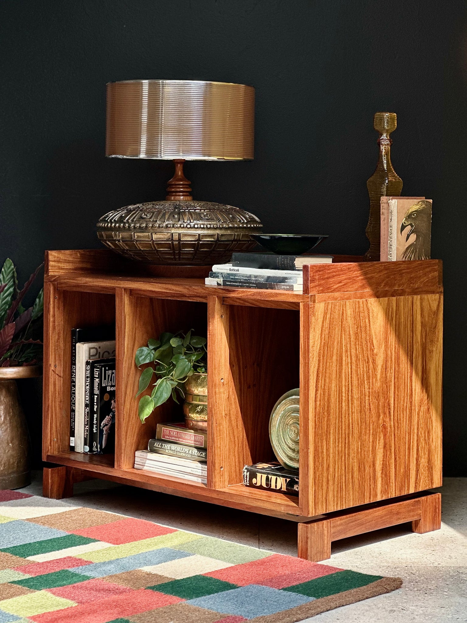 A beautifully crafted media cabinet in Kiaat, showcasing the warm grain, depth and natural movement. Compact yet full of presence, the piece offers three open compartments ideal for books, vinyl, media, or curated display objects.
