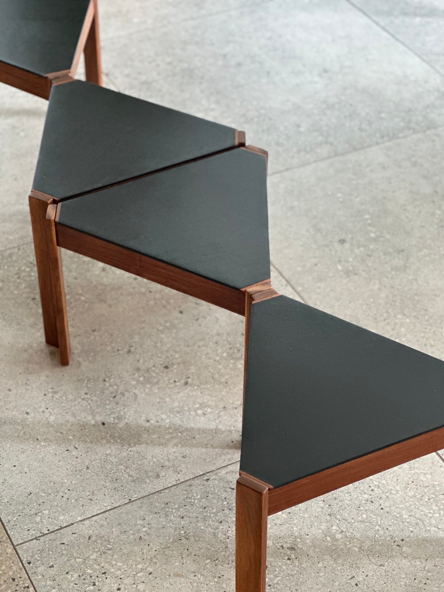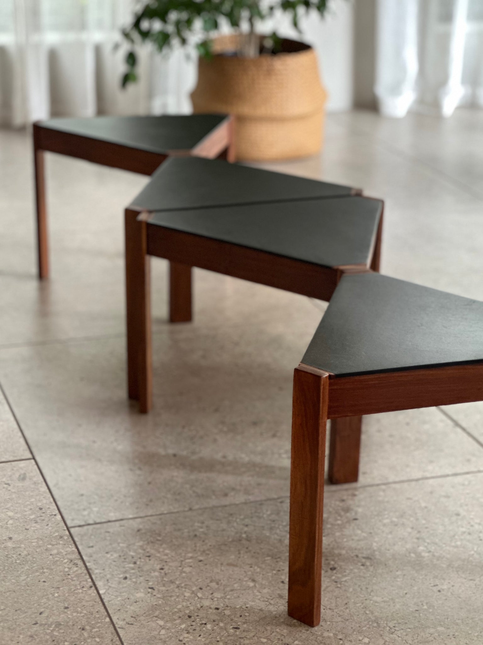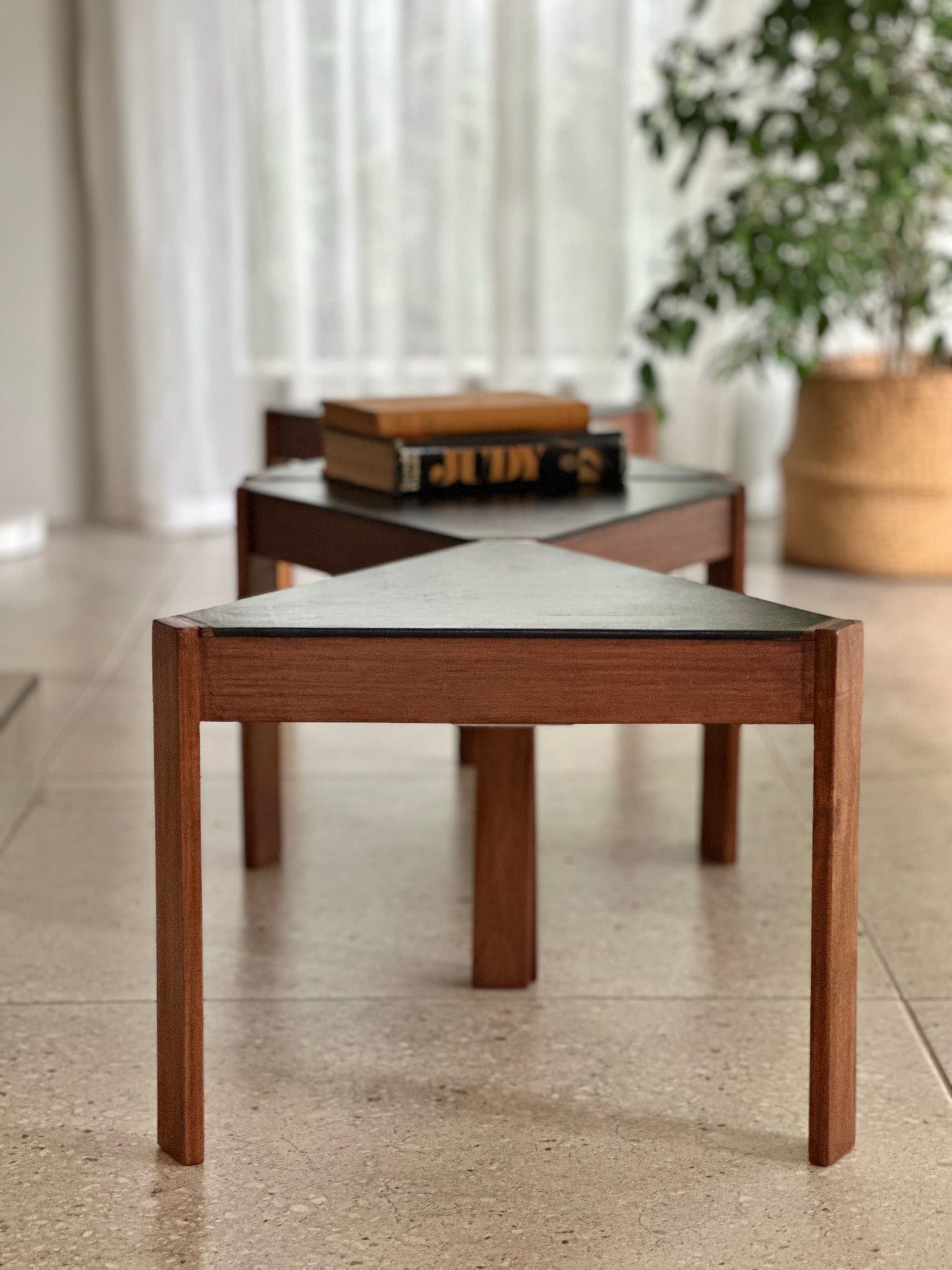 The sets of tables are the same size and can be conveniently stacked together, so they take up less space when not in use. The frame of each table is made of solid Kiaat wood with an organic triangle shape. The table tops were stained black to compliment the warm grain of the Kiaat frame Originally, it seems they were coated in green.