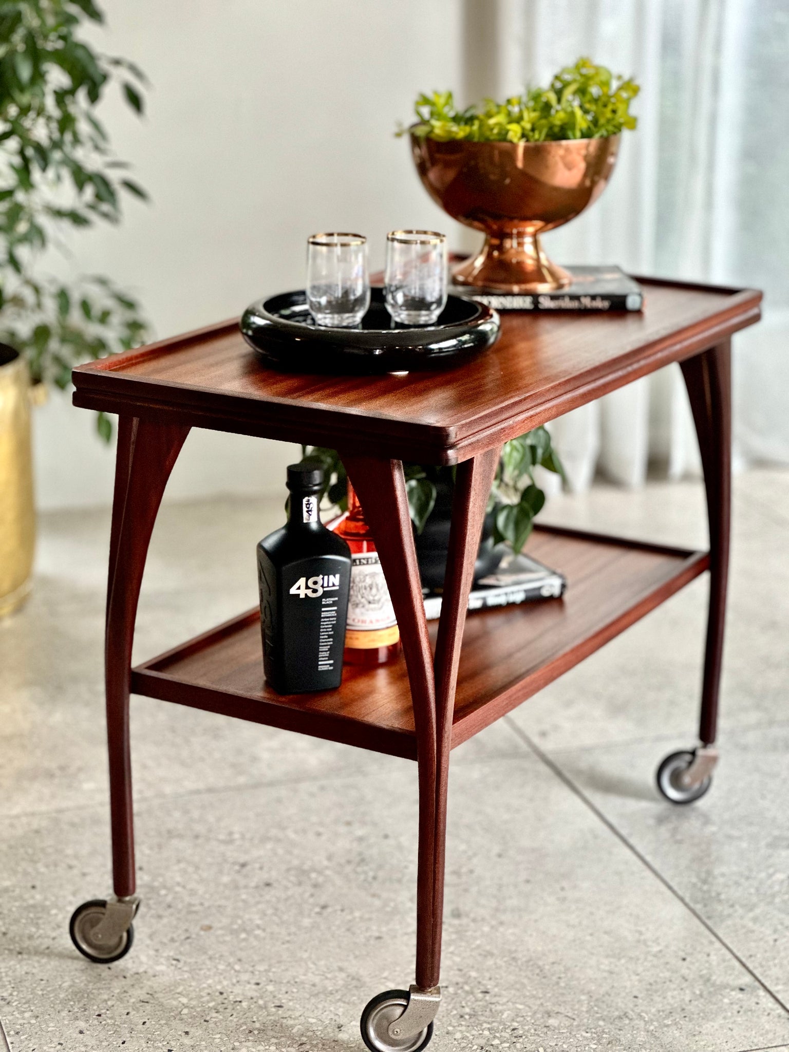 The mahogany has been completely restored, carefully cleaned, refinished, and sealed to enhance the natural grain while ensuring durability for everyday use. The trolley retains its original castor wheels, which move smoothly and allow for easy repositioning without compromising the integrity or authenticity of the piece.