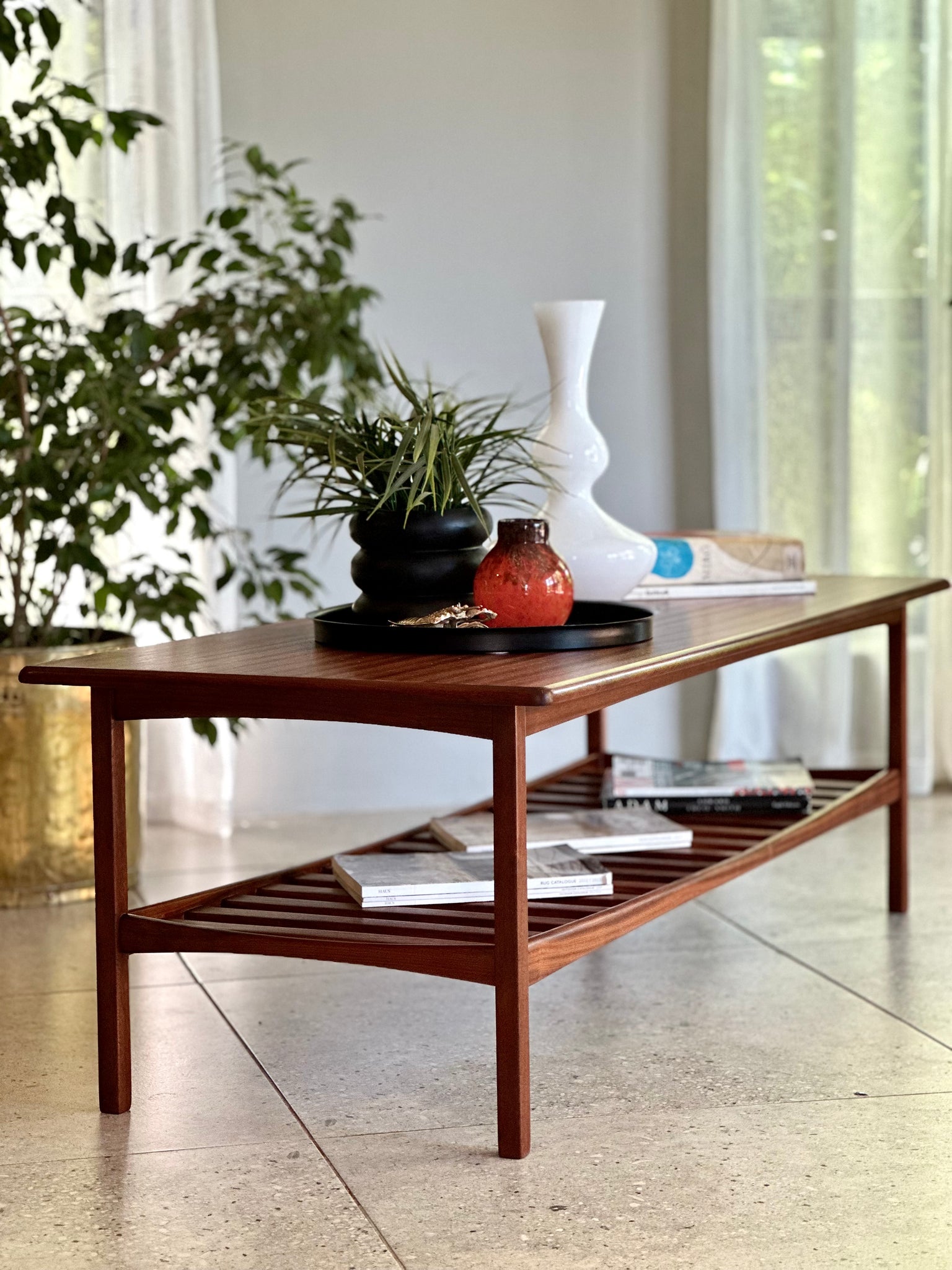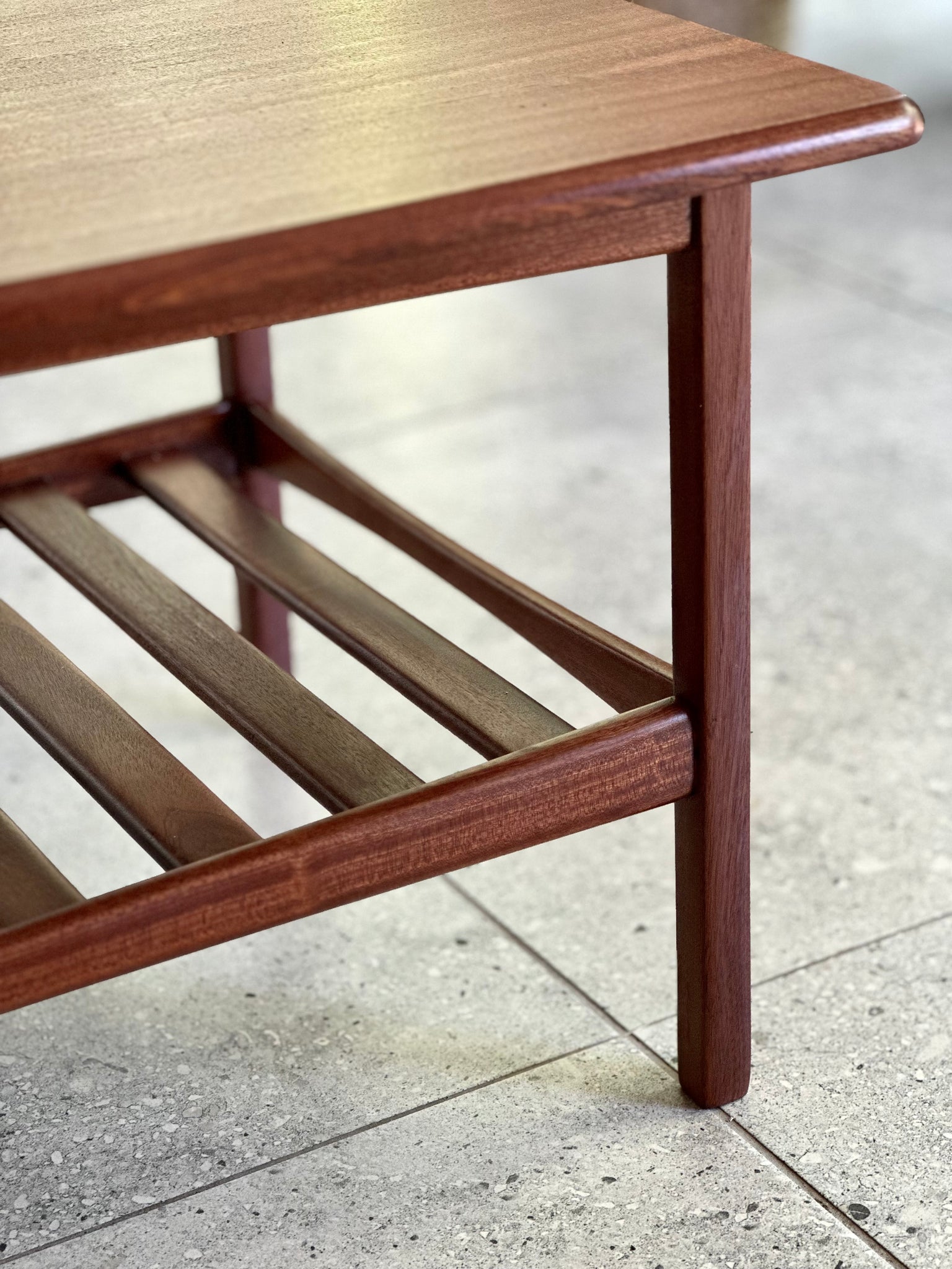 The lower slatted shelf provides ample space for magazines or décor, while the refined tapered legs and softly beveled edges reflect the quiet sophistication typical of Vorster’s 1960s production.