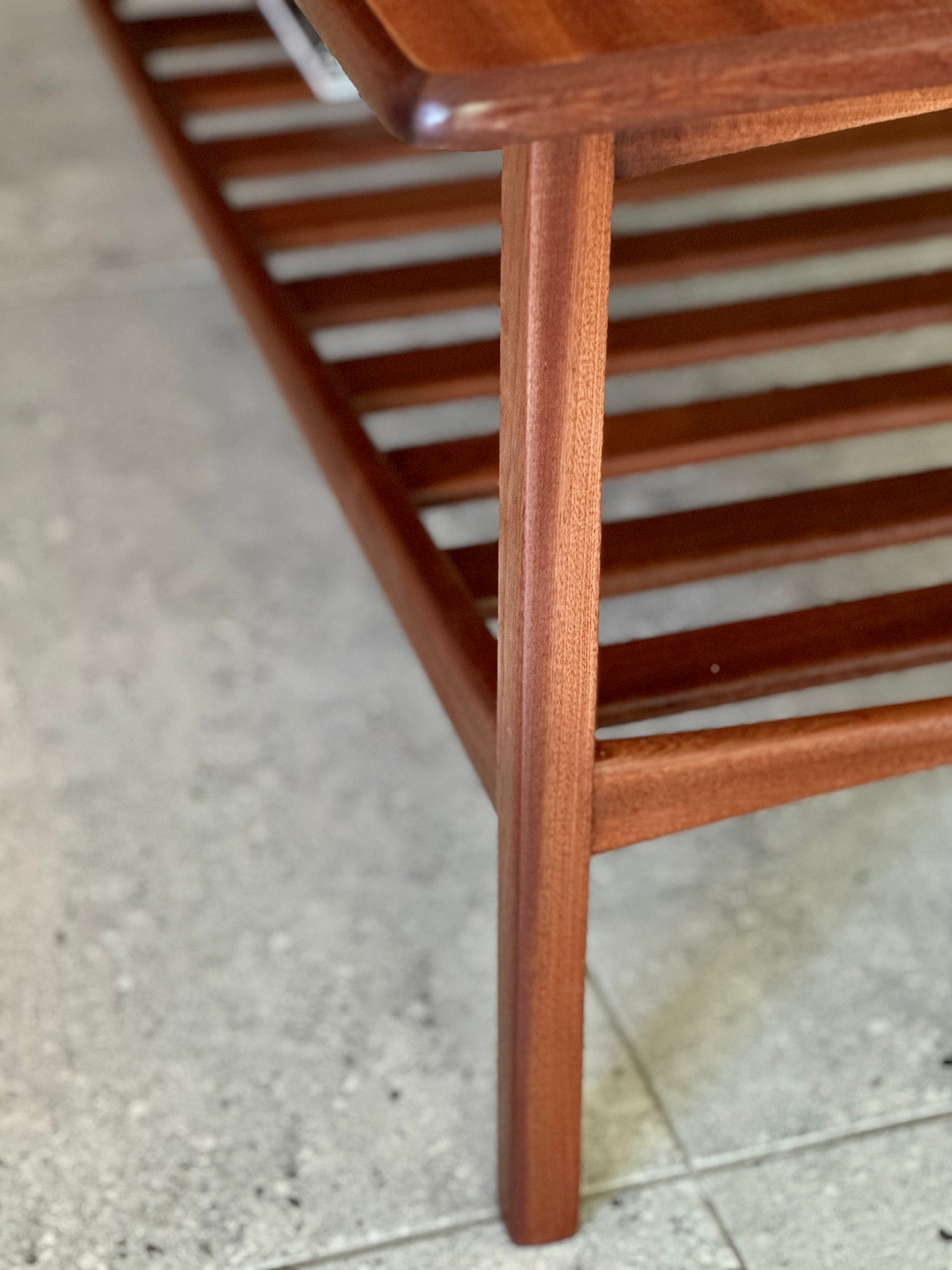 This piece has been fully restored and the top professionally re-veneered in richly toned Sapele Mahogany, revealing a deep ribbon grain and satin finish that highlights the clean geometry of the design. The table’s two-tier structure offers both elegance and utility.