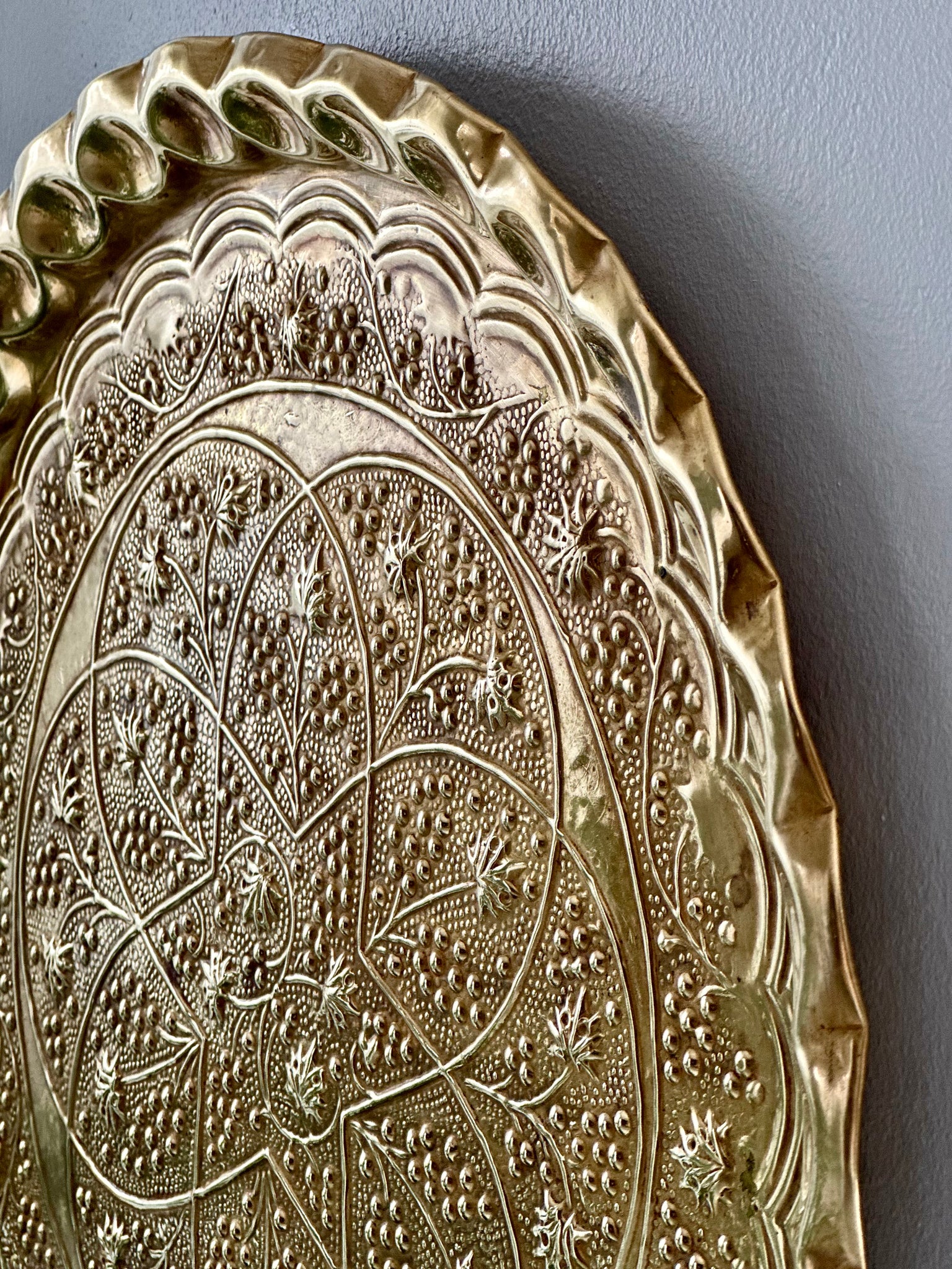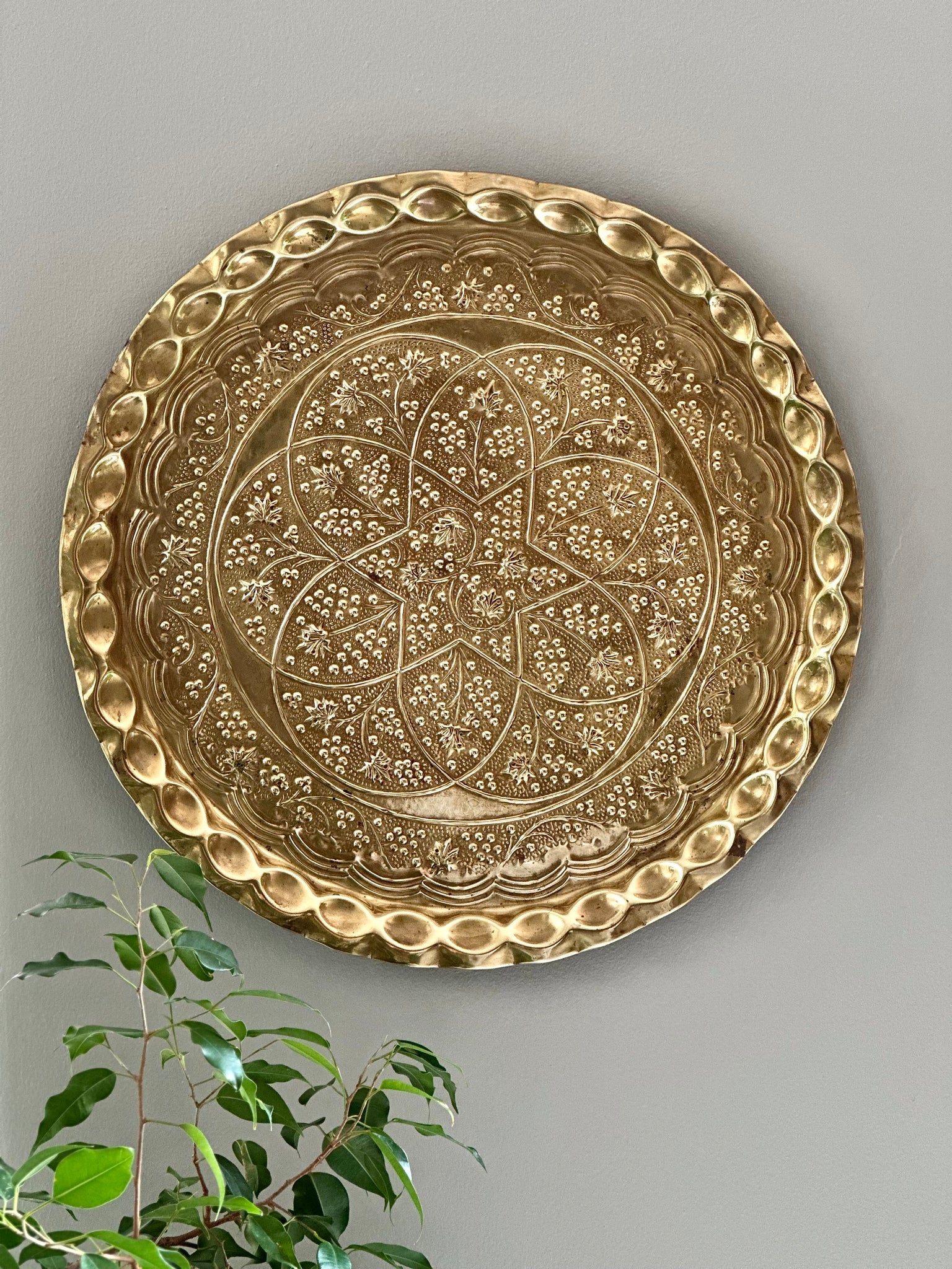A beautifully detailed vintage brass tray featuring intricate, hand-tooled relief work arranged in a radiating, mandala-like pattern. Each segment is filled with clusters of tiny raised dots and stylised floral motifs, creating a richly textured surface that catches the light beautifully. The scalloped rim, with its repeating pressed oval design, adds depth and a sense of craftsmanship.
