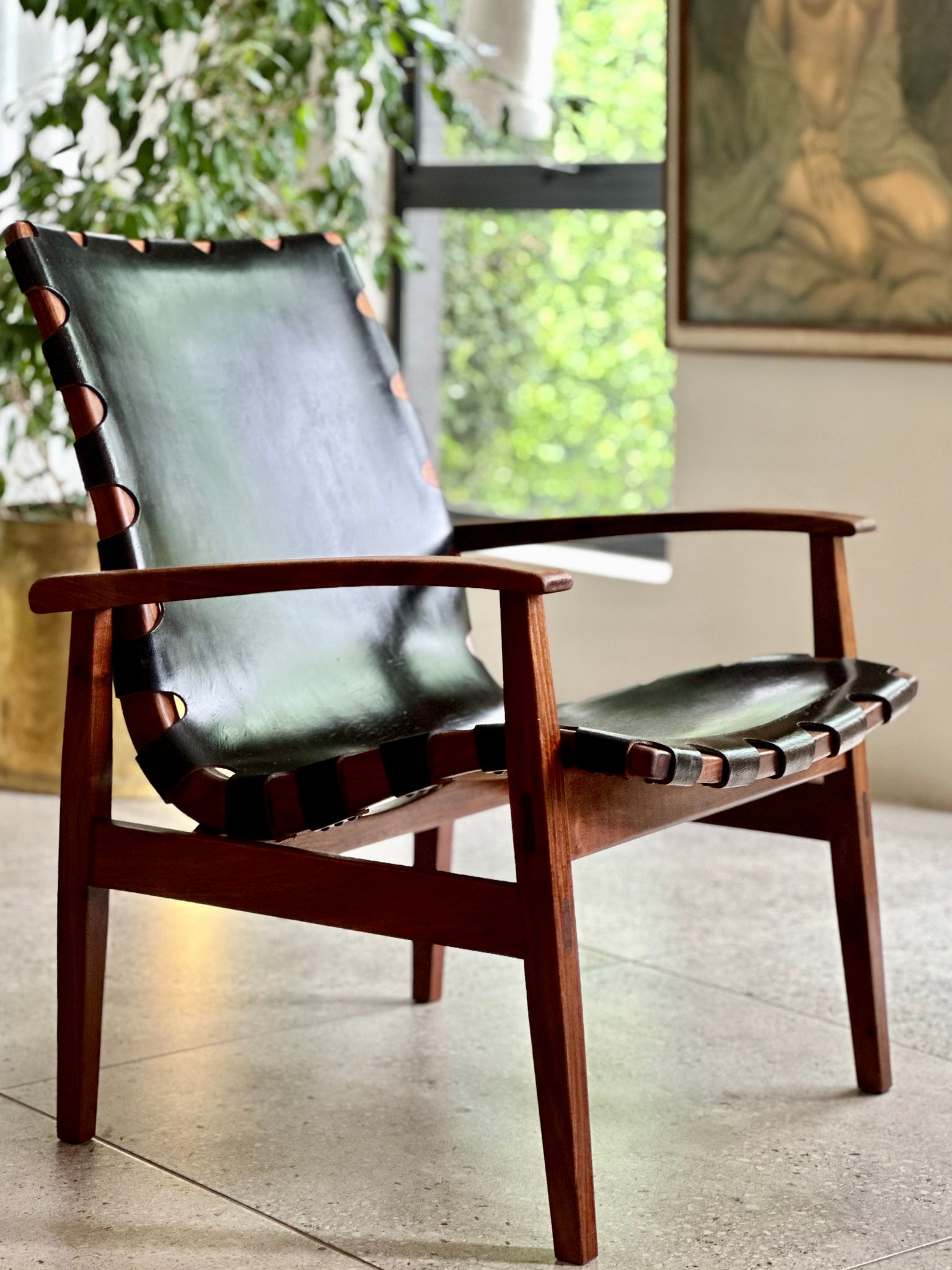 Vintage and in good structural condition. The wood frame has been refreshed. The leather retains its original character with age-related wear and patina consistent with natural aging, such as surface lines/creases/grazing, etc. Cleaned and conditioned.