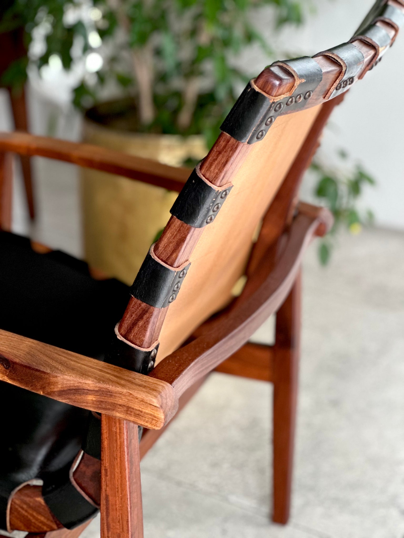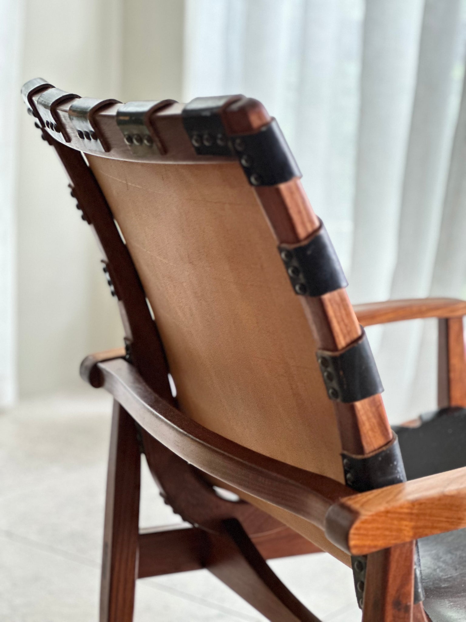 The seat and backrest are made from a single continuous piece of thick black leather that wraps around the frame and is secured with rivet detail. The leather has developed a beautiful patina through time — including natural age-related markings and surface creases. These are not faults, but a desirable testament to the chair’s life and authenticity, adding warmth, softness, and that classic established vintage feel.