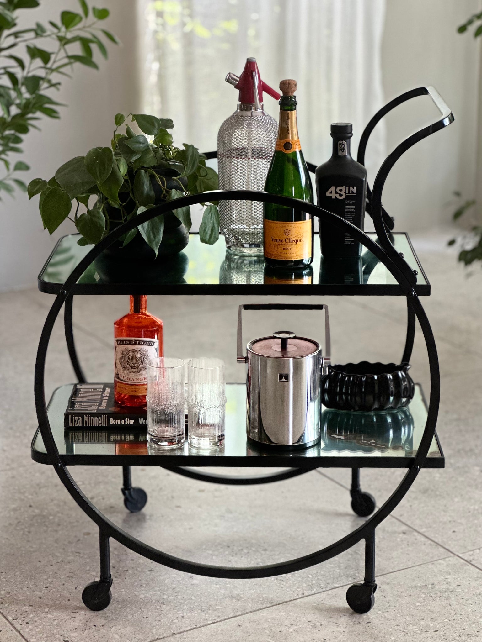 A striking circular drinks trolley with a sculptural presence.