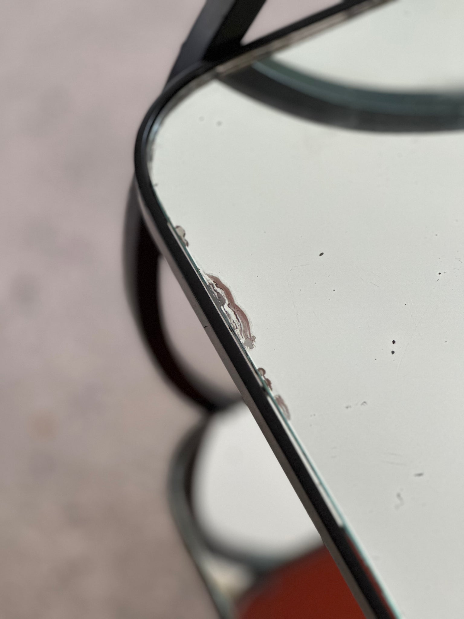 Originally finished in steel, this vintage piece has been resprayed black, giving it a bold, contemporary edge while retaining its classic mid-century silhouette. The dramatic twin-ring frame supports two original mirrored tiers, each adding light and reflection to the design.