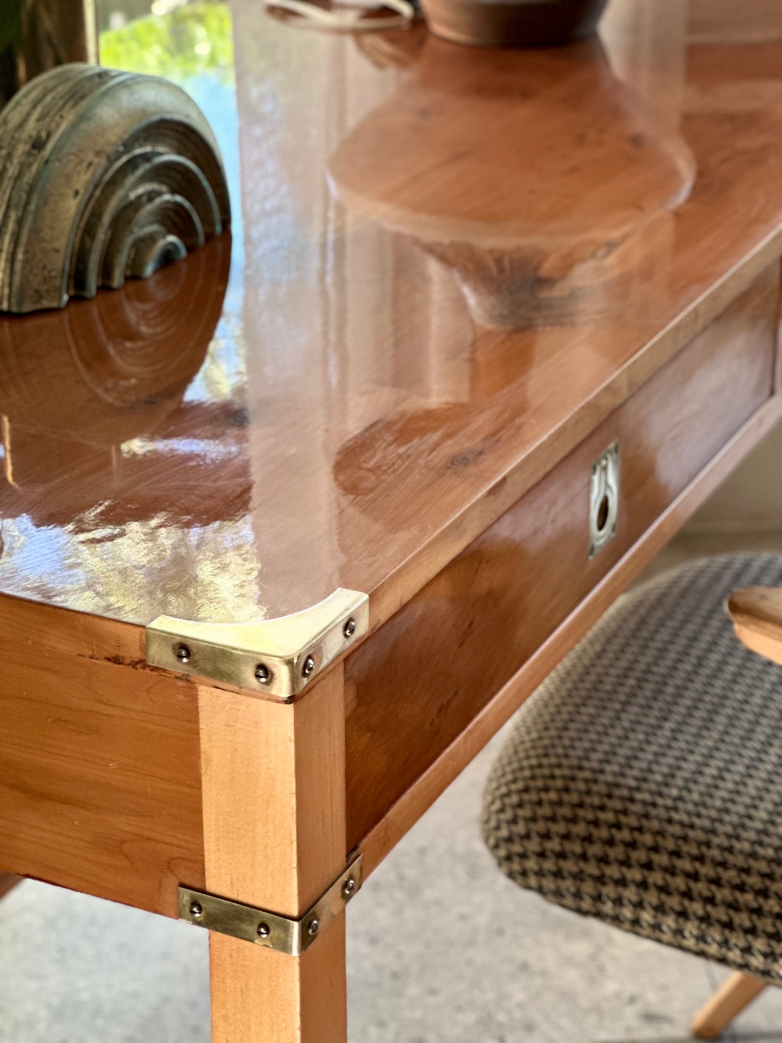 A rare Campaign-style Vintage piece with a beautiful burl-like woodgrain & lacquered finish. Elegant & clean design lines. It consists of 2 drawers with gorgeous brass handles and brass ends on all the corners. This piece is great for a study, office, hobby room, retail space, or bedroom.