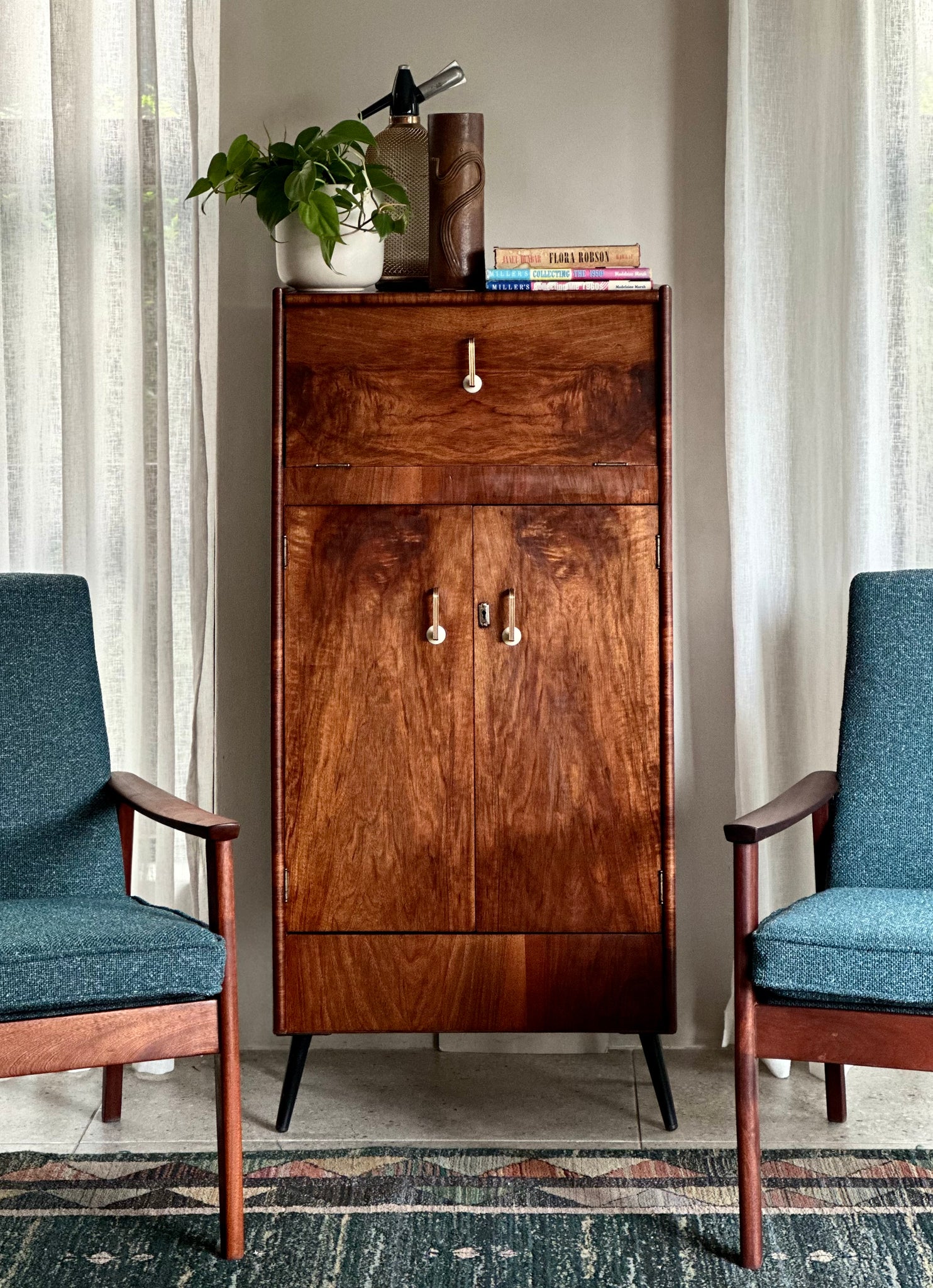 It includes a drop-fronted, mirrored drinks serving area, shelved storage behind symmetrical cabinet doors with storage for taller bottles etc. The original flap-stay hinge allows for simultaneous lifting of the top when the drop-down door is opened, ensuring easy access to drinks.