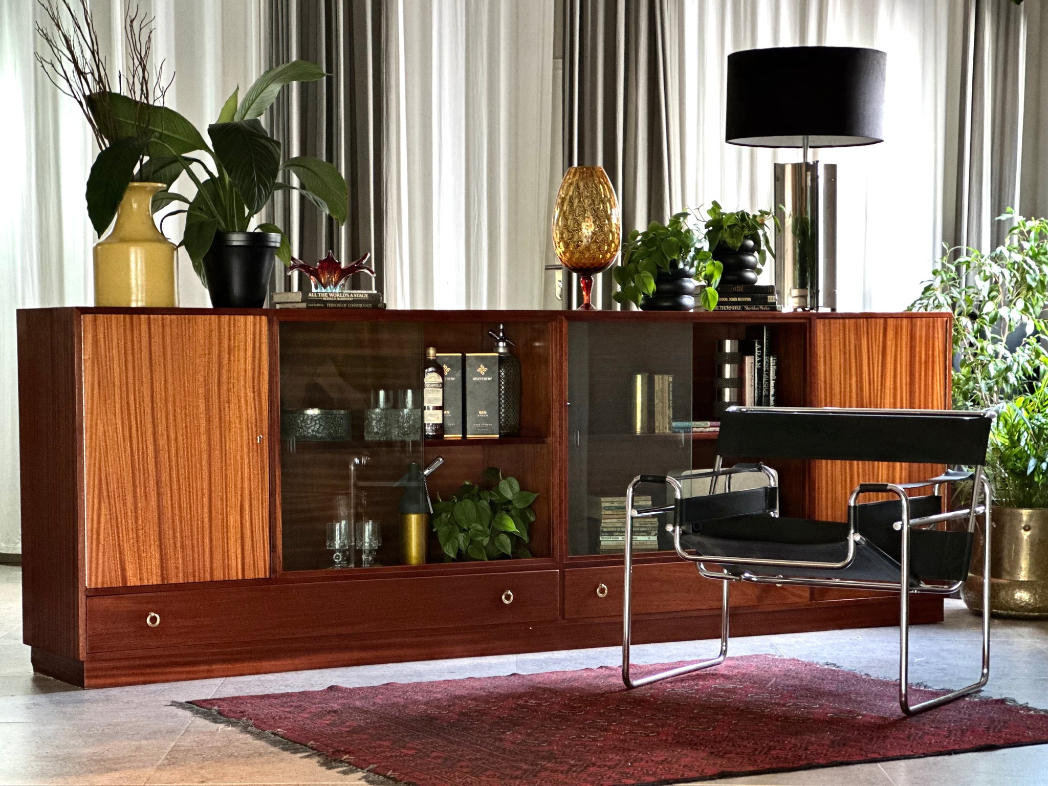 Sleek in its design, Its symmetrical shelved spaces encased by glass sliding doors not only provide ample storage but also allow for easy visibility of the items within. The addition of cabinet doors revealing shelved spaces and three deeper bottom drawers makes this piece super functional.