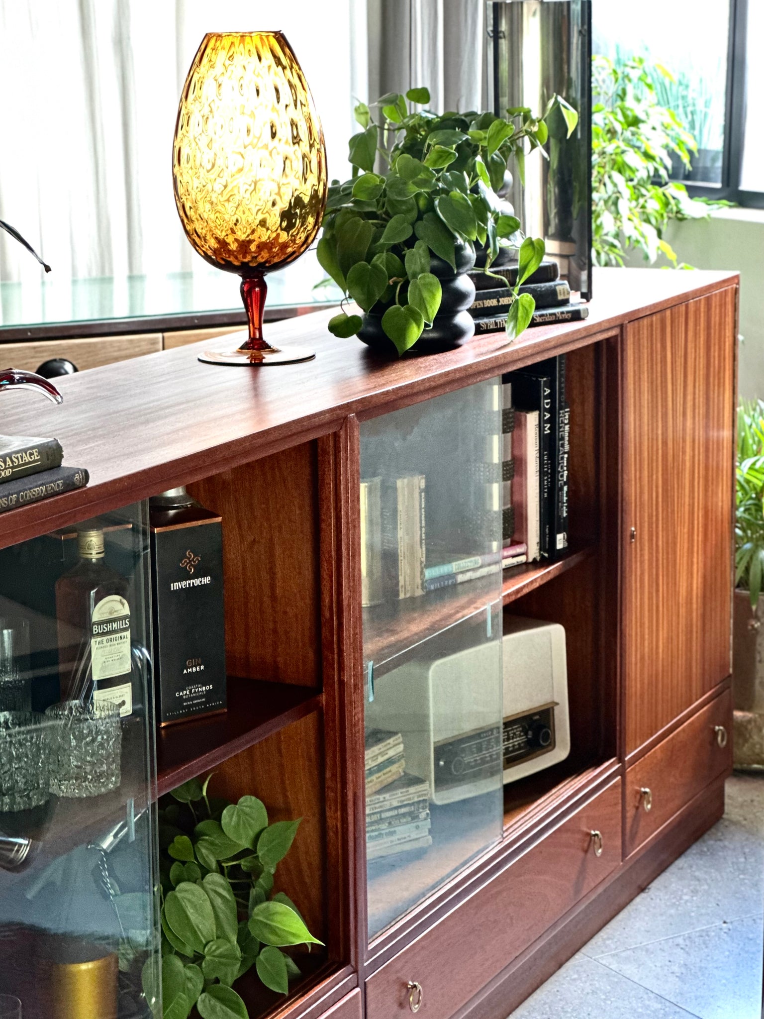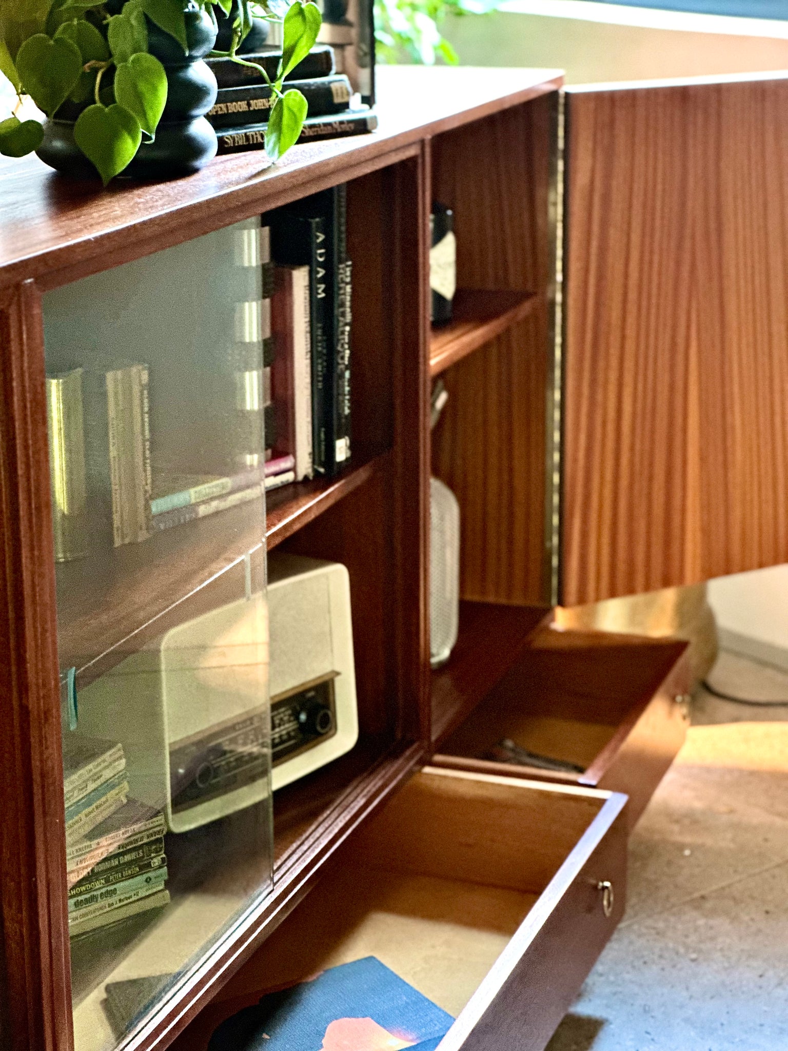 The wood has been fully restored and sealed and the glass sliding doors have been cleaned.