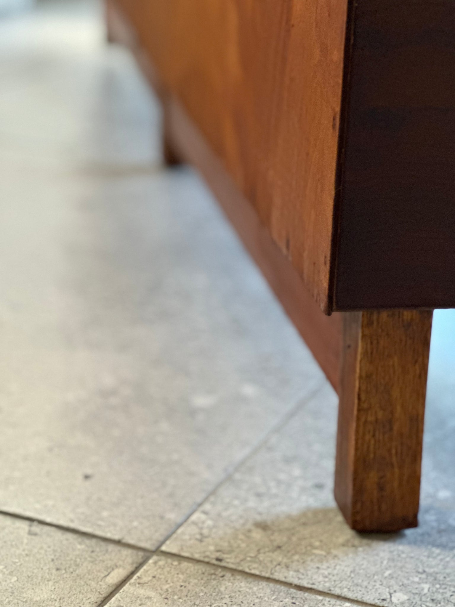 The wood has been refurbished and new steel legs added to the front facade. Besides a mark or two on the very top due to age and use this piece is in overall good condition.