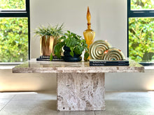 This stunning travertine coffee table with brass inlay on the top exemplifies modernist design with its clean, simple lines and timeless aesthetic. Versatile to use indoor or on under a covered veranda.